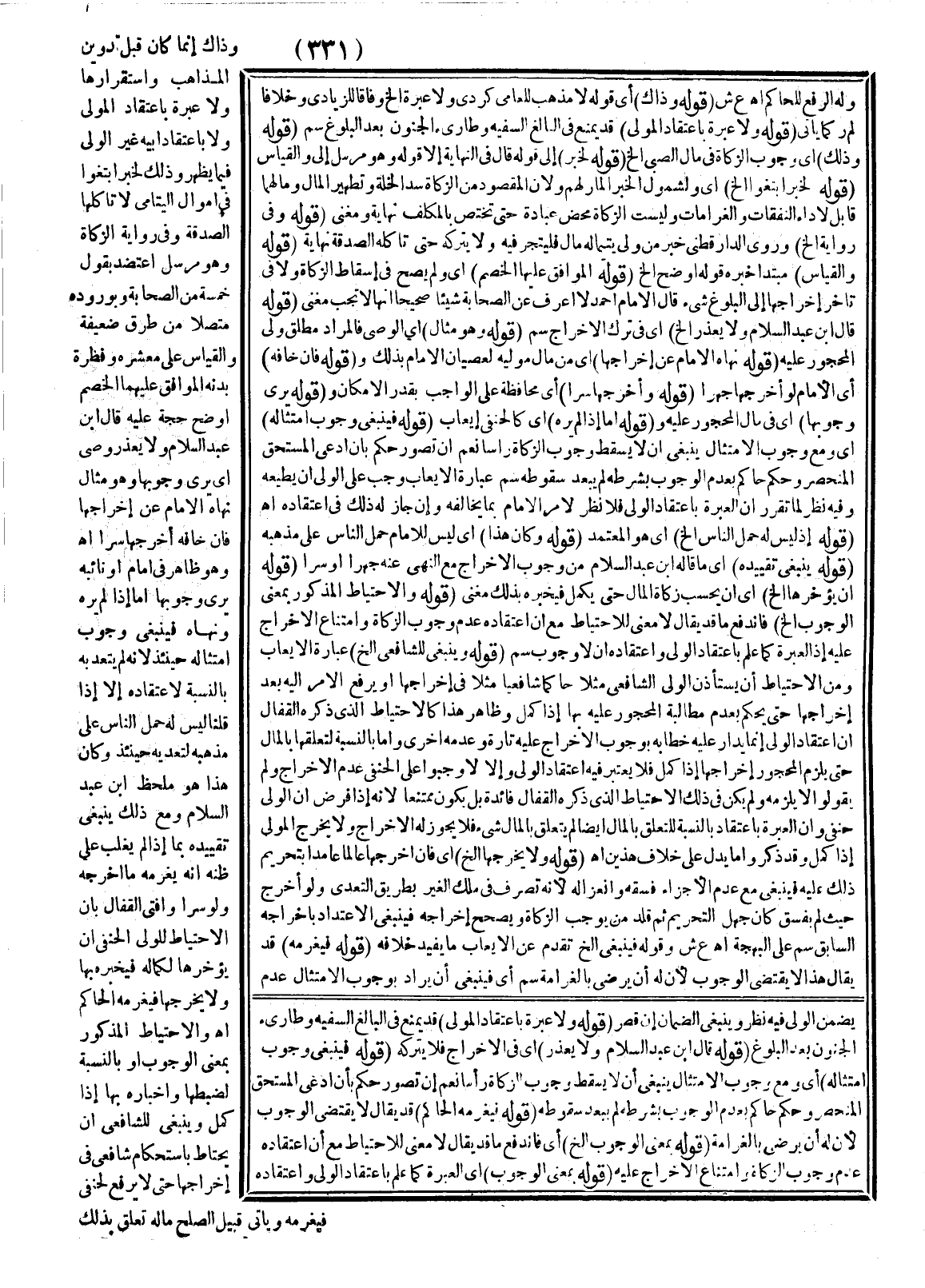 وَذَاكَ إنَّمَا كَانَ قَبْلَ تَدْوِينِ الْمَذَاهِبِ وَاسْتِقْرَارِهَا وَلَا عِبْرَةَ بِاعْتِقَادِ الْمَوْلَى وَلَا بِاعْتِقَادِ أَبِيهِ غَيْرِ الْوَلِيِّ فِيمَا يَظْهَرُ وَذَلِكَ لِخَبَرِ «ابْتَغُوا فِي أَمْوَالِ الْيَتَامَى لَا تَأْكُلُهَا الصَّدَقَةُ وَفِي رِوَايَةٍ الزَّكَاةُ» وَهُوَ مُرْسَلٌ اعْتَضَدَ بِقَوْلِ خَمْسَةٍ مِنْ الصَّحَابَةِ وَبِوُرُودِهِ مُتَّصِلًا مِنْ طُرُقٍ ضَعِيفَةٍ وَالْقِيَاسُ عَلَى مُعَشِّرِهِ وَفِطْرَةِ بَدَنِهِ الْمُوَافِقِ عَلَيْهِمَا الْخَصْمُ أَوْضَحُ حُجَّةً عَلَيْهِ قَالَ ابْنُ عَبْدِ السَّلَامِ وَلَا يُعْذَرُ وَصِيٌّ أَيْ يَرَى وُجُوبَهَا وَهُوَ مِثَالٌ نَهَاهُ الْإِمَامُ عَنْ إخْرَاجِهَا فَإِنْ خَافَهُ أَخْرَجَهَا سِرًّا اهـ وَهُوَ ظَاهِرٌ فِي إمَامٍ أَوْ نَائِبِهِ يَرَى وُجُوبَهَا أَمَّا إذَا لَمْ يَرَهُ وَنَهَاهُ فَيَنْبَغِي وُجُوبُ امْتِثَالِهِ حِينَئِذٍ؛ لِأَنَّهُ لَمْ يَتَعَدَّ بِهِ بِالنِّسْبَةِ لِاعْتِقَادِهِ إلَّا إذَا قُلْنَا لَيْسَ لَهُ حَمْلُ النَّاسِ عَلَى مَذْهَبِهِ لِتَعَدِّيهِ حِينَئِذٍ وَكَانَ هَذَا هُوَ مَلْحَظُ ابْنِ عَبْدِ السَّلَامِ وَمَعَ ذَلِكَ يَنْبَغِي تَقْيِيدُهُ بِمَا إذَا لَمْ يَغْلِبْ عَلَى ظَنِّهِ أَنَّهُ يَغْرَمُهُ مَا أَخْرَجَهُ وَلَوْ سِرًّا وَأَفْتَى الْقَفَّالُ بِأَنَّ الِاحْتِيَاطَ لِلْوَلِيِّ الْحَنَفِيِّ أَنْ يُؤَخِّرَهَا لِكَمَالِهِ فَيُخْبِرَهُ بِهَا وَلَا يُخْرِجَهَا فَيُغَرِّمَهُ الْحَاكِمُ اهـ وَالِاحْتِيَاطُ الْمَذْكُورُ بِمَعْنَى الْوُجُوبِ أَوْ بِالنِّسْبَةِ لِضَبْطِهَا وَإِخْبَارِهِ بِهَا إذَا كَمُلَ وَيَنْبَغِي لِلشَّافِعِيِّ أَنْ يَحْتَاطَ بِاسْتِحْكَامِ شَافِعِيٍّ فِي إخْرَاجِهَا حَتَّى لَا يُرْفَعَ لِحَنَفِيٍّ فَيُغَرِّمَهُ وَيَأْتِيَ قُبَيْلَ الصُّلْحِ مَا لَهُ تَعَلُّقٌ بِذَلِكَ