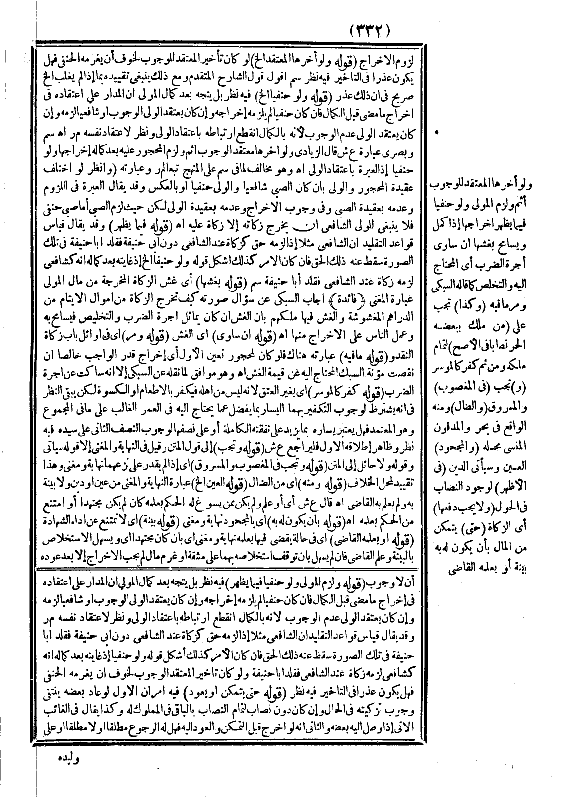 ـــــــــــــــــــــــــــــSأَنْ لَا وُجُوبَ (قَوْلُهُ وَلَزِمَ الْمَوْلَى وَلَوْ حَنَفِيًّا فِيمَا يَظْهَرُ) فِيهِ نَظَرٌ بَلْ يُتَّجَهُ بَعْدَ كَمَالِ الْمَوْلَى أَنَّ الْمَدَارَ عَلَى اعْتِقَادِهِ فِي إخْرَاجِ مَا مَضَى قَبْلَ الْكَمَالِ فَإِنْ كَانَ حَنَفِيًّا لَمْ يَلْزَمْهُ إخْرَاجُهُ وَإِنْ كَانَ يَعْتَقِدُ الْوَلِيُّ الْوُجُوبَ أَوْ شَافِعِيًّا لَزِمَهُ وَإِنْ كَانَ يَعْتَقِدُ الْوَلِيُّ عَدَمَ الْوُجُوبِ؛ لِأَنَّهُ بِالْكَمَالِ انْقَطَعَ ارْتِبَاطُهُ بِاعْتِقَادِ الْوَلِيِّ وَنَظَرَ لِاعْتِقَادِ نَفْسِهِ م ر وَقَدْ يُقَالُ قِيَاسُ قَوَاعِدِ التَّقْلِيدِ أَنَّ الشَّافِعِيَّ مَثَلًا إذَا لَزِمَهُ حَقٌّ كَزَكَاةٍ عِنْدَ الشَّافِعِيِّ دُونَ أَبِي حَنِيفَةَ فَقَلَّدَ أَبَا حَنِيفَةَ فِي تِلْكَ الصُّورَةِ سَقَطَ عَنْهُ ذَلِكَ الْحَقُّ فَإِنْ كَانَ الْأَمْرُ كَذَلِكَ أُشْكِلَ قَوْلُهُ وَلَوْ حَنَفِيًّا إذْ غَايَتُهُ بَعْدَ كَمَالِهِ أَنَّهُ كَشَافِعِيٍّ لَزِمَهُ زَكَاةٌ عِنْدَ الشَّافِعِيِّ فَقَلَّدَ أَبَا حَنِيفَةَ وَلَوْ كَانَ تَأْخِيرُ الْمُعْتَقِدِ الْوُجُوبَ لِخَوْفِ أَنْ يَغْرَمَهُ الْحَنَفِيُّ فَهَلْ يَكُونُ عُذْرًا فِي التَّأْخِيرِ فِيهِ نَظَرٌ