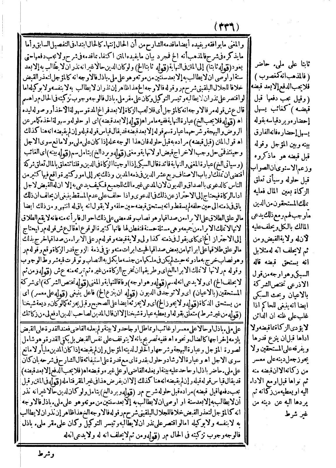 ـــــــــــــــــــــــــــــQوَالْمُغْنِي مَا يُوَافِقُهُ وَيُفِيدُهُ أَيْضًا مَا قَدَّمَهُ الشَّارِحِ مِنْ أَنَّ الْحَالَ انْتِهَاءً كَالْحَالِ ابْتِدَاءً فِي التَّفْصِيلِ السَّابِقِ وَأَمَّا مَا يَذْكُرُهُ فِي شَرْحٍ فَالْمَذْهَبُ أَنَّهُ إلَخْ فَمُجَرَّدُ بَيَانِ مَا يُفِيدُهُ الْمَتْنُ اكْتِفَاءً بِمَا قَدَّمَهُ فِي شَرْحٍ وَلَا يَجِبُ دَفْعُهَا حَتَّى يَعُودَ (قَوْلُهُ ثَابِتًا) إلَى الْمَتْنِ فِي النِّهَايَةِ (قَوْلُهُ ثَابِتًا إلَخْ) وَلَوْ كَانَ الدَّيْنُ حَالًّا غَيْرَ أَنَّهُ نَذَرَ أَنْ لَا يُطَالِبَ بِهِ إلَّا بَعْدَ سَنَةٍ أَوْ أَوْصَى أَنْ لَا يُطَالِبَ بِهِ إلَّا بَعْدَ سَنَتَيْنِ مِنْ مَوْتِهِ وَهُوَ عَلَى مَلِيءٍ بَاذِلٍ فَالْأَوْجَهُ أَنَّهُ كَالْمُؤَجَّلِ لِتَعَذُّرِ الْقَبْضِ خِلَافًا لِلْجَلَالِ الْبُلْقِينِيِّ شَرْحُ م ر وَقَوْلُهُ فَالْأَوْجَهُ إلَخْ هَذَا ظَاهِرٌ إنْ نَذَرَ أَنْ لَا يُطَالِبَ بِهِ لَا بِنَفْسِهِ وَلَا بِوَكِيلِهِ.