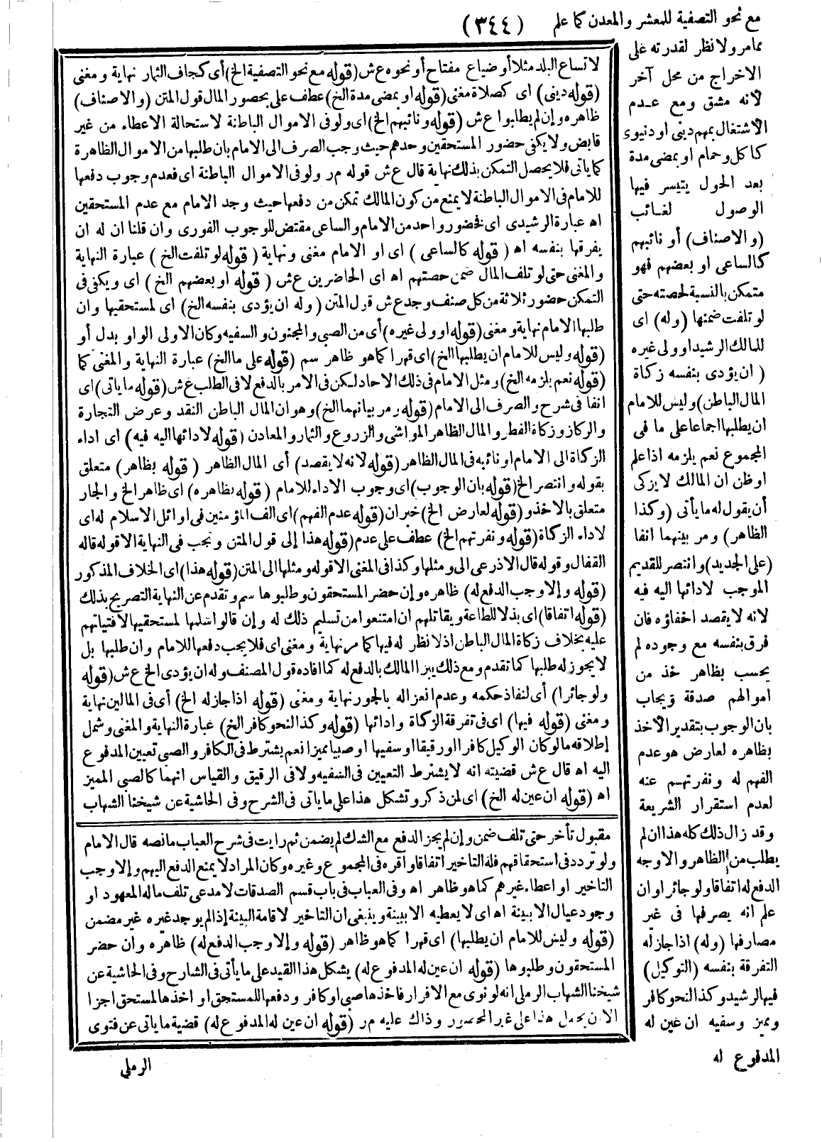 مَعَ نَحْوِ التَّصْفِيَةِ لِلْمُعَشَّرِ وَالْمَعْدِنِ كَمَا عُلِمَ مِمَّا مَرَّ وَلَا نَظَرَ لِقُدْرَتِهِ عَلَى الْإِخْرَاجِ مِنْ مَحَلٍّ آخَرَ؛ لِأَنَّهُ مُشِقٌّ وَمَعَ عَدَمِ الِاشْتِغَالِ بِمُهِمٍّ دِينِيٍّ أَوْ دُنْيَوِيٍّ كَأَكْلٍ وَحَمَّامٍ أَوْ بِمُضِيِّ مُدَّةٍ بَعْدَ الْحَوْلِ يَتَيَسَّرُ فِيهَا الْوُصُولُ لِغَائِبٍ (وَالْأَصْنَافُ) أَوْ نَائِبُهُمْ كَالسَّاعِي أَوْ بَعْضِهِمْ فَهُوَ مُتَمَكِّنٌ بِالنِّسْبَةِ لِحِصَّتِهِ حَتَّى لَوْ تَلِفَتْ ضَمِنَهَا