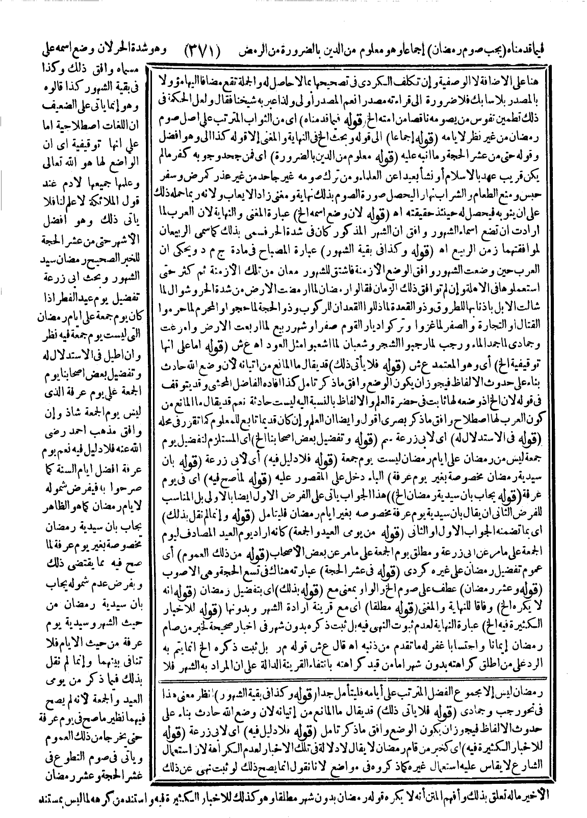 ـــــــــــــــــــــــــــــSرَمَضَانَ لَيْسَ إلَّا مَجْمُوعُ الْفَضْلِ الْمُتَرَتِّبِ عَلَى أَيَّامِهِ فَلْيُتَأَمَّلْ جِدًّا (قَوْلُهُ وَكَذَا فِي بَقِيَّةِ الشُّهُورِ) اُنْظُرْ مَعْنَى هَذَا فِي نَحْوِ رَجَبٍ وَجُمَادَى (قَوْلُهُ فَلَا يَأْتِي ذَلِكَ) قَدْ يُقَالُ مَا الْمَانِعُ مِنْ إتْيَانِهِ؛ لِأَنَّ وَضْعَ اللَّهِ حَادِثٌ بِنَاءً عَلَى حُدُوثِ الْأَلْفَاظِ فَيَجُوزُ أَنْ يَكُونَ الْوَضْعُ وَافَقَ مَا ذُكِرَ تَأَمَّلْ (قَوْلُهُ فَلَا دَلِيلَ فِيهِ) أَيْ لِأَبِي زُرْعَةَ (قَوْلُهُ لِلْأَخْبَارِ الْكَثِيرَةِ فِيهِ) أَيْ كَخَبَرِ «مَنْ قَامَ رَمَضَانَ» لَا يُقَالُ لَا دَلَالَةَ فِي تِلْكَ الْأَخْبَارِ لِعَدَمِ الْكَرَاهَةِ؛ لِأَنَّ اسْتِعْمَالَ الشَّارِعِ لَا يُقَاسُ عَلَيْهِ اسْتِعْمَالُ غَيْرِهِ كَمَا ذَكَرُوهُ فِي مَوَاضِعَ؛ لِأَنَّا نَقُولُ إنَّمَا يَصِحُّ ذَلِكَ لَوْ ثَبَتَ نَهْيٌ عَنْ ذَلِكَ
