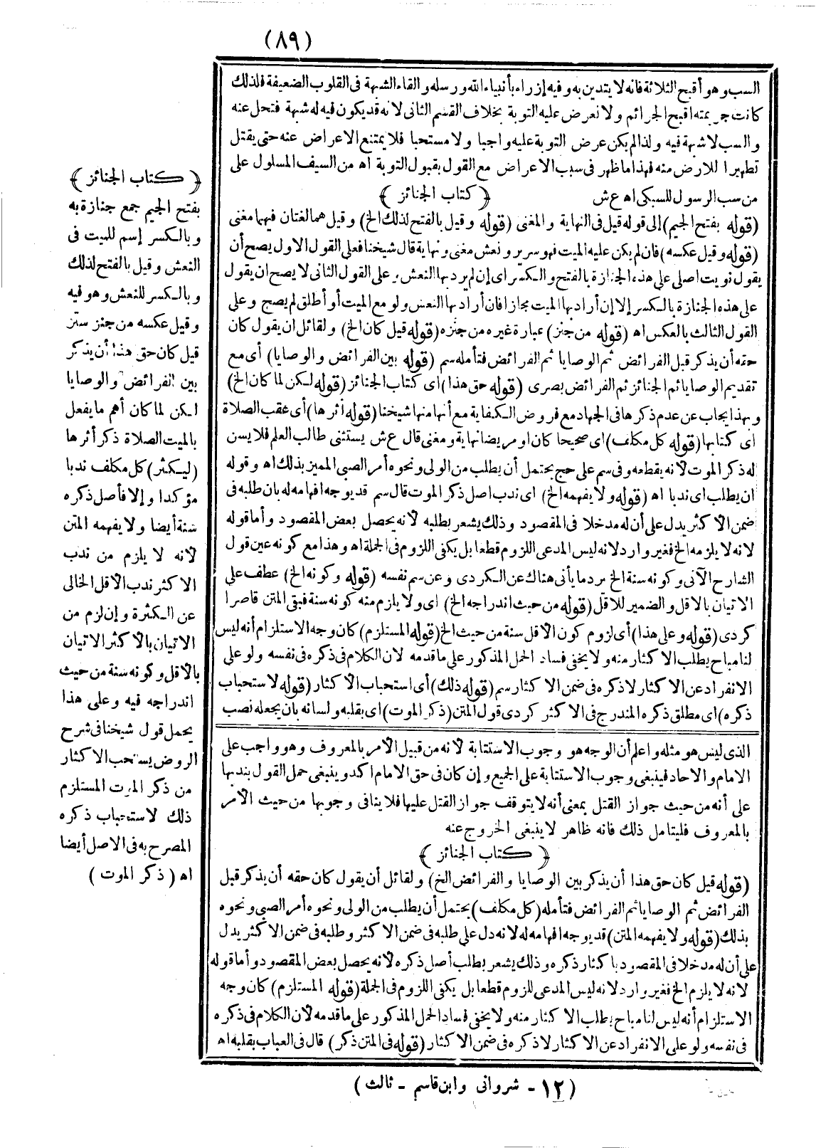 (كِتَابُ الْجَنَائِزِ) (قَوْلُهُ: قِيلَ كَانَ حَقُّ هَذَا أَنْ يُذْكَرَ بَيْنَ الْوَصَايَا وَالْفَرَائِضِ إلَخْ) وَلِقَائِلٍ أَنْ يَقُولَ كَانَ حَقُّهُ أَنْ يُذْكَرَ قَبْلَ الْفَرَائِضِ ثُمَّ الْوَصَايَا ثُمَّ الْفَرَائِضِ فَتَأَمَّلْهُ (قَوْلُهُ: كُلُّ مُكَلَّفٍ) يَحْتَمِلُ أَنْ يُطْلَبَ مِنْ الْوَلِيِّ وَنَحْوِهِ أَمْرُ الصَّبِيِّ وَنَحْوِهِ بِذَلِكَ (قَوْلُهُ: وَلَا يُفْهِمُهُ الْمَتْنُ) قَدْ يُوَجَّهُ إفْهَامُهُ لَهُ لِأَنَّهُ دَلَّ عَلَى طَلَبِهِ فِي ضِمْنِ الْأَكْثَرِ وَطَلَبُهُ فِي ضِمْنِ الْأَكْثَرِ يَدُلُّ عَلَى أَنَّ لَهُ مَدْخَلًا فِي الْمَقْصُودِ بِإِكْثَارِ ذِكْرِهِ وَذَلِكَ يُشْعِرُ بِطَلَبِ أَصْلِ ذِكْرِهِ لِأَنَّهُ يَحْصُلُ بَعْضُ الْمَقْصُودِ وَأَمَّا قَوْلُهُ: لِأَنَّهُ لَا يَلْزَمُ إلَخْ فَغَيْرُ وَارِدٍ لِأَنَّهُ لَيْسَ الْمُدَّعَى اللُّزُومَ قَطْعًا بَلْ يَكْفِي اللُّزُومُ فِي الْجُمْلَةِ (قَوْلُهُ: الْمُسْتَلْزِمِ) كَانَ وَجْهُ الِاسْتِلْزَامِ أَنَّهُ لَيْسَ لَنَا مُبَاحٌ يُطْلَبُ الْإِكْثَارُ مِنْهُ وَلَا يَخْفَى فَسَادُ الْحَمْلِ الْمَذْكُورِ عَلَى مَا قَدَّمَهُ لِأَنَّ الْكَلَامَ فِي ذِكْرِهِ فِي نَفْسِهِ، وَلَوْ عَلَى الِانْفِرَادِ عَنْ الْإِكْثَارِ لَا ذِكْرِهِ فِي ضِمْنِ الْإِكْثَارِ (قَوْلُهُ فِي الْمَتْنِ: ذِكْرَ) قَالَ فِي الْعُبَابِ بِقَلْبِهِ اهـ