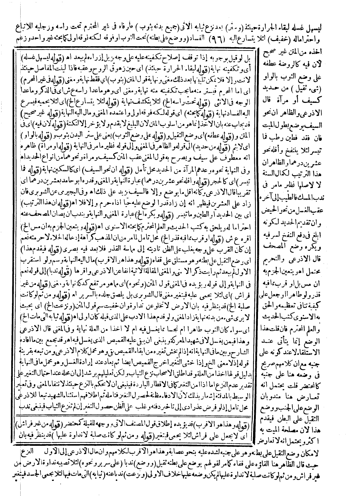 قَالَ الْأَذْرَعِيُّ وَالظَّاهِرُ أَنَّ نَحْوَ السَّيْفِ يُوضَعُ بِطُولِ الْمَيِّتِ فَإِنْ فُقِدَ فَطِينٌ رَطْبٌ فَمَا تَيَسَّرَ لِئَلَّا يَنْتَفِخَ وَأَقَلُّهُ نَحْوُ عِشْرِينَ دِرْهَمًا وَالظَّاهِرُ أَنَّ هَذَا التَّرْتِيبَ لِكَمَالِ السُّنَّةِ لَا لِأَصْلِهَا نَظِيرُ مَا مَرَّ فِي نَدْبِ الْمِسْكِ فَالطِّيبِ إلَى آخِرِهِ عَقِبَ الْغُسْلِ مِنْ نَحْوِ الْحَيْضِ وَأَنَّ تَقْدِيمَ الْحَدِيدِ لِكَوْنِهِ أَبْلَغَ فِي دَفْعِ النَّفْخِ لِسِرٍّ فِيهِ وَيُكْرَهُ وَضْعُ الْمُصْحَفِ قَالَ الْأَذْرَعِيُّ وَالتَّحْرِيمُ مُحْتَمَلٌ اهـ وَيَتَعَيَّنُ الْجَزْمُ بِهِ إنْ مَسَّ بَلْ أَوْ قَرُبَ مِمَّا فِيهِ قَذَرٌ وَلَوْ طَاهِرًا أَوْ جُعِلَ عَلَى كَيْفِيَّةٍ تُنَافِي تَعْظِيمَهُ وَأَلْحَقَ بِهِ الْإِسْنَوِيُّ كُتُبَ الْحَدِيثِ وَالْعِلْمِ الْمُحْتَرَمِ فَإِنْ قُلْتَ هَذَا الْوَضْعُ إنَّمَا يَتَأَتَّى عِنْدَ الِاسْتِلْقَاءِ لَا عِنْدَ كَوْنِهِ عَلَى جَنْبِهِ مَعَ أَنَّ كَلَامَهُمْ صَرِيحٌ فِي وَضْعِهِ هُنَا عَلَى جَنْبِهِ كَالْمُحْتَضَرِ قُلْت يَحْتَمِلُ أَنَّهُ تَعَارَضَ هُنَا مَنْدُوبَانِ الْوَضْعُ عَلَى الْجَنْبِ وَوَضْعُ الثَّقِيلِ عَلَى الْبَطْنِ فَيُقَدَّمُ هَذَا لِأَنَّ