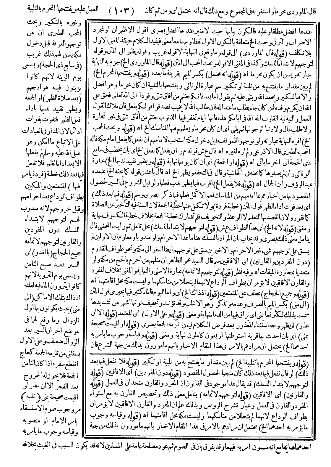 (قَوْلُهُ: وَجَمِيعِ الْحُجَّاجِ) عَطْفٌ عَلَى الْمُتَمَتِّعِينَ (قَوْلُهُ: إذْ ذَاكَ إلَخْ) أَيْ وَأَمَّا الْيَوْمُ فَالْمَاءُ كَثِيرٌ فِيهَا بُجَيْرِمِيٌّ قَوْلُ الْمَتْنِ (إلَى مِنًى) بِكَسْرِ الْمِيمِ بِالصَّرْفِ وَعَدَمِهِ وَتُذَكَّرُ، وَهُوَ الْأَغْلَبُ وَقَدْ تُؤَنَّثُ وَتَخْفِيفُ نُونِهَا أَشْهَرُ مِنْ تَشْدِيدِهَا سُمِّيَتْ بِذَلِكَ لِكَثْرَةِ مَا يُمْنَى أَيْ يُرَاقُ فِيهَا مِنْ الدِّمَاءِ نِهَايَةٌ وَمُغْنِي (قَوْلُهُ: وَعَلَى الْأَوَّلِ) أَيْ الْمُعْتَمَدُ (قَوْلُهُ: إلَّا إنْ عُذِرَ) لَمْ يَظْهَرْ وَجْهُ اسْتِثْنَاءِ الْمَعْذُورِ بَعْدَ فَرْضِ الْكَلَامِ فِيمَنْ تَلْزَمُهُ الْجُمُعَةُ بَصْرِيٌّ (قَوْلُهُ: أَوْ أُقِيمَتْ صَحِيحَةً بِمِنًى) أَيْ بِأَنْ أَحْدَثَ بِهَا قَرْيَةً اسْتَوْطَنَهَا أَرْبَعُونَ كَامِلُونَ نِهَايَةٌ وَمُغْنِي (قَوْلُهُ: وَقِيَاسُهُ وُجُوبُ مَا يَأْمُرُ بِهِ أَحَدَهُمَا إلَخْ) يَحْتَمِلُ أَنَّ مُرَادَهُمْ بِالْأَمْرِ فِي هَذَا الْمَقَامِ الْإِخْبَارُ بِأَنَّهُمْ مَأْمُورُونَ بِذَلِكَ مِنْ جِهَةِ الشَّرْعِ، فَإِنْ