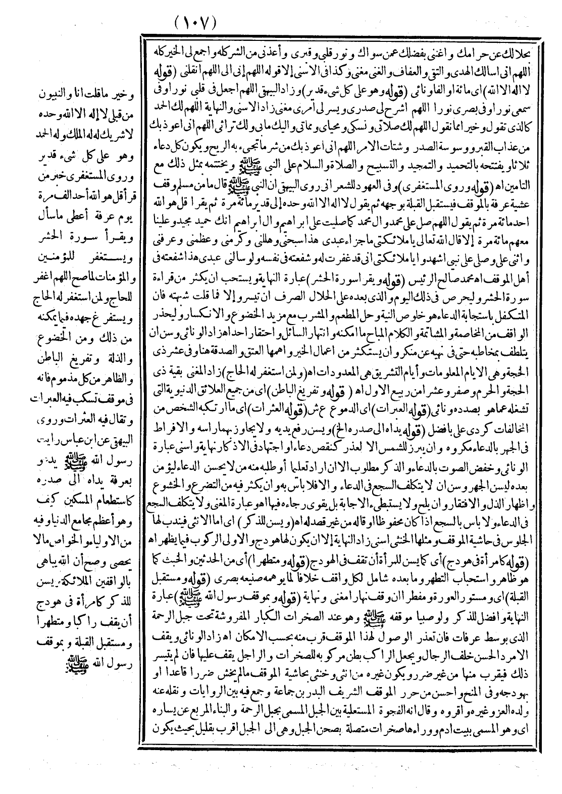 (قَوْلُهُ: وَرَوَى الْمُسْتَغْفِرِيُّ إلَخْ) وَفِي الْعُهُودِ لِلشَّعْرَانِيِّ رَوَى الْبَيْهَقِيُّ أَنَّ النَّبِيَّ - صَلَّى اللَّهُ عَلَيْهِ وَسَلَّمَ - قَالَ «مَا مِنْ مُسْلِمٍ وَقَفَ عَشِيَّةَ عَرَفَةَ بِالْمَوْقِفِ فَيَسْتَقْبِلُ الْقِبْلَةَ بِوَجْهِهِ ثُمَّ يَقُولُ لَا إلَهَ إلَّا اللَّهُ وَحْدَهُ إلَى قَدِيرٍ مِائَةَ مَرَّةٍ ثُمَّ يَقْرَأُ قُلْ هُوَ اللَّهُ أَحَدٌ مِائَةَ مَرَّةٍ ثُمَّ يَقُولُ اللَّهُمَّ صَلِّ عَلَى مُحَمَّدٍ وَآلِ مُحَمَّدٍ كَمَا صَلَّيْت عَلَى إبْرَاهِيمَ وَآلِ إبْرَاهِيمَ إنَّكَ حَمِيدٌ مَجِيدٌ وَعَلَيْنَا مَعَهُمْ مِائَةَ مَرَّةٍ إلَّا قَالَ اللَّهُ تَعَالَى يَا مَلَائِكَتِي مَا جَزَاءُ عَبْدِي هَذَا سَبَّحَنِي وَهَلَّلَنِي وَكَرَّمَنِي وَعَظَّمَنِي وَعَرَّفَنِي وَأَثْنَى عَلَيَّ وَصَلَّى عَلَى نَبِيِّي اشْهَدُوا يَا مَلَائِكَتِي أَنِّي قَدْ غَفَرْت لَهُ وَشَفَّعْته فِي نَفْسِهِ وَلَوْ سَأَلَنِي عَبْدِي هَذَا شَفَّعْته فِي أَهْلِ الْمَوْقِفِ» انْتَهَى اهـ مُحَمَّدُ صَالِحٍ الرَّئِيسُ (قَوْلُهُ: وَيَقْرَأُ سُورَةَ الْحَشْرِ) عِبَارَةُ النِّهَايَةِ وَيُسْتَحَبُّ أَنْ يُكْثِرَ مِنْ قِرَاءَةِ سُورَةِ الْحَشْرِ وَلْيَحْرِصْ فِي ذَلِكَ الْيَوْمِ وَاَلَّذِي بَعْدَهُ عَلَى الْحَلَالِ الصَّرْفِ إنْ تَيَسَّرَ وَإِلَّا فَمَا قَلَّتْ شُبْهَتُهُ، فَإِنَّ الْمُتَكَفِّلَ بِاسْتِجَابَةِ الدُّعَاءِ هُوَ خُلُوصُ النِّيَّةِ وَحِلُّ الْمَطْعَمِ وَالْمَشْرَبِ مَعَ مَزِيدِ الْخُضُوعِ وَالِانْكِسَارِ وَلْيَحْذَرْ الْوَاقِفُ مِنْ الْمُخَاصَمَةِ وَالْمُشَاتَمَةِ وَالْكَلَامِ الْمُبَاحِ مَا أَمْكَنَهُ وَانْتِهَارِ السَّائِلِ وَاحْتِقَارِ أَحَدٍ اهـ زَادَ الْوَنَائِيُّ وَسُنَّ أَنْ يَتَلَطَّفَ بِمُخَاطِبِهِ حَتَّى فِي نَهْيِهِ عَنْ مُنْكَرٍ وَأَنْ يَسْتَكْثِرَ مِنْ أَعْمَالِ الْخَيْرِ وَأَهَمُّهَا الْعِتْقُ وَالصَّدَقَةُ هُنَا وَفِي عَشَرَةِ ذِي الْحِجَّةِ، وَهِيَ الْأَيَّامُ الْمَعْلُومَاتُ وَأَيَّامُ التَّشْرِيقِ هِيَ الْمَعْدُودَاتُ اهـ.