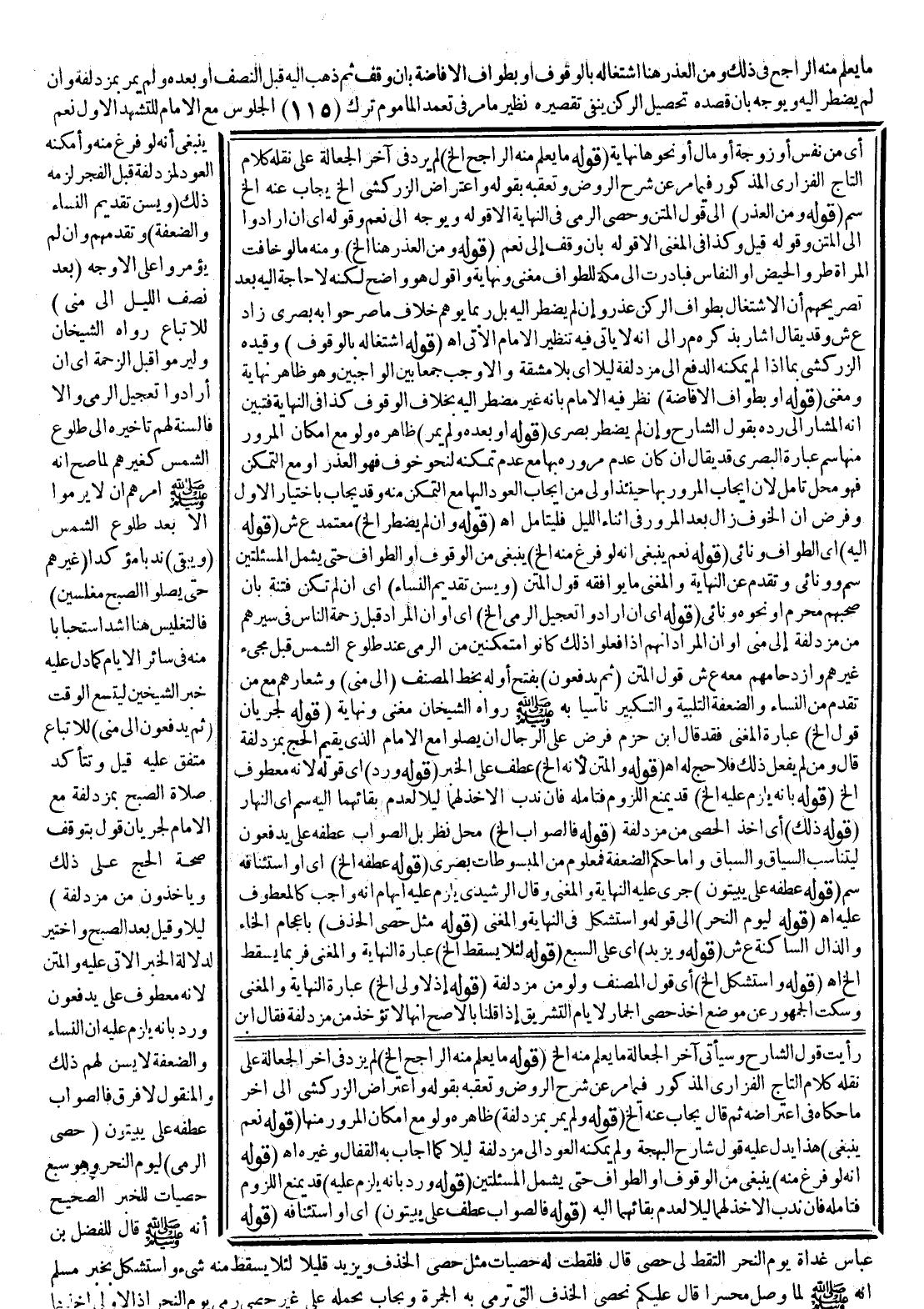 مَا يُعْلَمُ مِنْهُ الرَّاجِحُ فِي ذَلِكَ وَمِنْ الْعُذْرِ هُنَا اشْتِغَالُهُ بِالْوُقُوفِ، أَوْ بِطَوَافِ الْإِفَاضَةِ بِأَنْ وَقَفَ ثُمَّ ذَهَبَ إلَيْهِ قَبْلَ النِّصْفِ، أَوْ بَعْدَهُ وَلَمْ يَمُرَّ بِمُزْدَلِفَةَ، وَإِنْ لَمْ يَضْطَرَّ إلَيْهِ وَيُوَجَّهُ بِأَنَّ قَصْدَهُ تَحْصِيلَ الرُّكْنِ يَنْفِي تَقْصِيرَهُ نَظِيرُ مَا مَرَّ فِي تَعَمُّدِ الْمَأْمُومِ تَرْكَ الْجُلُوسِ مَعَ الْإِمَامِ لِلتَّشَهُّدِ الْأَوَّلِ نَعَمْ يَنْبَغِي أَنَّهُ لَوْ فَرَغَ مِنْهُ وَأَمْكَنَهُ الْعَوْدُ لِمُزْدَلِفَةَ قَبْلَ الْفَجْرِ لَزِمَهُ ذَلِكَ