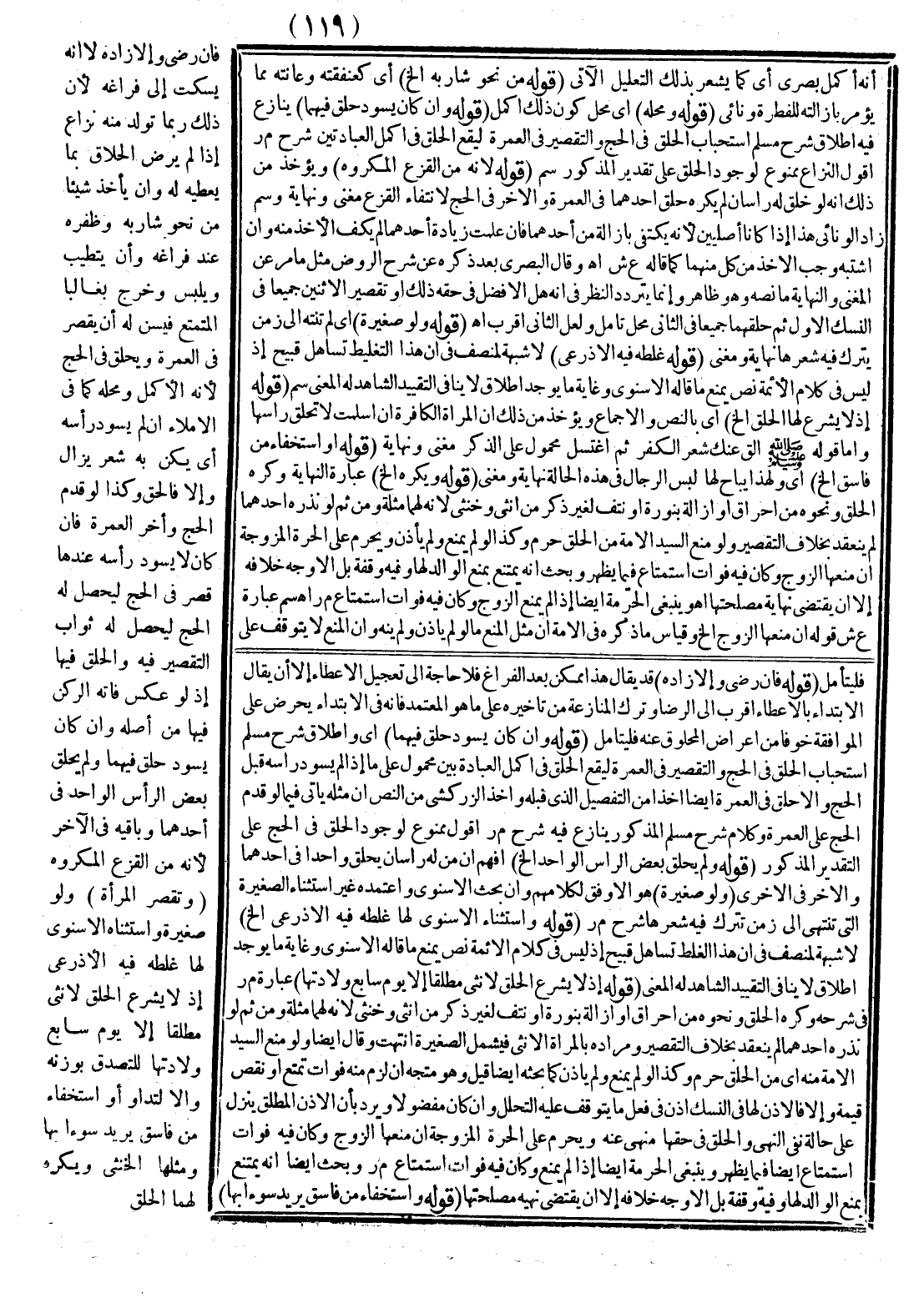 (قَوْلُهُ: وَيُكْرَهُ إلَخْ) عِبَارَةُ النِّهَايَةِ وَكُرِهَ الْحَلْقُ وَنَحْوُهُ مِنْ إحْرَاقٍ أَوْ إزَالَةٍ بِنُورَةٍ أَوْ نَتْفٍ لِغَيْرِ ذَكَرٍ مِنْ أُنْثَى وَخُنْثَى؛ لِأَنَّهُ لَهُمَا مُثْلَةٌ وَمِنْ ثَمَّ لَوْ نَذَرَهُ أَحَدُهُمَا لَمْ يَنْعَقِدْ بِخِلَافِ التَّقْصِيرِ وَلَوْ مَنَعَ السَّيِّدُ الْأَمَةَ مِنْ الْحَلْقِ حَرُمَ وَكَذَا لَوْ لَمْ يَمْنَعْ وَلَمْ يَأْذَنْ وَيَحْرُمُ عَلَى الْحُرَّةِ الْمُزَوَّجَةِ إنْ مَنَعَهَا الزَّوْجُ وَكَانَ فِيهِ فَوَاتُ اسْتِمْتَاعٍ فِيمَا يَظْهَرُ وَبَحَثَ أَنَّهُ يَمْتَنِعُ بِمَنْعِ الْوَالِدِ لَهَا وَفِيهِ وَقْفَةٌ بَلْ الْأَوْجَهُ خِلَافُهُ إلَّا أَنْ يَقْتَضِيَ نَهْيُهُ مَصْلَحَتَهَا اهـ وَيَنْبَغِي الْحُرْمَةُ أَيْضًا إذَا لَمْ يَمْنَعْ الزَّوْجُ وَكَانَ فِيهِ فَوَاتُ اسْتِمْتَاعٍ م ر اهـ سم عِبَارَةُ ع ش قَوْلُهُ إنْ مَنَعَهَا الزَّوْجُ إلَخْ وَقِيَاسُ مَا ذَكَرَهُ فِي الْأَمَةِ أَنَّ مِثْلَ الْمَنْعِ مَا لَوْ لَمْ يَأْذَنْ وَلَمْ يَنْهَ وَأَنَّ الْمَنْعَ لَا يَتَوَقَّفُ عَلَى
