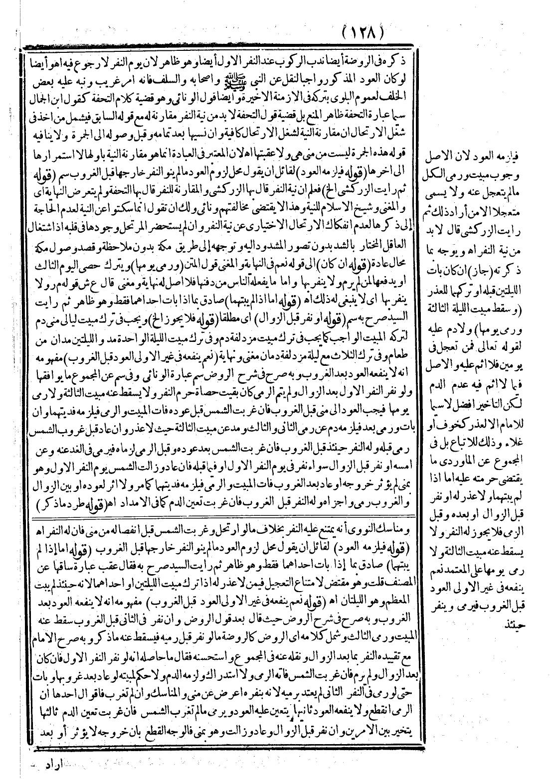 (قَوْلُهُ: فَيَلْزَمُهُ الْعَوْدُ) لِقَائِلٍ أَنْ يَقُولَ مَحَلُّ لُزُومِ الْعَوْدِ مَا لَمْ يَنْوِ النَّفْرَ خَارِجَهَا قَبْلَ الْغُرُوبِ سم (قَوْلُهُ ثُمَّ رَأَيْت الزَّرْكَشِيَّ إلَخْ) فَعُلِمَ أَنَّ نِيَّةَ النَّفْرِ قَالَ بِهَا الزَّرْكَشِيُّ وَالْمُقَارَنَةُ لِلنَّفْرِ قَالَ بِهَا التُّحْفَةُ وَلَمْ يَتَعَرَّضْ النِّهَايَةُ أَيْ وَالْمُغْنِي وَشَيْخُ الْإِسْلَامِ لِلنِّيَّةِ وَهَذَا لَا يَقْتَضِي مُخَالَفَتَهُمْ وَنَّائِيٌّ وَلَك أَنْ تَقُولَ إنَّمَا سَكَتُوا عَنْ النِّيَّةِ لِعَدَمِ الْحَاجَةِ إلَى ذِكْرِهَا لِعَدَمِ انْفِكَاكِ الِارْتِحَالِ الِاخْتِيَارِيِّ عَنْ نِيَّةِ النَّفْرِ، وَإِنْ لَمْ يَسْتَحْضِرْ الْمُرْتَحِلُ وُجُودَهَا فِي قَلْبِهِ إذْ اشْتِغَالُ الْعَاقِلِ الْمُخْتَارِ بِالشَّدِّ بِدُونِ تَصَوُّرِ الْمَشْدُودِ إلَيْهِ وَتَوَجُّهُهُ إلَى طَرِيقِ مَكَّةَ بِدُونِ مُلَاحَظَةٍ وَقَصْدِ وُصُولِ مَكَّةَ مُحَالٌ عَادَةً.