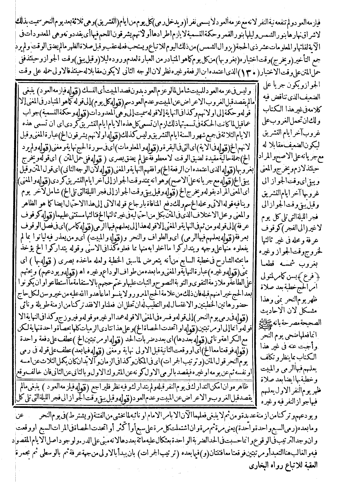 فَيَلْزَمُهُ الْعَوْدُ وَلَمْ تَنْفَعْهُ نِيَّةُ النَّفْرِ؛ لِأَنَّهُ مَعَ عَزْمِهِ الْعَوْدَ لَا يُسَمَّى نَفْرًا (وَيَدْخُلُ رَمْيُ) كُلِّ يَوْمٍ مِنْ أَيَّامِ (التَّشْرِيقِ) ، وَهِيَ ثَلَاثَةٌ بَعْدَ يَوْمِ النَّحْرِ سُمِّيَتْ بِذَلِكَ لِإِشْرَاقِ نَهَارِهَا بِنُورِ الشَّمْسِ وَلَيْلِهَا بِنُورِ الْقَمَرِ وَحِكْمَةُ التَّسْمِيَةِ لَا يَلْزَمُ اطِّرَادُهَا، أَوْ؛ لِأَنَّهُمْ يُشَرِّقُونَ اللَّحْمَ فِيهَا أَيْ: يُقَدِّدُونَهُ، وَهِيَ الْمَعْدُودَاتُ فِي الْآيَةِ لِقِلَّتِهَا وَالْمَعْلُومَاتُ عَشْرُ ذِي الْحِجَّةِ (بِزَوَالِ الشَّمْسِ) مِنْ ذَلِكَ الْيَوْمِ لِلِاتِّبَاعِ وَيُسْتَحَبُّ فِعْلُهُ عَقِبَهُ وَقَبْلَ صَلَاةِ الظُّهْرِ مَا لَمْ يَضِقْ الْوَقْتُ وَلَمْ يُرِدْ جَمْعَ التَّأْخِيرِ (وَيَخْرُجُ) وَقْتُ اخْتِيَارِهِ (بِغُرُوبِهَا) مِنْ كُلِّ يَوْمٍ كَمَا هُوَ الْمُتَبَادَرُ مِنْ الْعِبَارَةِ لِعَدَمِ وُرُودِهِ لَيْلًا (وَقِيلَ يَبْقَى) وَقْتُ الْجَوَازِ وَحِينَئِذٍ فَفِي حَمْلِ الْمَتْنِ عَلَى وَقْتِ الِاخْتِيَارِ الَّذِي اعْتَمَدَهُ ابْنُ الرِّفْعَةِ وَغَيْرُهُ نَظَرٌ؛ لِأَنَّ الْوَجْهَ الثَّانِي لَا يَكُونُ مُقَابِلًا لَهُ حِينَئِذٍ فَالْأَوْلَى حَمْلُهُ عَلَى وَقْتِ الْجَوَازِ وَيَكُونُ جَرْيًا عَلَى الضَّعِيفِ الَّذِي تَنَاقَضَ فِيهِ كَلَامُهُ فِي غَيْرِ هَذَا الْكِتَابِ.