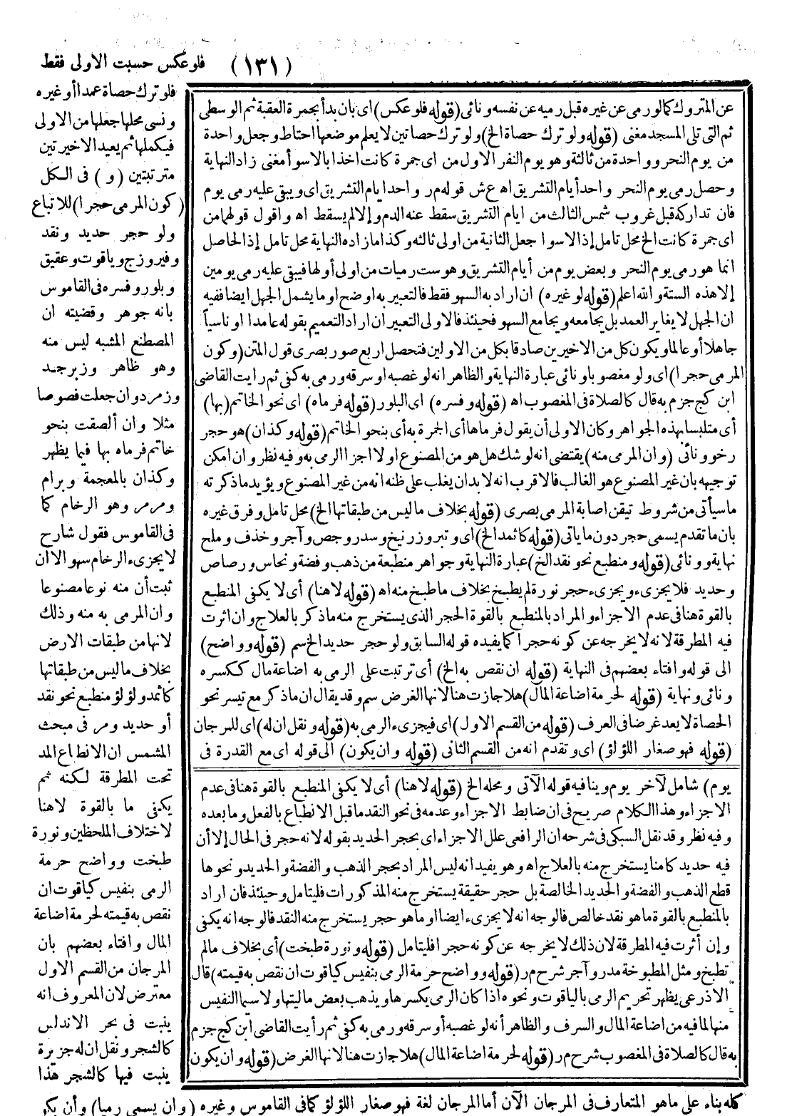 فَلَوْ عُكِسَتْ حُسِبَتْ الْأُولَى فَقَطْ فَلَوْ تَرَكَ حَصَاةً عَمْدًا، أَوْ غَيْرَهُ وَنَسِيَ مَحِلَّهَا جَعَلَهَا مِنْ الْأُولَى فَيُكْمِلُهَا ثُمَّ يُعِيدُ الْأَخِيرَتَيْنِ مُتَرَتِّبَتَيْنِ (وَ) فِي الْكُلِّ (كَوْنُ الْمَرْمِيِّ حَجَرًا) لِلِاتِّبَاعِ وَلَوْ حَجَرَ حَدِيدٍ وَنَقْدٍ وَفَيْرُوزَجِ وَيَاقُوتٍ وَعَقِيقٍ وَبِلَّوْرٍ وَفَسَّرَهُ فِي الْقَامُوسِ بِأَنَّهُ جَوْهَرٌ وَقَضِيَّتُهُ أَنَّ الْمُصْطَنَعَ الْمُشْبِهَ لَهُ لَيْسَ مِنْهُ، وَهُوَ ظَاهِرٌ وَزَبَرْجَدٍ وَزُمُرُّدٍ، وَإِنْ جُعِلَتْ فُصُوصًا مَثَلًا، وَإِنْ أُلْصِقَتْ بِنَحْوِ خَاتَمٍ فَرَمَاهُ بِهَا فِيمَا يَظْهَرُ وَكَذَّانِ بِالْمُعْجَمَةِ وَبِرَامٍ وَمَرْمَرٍ، وَهُوَ الرُّخَامُ كَمَا فِي الْقَامُوسِ فَقَوْلُ شَارِحٍ لَا يُجْزِئُ الرُّخَامُ سَهْوٌ إلَّا إنْ ثَبَتَ أَنَّ مِنْهُ نَوْعًا مَصْنُوعًا وَأَنَّ الْمَرْمِيَّ بِهِ مِنْهُ وَذَلِكَ؛ لِأَنَّهَا مِنْ طَبَقَاتِ الْأَرْضِ بِخِلَافِ مَا لَيْسَ مِنْ طَبَقَاتِهَا كَإِثْمِدٍ وَلُؤْلُؤٍ وَمُنْطَبِعٍ نَحْوِ نَقْدٍ، أَوْ حَدِيدٍ وَمَرَّ فِي مَبْحَثِ الْمُشَمَّسِ أَنَّ الِانْطِبَاعَ الْمَدُّ تَحْتَ الْمِطْرَقَةِ لَكِنَّهُ ثَمَّ يَكْفِي مَا بِالْقُوَّةِ لَا هُنَا لِاخْتِلَافِ الْمَلْحَظَيْنِ وَنُورَةٍ طُبِخَتْ وَوَاضِحٌ حُرْمَةُ الرَّمْيِ بِنَفِيسٍ كَيَاقُوتٍ إنْ نَقَصَ بِهِ قِيمَتُهُ لِحُرْمَةِ إضَاعَةِ الْمَالِ.