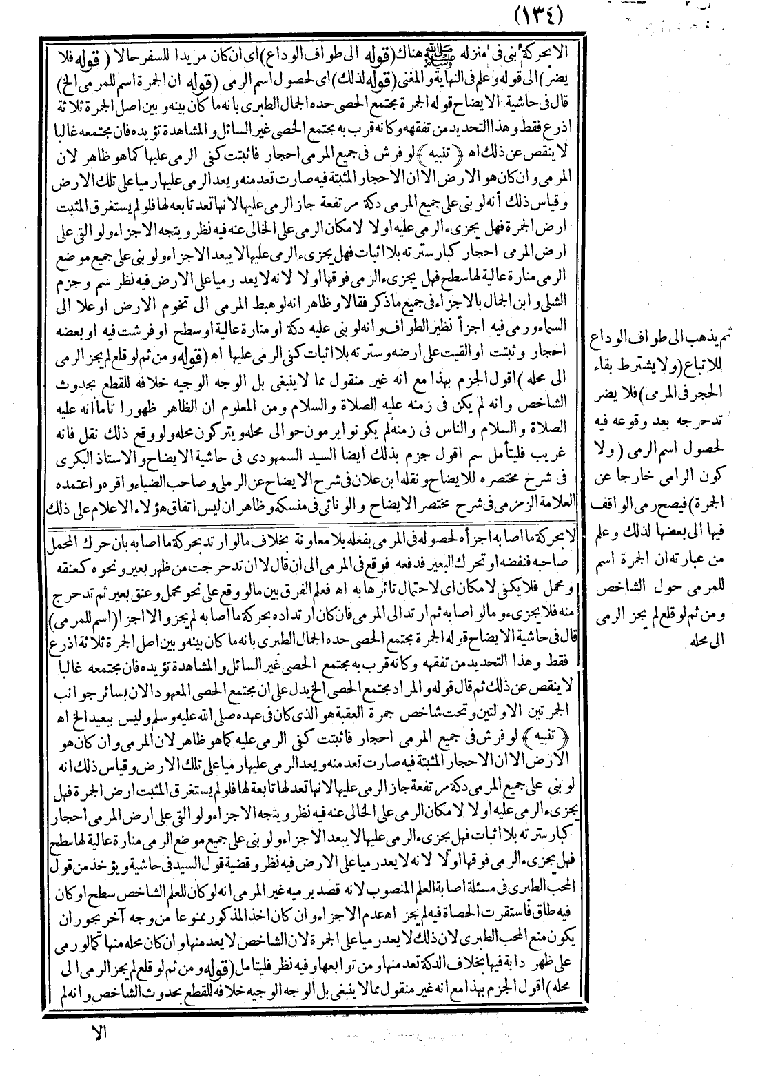 (قَوْلُهُ: اسْمٍ لِلْمَرْمَى) قَالَ فِي حَاشِيَةِ الْإِيضَاحِ قَوْلُهُ الْجَمْرَةُ مُجْتَمَعُ الْحَصَى حَدَّهُ الْجَمَالُ الطَّبَرِيُّ بِأَنَّهُ مَا كَانَ بَيْنَهُ وَبَيْنَ أَصْلِ الْجَمْرَةِ ثَلَاثَةُ أَذْرُعٍ فَقَطْ وَهَذَا التَّحْدِيدُ مِنْ تَفَقُّهِهِ وَكَأَنَّهُ قَرَّبَ بِهِ مُجْتَمَعَ الْحَصَى غَيْرِ السَّائِلِ، وَالْمُشَاهَدَةُ تُؤَيِّدُهُ، فَإِنَّ مُجْتَمَعَهُ غَالِبًا لَا يَنْقُصُ عَنْ ذَلِكَ ثُمَّ قَالَ قَوْلُهُ وَالْمُرَادُ مُجْتَمَعُ الْحَصَى إلَخْ يَدُلُّ عَلَى أَنَّ مُجْتَمَعَ الْحَصَى الْمَعْهُودِ الْآنَ بِسَائِرِ جَوَانِبِ الْجَمْرَتَيْنِ الْأُولَتَيْنِ وَتَحْتَ شَاخِصِ جَمْرَةِ الْعَقَبَةِ هُوَ الَّذِي كَانَ فِي عَهْدِهِ - صَلَّى اللَّهُ عَلَيْهِ وَسَلَّمَ - وَلَيْسَ بِبَعِيدٍ إلَخْ اهـ (تَنْبِيهٌ) لَوْ فَرَشَ فِي جَمِيعِ الْمَرْمَى أَحْجَارًا فَثَبَتَتْ كَفَى الرَّمْيُ عَلَيْهَا كَمَا هُوَ ظَاهِرٌ؛ لِأَنَّ الْمَرْمَى، وَإِنْ كَانَ هُوَ الْأَرْضَ إلَّا أَنَّ الْأَحْجَارَ الْمُثْبَتَةَ فِيهِ صَارَتْ تُعَدُّ مِنْهُ وَيُعَدُّ الرَّمْيُ عَلَيْهَا رَمْيًا عَلَى تِلْكَ الْأَرْضِ وَقِيَاسُ ذَلِكَ أَنَّهُ لَوْ بَنَى عَلَى جَمِيعِ الْمَرْمَى دِكَّةً مُرْتَفِعَةً جَازَ الرَّمْيُ عَلَيْهَا؛ لِأَنَّهَا تُعَدُّ تَابِعَةً لَهَا فَلَوْ لَمْ يَسْتَغْرِقْ الْمُثْبَتُ أَرْضَ الْجَمْرَةِ فَهَلْ يُجْزِئُ الرَّمْيُ عَلَيْهِ أَوْ لَا لِإِمْكَانِ الرَّمْيِ عَلَى الْخَالِي عَنْهُ فِيهِ نَظَرٌ وَيُتَّجَهُ الْإِجْزَاءُ وَلَوْ أُلْقِيَ عَلَى أَرْضِ الْمَرْمَى أَحْجَارٌ كِبَارٌ سَتَرَتْهُ بِلَا إثْبَاتٍ فَهَلْ يُجْزِئُ الرَّمْيُ عَلَيْهَا لَا يَبْعُدُ الْإِجْزَاءُ وَلَوْ بُنِيَ عَلَى جَمِيعِ مَوْضِعِ الرَّمْيِ مَنَارَةٌ عَالِيَةٌ لَهَا سَطْحٌ فَهَلْ يُجْزِئُ الرَّمْيُ فَوْقَهَا أَوْ لَا؛ لِأَنَّهُ لَا يُعَدُّ رَمْيًا عَلَى الْأَرْضِ فِيهِ نَظَرٌ وَقَضِيَّةُ قَوْلِ السَّيِّدِ فِي حَاشِيَتِهِ وَيُؤْخَذُ مِنْ قَوْلِ الْمُحِبِّ الطَّبَرِيِّ فِي مَسْأَلَةِ إصَابَةِ الْعَلَمِ الْمَنْصُوبِ؛ لِأَنَّهُ قَصَدَ بِرَمْيِهِ غَيْرَ الْمَرْمَى أَنَّهُ لَوْ كَانَ لِلْعَلَمِ الشَّاخِصِ سَطْحٌ أَوْ كَانَ فِيهِ طَاقٌ فَاسْتَقَرَّتْ الْحَصَاةُ فِيهِ لَمْ يَجُزْ اهـ عَدَمُ الْإِجْزَاءِ، وَإِنْ كَانَ أَخْذُ الْمَذْكُورِ مَمْنُوعًا وَمِنْ وَجْهٍ آخَرَ يَجُوزُ أَنْ يَكُونَ مَنْعُ الْمُحِبِّ الطَّبَرِيِّ؛ لِأَنَّ ذَلِكَ لَا يُعَدُّ رَمْيًا عَلَى الْجَمْرَةِ؛ لِأَنَّ الشَّاخِصَ لَا يُعَدُّ مِنْهَا، وَإِنْ كَانَ مَحِلُّهُ مِنْهَا كَمَا لَوْ رَمَى عَلَى ظَهْرِ دَابَّتِهِ فِيهَا بِخِلَافِ الدِّكَّةِ تُعَدُّ مِنْهَا وَمِنْ تَوَابِعِهَا وَفِيهِ نَظَرٌ فَلْيُتَأَمَّلْ.