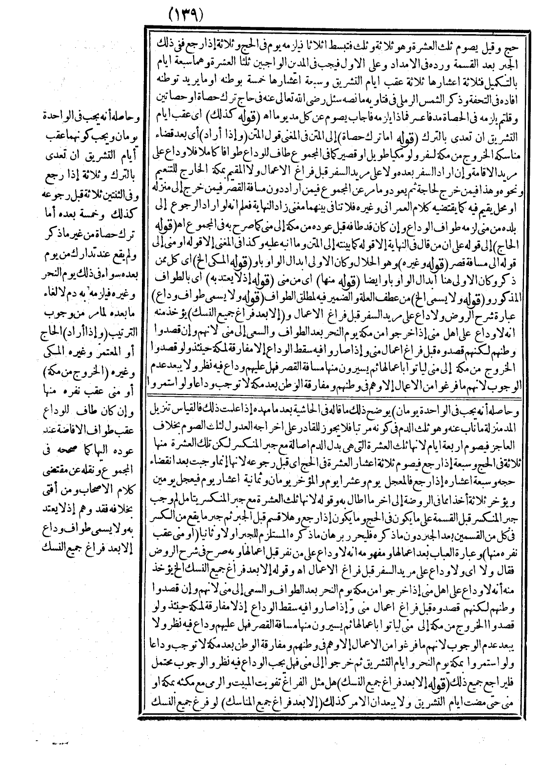 ـــــــــــــــــــــــــــــQحَجّ وَقِيلَ يَصُومُ ثُلُثَ الْعَشَرَةِ، وَهُوَ ثَلَاثَةٌ وَثُلُثٌ فَتُبْسَطُ أَثْلَاثًا فَيَلْزَمُهُ يَوْمٌ فِي الْحَجِّ وَثَلَاثَةٌ إذَا رَجَعَ فَفِي ذَلِكَ الْجَبْرُ بَعْدَ الْقِسْمَةِ وَرَدَّهُ فِي الْإِمْدَادِ وَعَلَى الْأَوَّلِ فَيَجِبُ فِي الْمُدَّيْنِ الْوَاجِبَيْنِ ثُلُثَا الْعَشَرَةِ وَهُمَا سَبْعَةُ أَيَّامٍ بِالتَّكْمِيلِ فَثَلَاثَةُ أَعْشَارِهَا ثَلَاثَةٌ عَقِبَ أَيَّامِ التَّشْرِيقِ وَسَبْعَةُ أَعْشَارِهَا خَمْسَةٌ بِوَطَنِهِ أَوْ مَا يُرِيدُ تَوَطُّنَهُ أَفَادَهُ فِي التُّحْفَةِ وَذَكَرَ الشَّمْسُ الرَّمْلِيُّ فِي فَتَاوِيهِ مَا نَصُّهُ سُئِلَ - رَضِيَ اللَّهُ تَعَالَى عَنْهُ - فِي حَاجٍّ تَرَكَ حَصَاةً أَوْ حَصَاتَيْنِ وَقُلْتُمْ يَلْزَمُهُ فِي الْحَصَاةِ مُدٌّ فَأَعْسَرَ فَمَاذَا يَلْزَمُهُ فَأَجَابَ يَصُومُ عَنْ كُلِّ مُدٍّ يَوْمًا اهـ انْتَهَتْ.