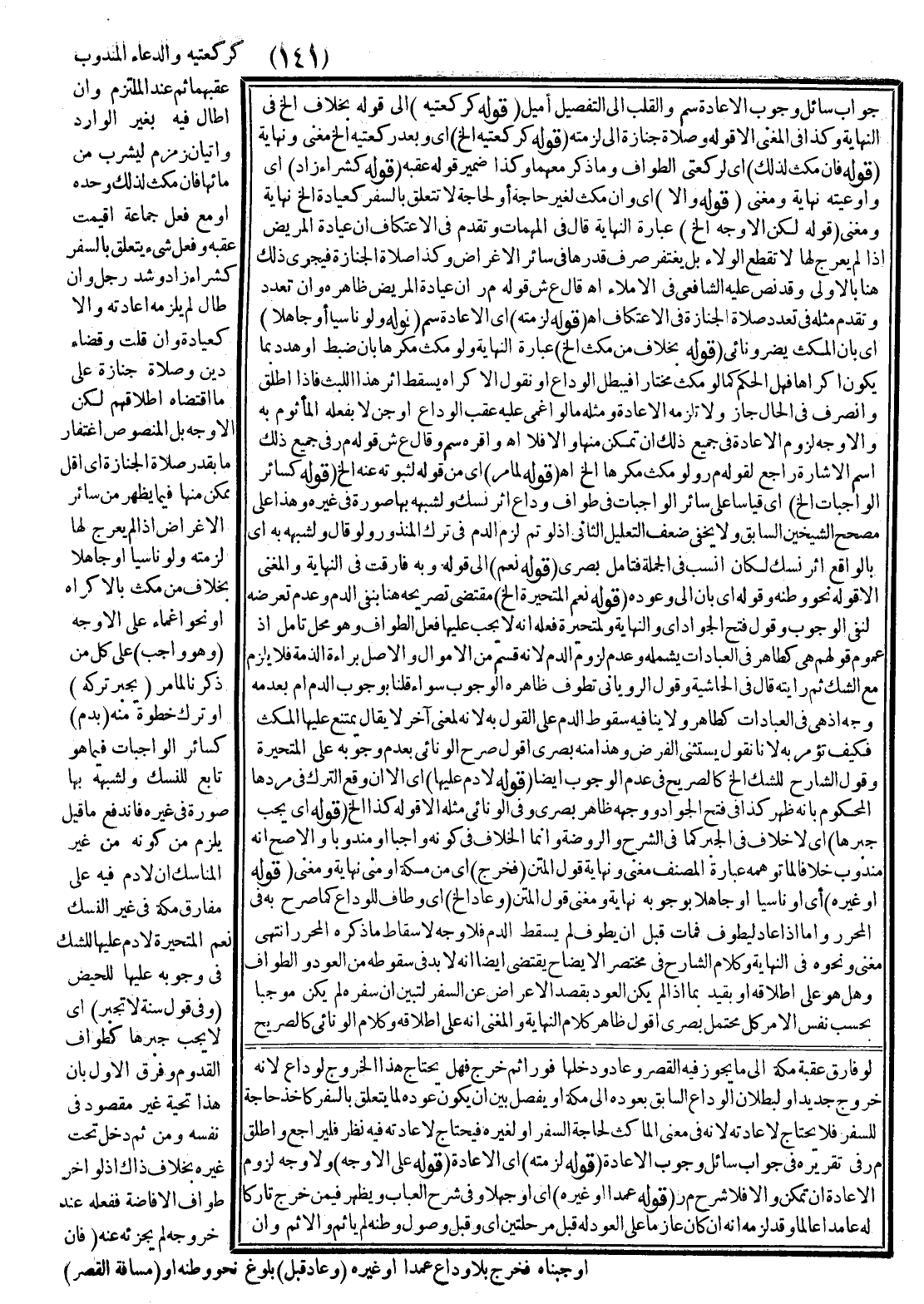 كَرَكْعَتَيْهِ وَالدُّعَاءِ الْمَنْدُوبِ عَقِبَهُمَا ثُمَّ عِنْدَ الْمُلْتَزِمِ، وَإِنْ أَطَالَ فِيهِ بِغَيْرِ الْوَارِدِ، وَإِتْيَانُ زَمْزَمَ لِيَشْرَبَ مِنْ مَائِهَا، فَإِنْ مَكَثَ لِذَلِكَ وَحْدَهُ، أَوْ مَعَ فِعْلِ جَمَاعَةٍ أُقِيمَتْ عَقِبَهُ وَفِعْلِ شَيْءٍ يَتَعَلَّقُ بِالسَّفَرِ كَشِرَاءِ زَادٍ وَشَدِّ رَحْلٍ، وَإِنْ طَالَ لَمْ يَلْزَمْهُ إعَادَتُهُ وَإِلَّا كَعِيَادَةٍ، وَإِنْ قَلَّتْ وَقَضَاءِ دَيْنٍ وَصَلَاةِ جِنَازَةٍ عَلَى مَا اقْتَضَاهُ إطْلَاقُهُمْ لَكِنَّ الْأَوْجَهَ بَلْ الْمَنْصُوصَ اغْتِفَارُ مَا بِقَدْرِ صَلَاةِ الْجِنَازَةِ أَيْ: أَقَلَّ مُمْكِنٍ مِنْهَا فِيمَا يَظْهَرُ مِنْ سَائِرِ الْأَغْرَاضِ إذَا لَمْ يُعَرِّجْ لَهَا لَزِمَتْهُ وَلَوْ نَاسِيًا، أَوْ جَاهِلًا بِخِلَافِ مَنْ مَكَثَ بِالْإِكْرَاهِ، أَوْ نَحْوِ إغْمَاءٍ عَلَى الْأَوْجَهِ (وَهُوَ وَاجِبٌ) عَلَى كُلِّ مَنْ ذَكَرْنَا لِمَا مَرَّ (يُجْبَرُ تَرْكُهُ) ، أَوْ تَرَكَ خُطْوَةً مِنْهُ (بِدَمٍ) كَسَائِرِ الْوَاجِبَاتِ فِيمَا هُوَ تَابِعٌ لِلنُّسُكِ وَلِشَبَهِهِ بِهَا صُورَةً فِي غَيْرِهِ فَانْدَفَعَ مَا قِيلَ يَلْزَمُ مِنْ كَوْنِهِ مِنْ غَيْرِ الْمَنَاسِكِ أَنْ لَا دَمَ فِيهِ عَلَى مُفَارِقِ مَكَّةَ فِي غَيْرِ النُّسُكِ نَعَمْ الْمُتَحَيِّرَةُ لَا دَمَ عَلَيْهَا لِلشَّكِّ فِي وُجُوبِهِ عَلَيْهَا بِاحْتِمَالِ كُلِّ زَمَنٍ يَمُرُّ عَلَيْهَا لِلْحَيْضِ.