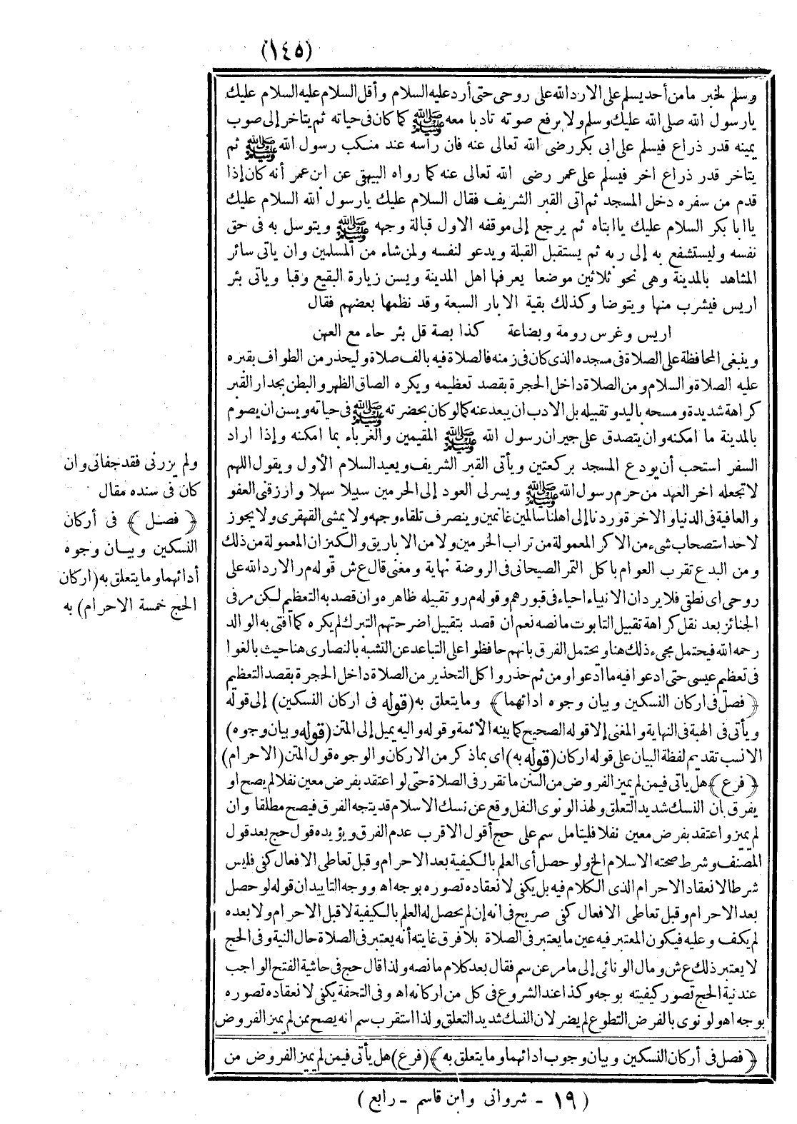 وَإِذَا أَرَادَ السَّفَرَ اُسْتُحِبَّ أَنْ يُوَدِّعَ الْمَسْجِدَ بِرَكْعَتَيْنِ وَيَأْتِيَ الْقَبْرَ الشَّرِيفَ وَيُعِيدَ السَّلَامَ الْأَوَّلَ وَيَقُولَ اللَّهُمَّ لَا تَجْعَلْهُ آخِرَ الْعَهْدِ مِنْ حَرَمِ رَسُولِ اللَّهِ - صَلَّى اللَّهُ عَلَيْهِ وَسَلَّمَ - وَيَسِّرْ لِي الْعَوْدَ إلَى الْحَرَمَيْنِ سَبِيلًا سَهْلًا وَارْزُقْنِي الْعَفْوَ وَالْعَافِيَةَ فِي الدُّنْيَا وَالْآخِرَةِ وَرُدَّنَا إلَى أَهْلِنَا سَالِمِينَ غَانِمِينَ وَيَنْصَرِفُ تِلْقَاءَ وَجْهِهِ وَلَا يَمْشِي الْقَهْقَرَى وَلَا يَجُوزُ لِأَحَدٍ اسْتِصْحَابُ شَيْءٍ مِنْ الْأُكَرِ الْمَعْمُولَةِ مِنْ تُرَابِ الْحَرَمَيْنِ وَلَا مِنْ الْأَبَارِيقِ وَالْكِيزَانِ الْمَعْمُولَةِ مِنْ ذَلِكَ وَمِنْ الْبِدَعِ تَقَرُّبُ الْعَوَّامِ بِأَكْلِ التَّمْرِ الصَّيْحَانِيِّ فِي الرَّوْضَةِ نِهَايَةٌ وَمُغْنِي قَالَ ع ش قَوْلُهُ م ر إلَّا رَدَّ اللَّهُ عَلَيَّ رُوحِي أَيْ نُطْقِي فَلَا يَرِدُ أَنَّ الْأَنْبِيَاءَ أَحْيَاءٌ فِي قُبُورِهِمْ وَقَوْلُهُ م ر وَتَقْبِيلُهُ ظَاهِرُهُ، وَإِنْ قَصَدَ بِهِ التَّعْظِيمَ لَكِنْ مَرَّ فِي الْجَنَائِزِ بَعْدَ نَقْلِ كَرَاهَةِ تَقْبِيلِ التَّابُوتِ مَا نَصُّهُ نَعَمْ إنْ قَصَدَ بِتَقْبِيلِ أَضْرِحَتِهِمْ التَّبَرُّكَ لَمْ يُكْرَهْ كَمَا أَفْتَى بِهِ الْوَالِدُ - رَحِمَهُ اللَّهُ تَعَالَى - فَيَحْتَمِلُ مَجِيءَ ذَلِكَ هُنَا وَيَحْتَمِلُ الْفَرْقَ بِأَنَّهُمْ حَافَظُوا عَلَى التَّبَاعُدِ عَنْ التَّشَبُّهِ بِالنَّصَارَى هُنَا حَيْثُ بَالَغُوا فِي تَعْظِيمِ عِيسَى حَتَّى ادَّعَوْا فِيهِ مَا ادَّعَوْا وَمِنْ ثَمَّ حَذَّرُوا كُلَّ التَّحْذِيرِ مِنْ الصَّلَاةِ دَاخِلَ الْحُجْرَةِ بِقَصْدِ التَّعْظِيمِ اهـ