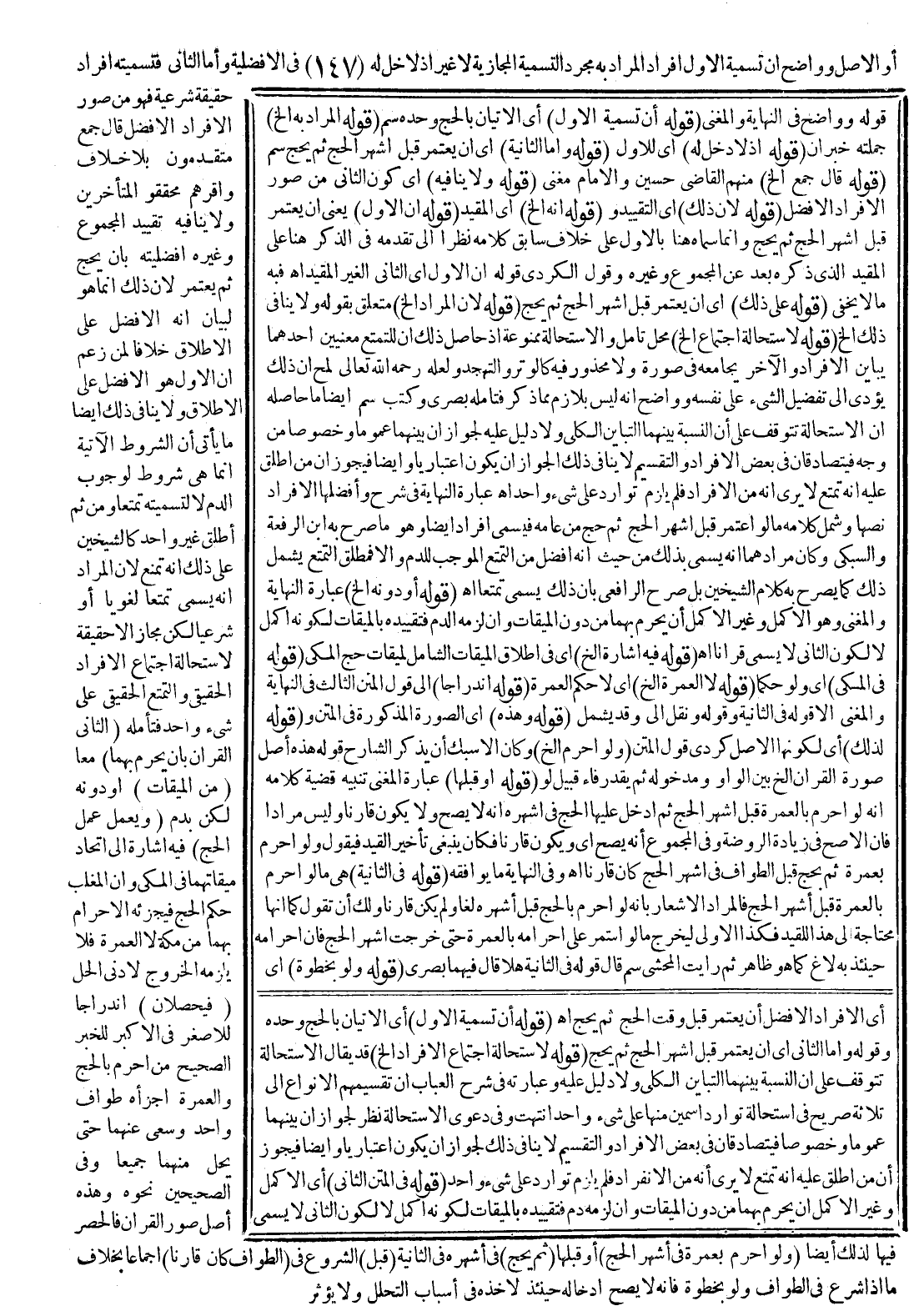 أَوْ الْأَصْلِ وَوَاضِحٌ أَنَّ تَسْمِيَةَ الْأَوَّلِ إفْرَادًا الْمُرَادُ بِهِ مُجَرَّدُ التَّسْمِيَةِ الْمَجَازِيَّةِ لَا غَيْرُ إذْ لَا دَخْلَ لَهُ فِي الْأَفْضَلِيَّةِ وَأَمَّا الثَّانِي فَتَسْمِيَتُهُ إفْرَادًا حَقِيقَةٌ شَرْعِيَّةٌ فَهُوَ مِنْ صُوَرِ الْإِفْرَادِ الْأَفْضَلِ قَالَ جَمْعٌ مُتَقَدِّمُونَ بِلَا خِلَافٍ وَأَقَرَّهُمْ مُحَقِّقُو الْمُتَأَخِّرِينَ وَلَا يُنَافِيهِ تَقْيِيدُ الْمَجْمُوعِ وَغَيْرِهِ أَفْضَلِيَّتَهُ بِأَنْ يَحُجَّ ثُمَّ يَعْتَمِرَ؛ لِأَنَّ ذَلِكَ إنَّمَا هُوَ لِبَيَانِ أَنَّهُ الْأَفْضَلُ عَلَى الْإِطْلَاقِ خِلَافًا لِمَنْ زَعَمَ أَنَّ الْأَوَّلَ هُوَ الْأَفْضَلُ عَلَى الْإِطْلَاقِ وَلَا يُنَافِي ذَلِكَ أَيْضًا مَا يَأْتِي أَنَّ الشُّرُوطَ الْآتِيَةَ إنَّمَا هِيَ شُرُوطٌ لِوُجُوبِ الدَّمِ لَا لِتَسْمِيَتِهِ تَمَتُّعًا وَمِنْ ثَمَّ أَطْلَقَ غَيْرُ وَاحِدٍ كَالشَّيْخَيْنِ عَلَى ذَلِكَ أَنَّهُ تَمَتُّعٌ؛ لِأَنَّ الْمُرَادَ أَنَّهُ يُسَمَّى تَمَتُّعًا لُغَوِيًّا، أَوْ شَرْعِيًّا لَكِنْ مَجَازًا لَا حَقِيقَةً لِاسْتِحَالَةِ اجْتِمَاعِ الْإِفْرَادِ الْحَقِيقِيِّ وَالتَّمَتُّعِ الْحَقِيقِيِّ عَلَى شَيْءٍ وَاحِدٍ فَتَأَمَّلْهُ