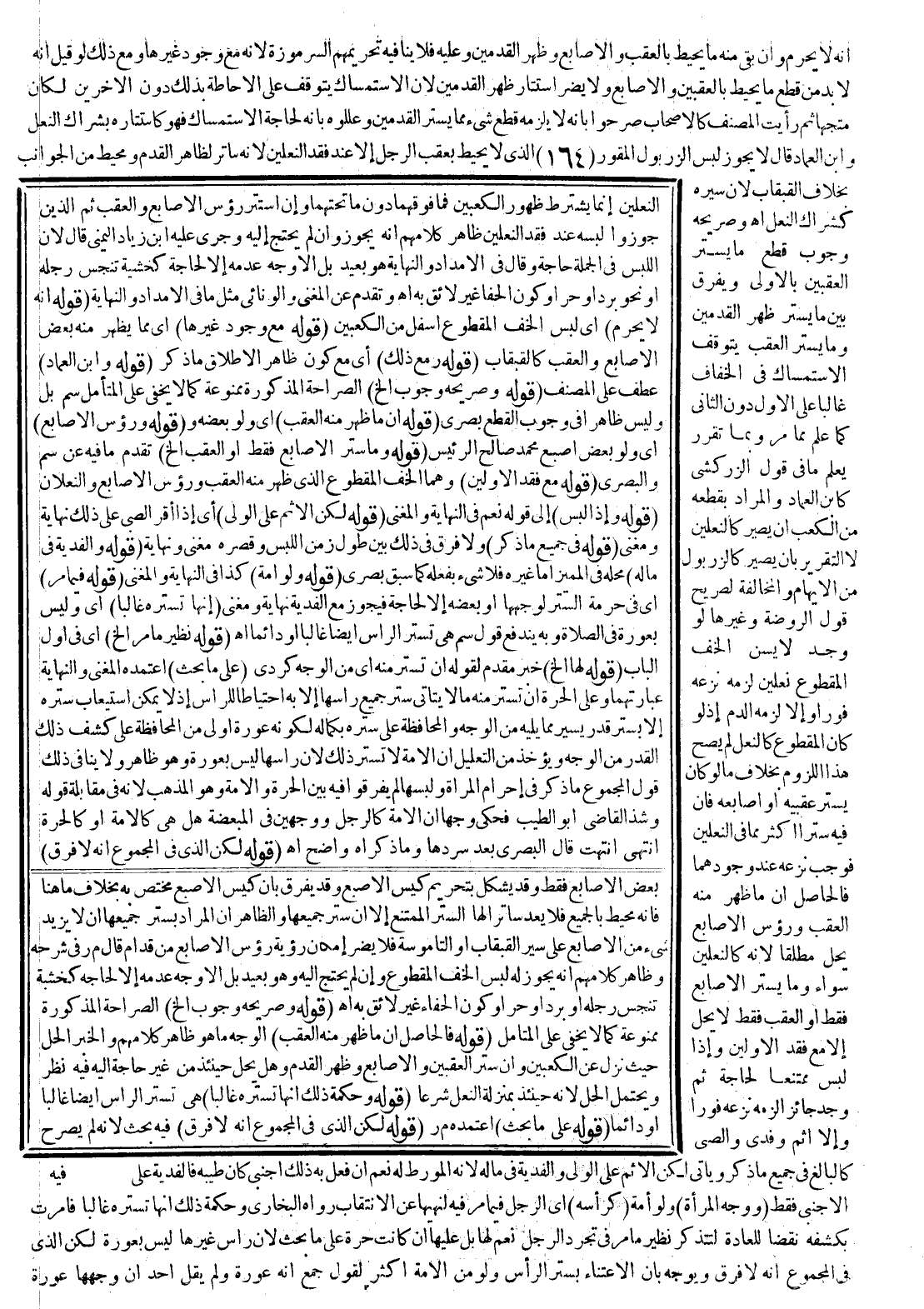 ـــــــــــــــــــــــــــــSبَعْضَ الْأَصَابِعِ فَقَطْ وَقَدْ يُشْكِلُ بِتَحْرِيمِ كِيسِ الْأُصْبُعِ وَقَدْ يُفَرَّقُ بِأَنَّ كِيسَ الْأُصْبُعِ مُخْتَصٌّ بِهِ بِخِلَافِ مَا هُنَا فَإِنَّهُ مُحِيطٌ بِالْجَمِيعِ فَلَا يُعَدُّ سَاتِرًا لَهَا السِّتْرَ الْمُمْتَنِعَ إلَّا إنْ سَتَرَ جَمِيعَهَا وَالظَّاهِرُ أَنَّ الْمُرَادَ بِسِتْرِ جَمِيعِهَا أَنْ لَا يَزِيدَ شَيْءٌ مِنْ الْأَصَابِعِ عَلَى سَيْرِ الْقَبْقَابِ أَوْ التَّاسُومَةِ فَلَا يَضُرُّ إمْكَانُ رُؤْيَةِ رُءُوسِ الْأَصَابِعِ مِنْ قُدَّامٍ فَلْيُتَأَمَّلْ. قَالَ م ر فِي شَرْحِهِ وَظَاهِرُ كَلَامِهِمْ أَنَّهُ يَجُوزُ لَهُ لُبْسُ الْخُفِّ الْمَقْطُوعِ، وَإِنْ لَمْ يَحْتَجْ إلَيْهِ وَهُوَ بَعِيدٌ بَلْ الْأَوْجُهُ عَدَمُهُ إلَّا لِحَاجَةٍ كَخَشْيَةٍ تَنَجُّسِ رِجْلِهِ أَوْ بَرْدٍ أَوْ حَرٍّ أَوْ كَوْنِ الْحَفَاءِ غَيْرَ لَائِقٍ بِهِ. اهـ.