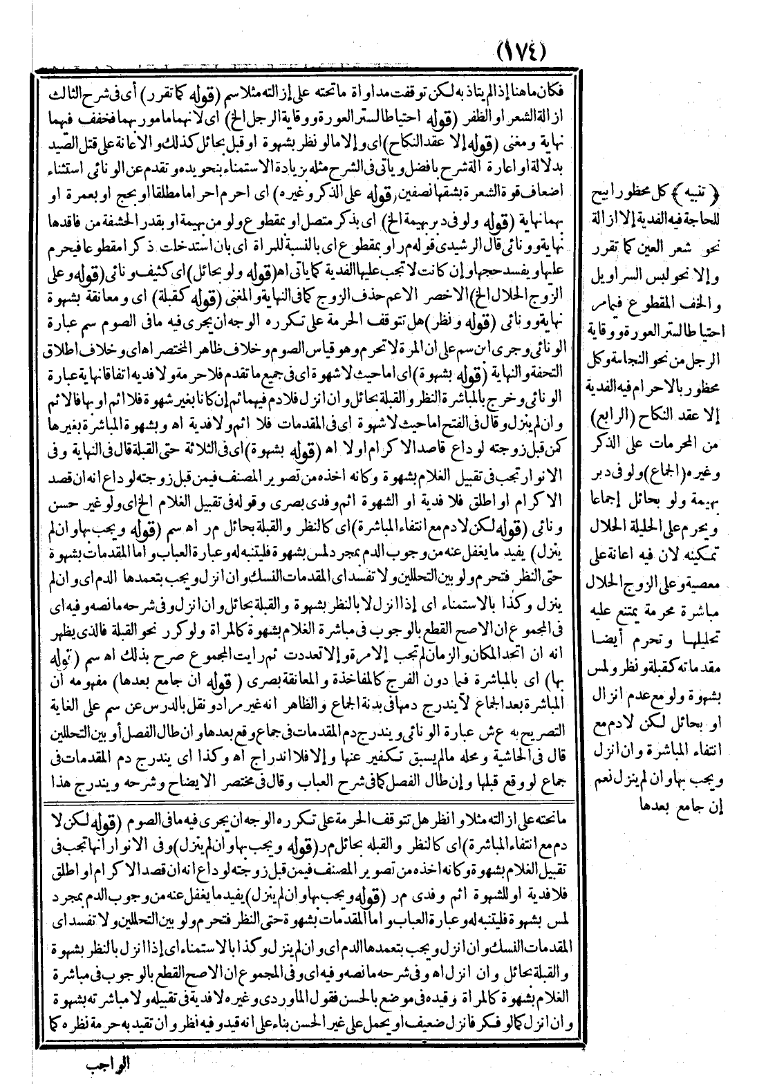 وَفِي شَرْحِهِ مَا نَصُّهُ وَفِيهِ أَيْ وَفِي الْمَجْمُوعِ أَنَّ الْأَصَحَّ الْقَطْعُ بِالْوُجُوبِ فِي مُبَاشَرَةِ الْغُلَامِ بِشَهْوَةٍ كَالْمَرْأَةِ وَقَيَّدَهُ فِي مَوْضِعٍ بِالْحُسْنِ فَقَوْلُ الْمَاوَرْدِيِّ وَغَيْرِهِ لَا فِدْيَةَ فِي تَقْبِيلِهِ وَلَا مُبَاشَرَتِهِ بِشَهْوَةٍ، وَإِنْ أَنْزَلَ كَمَا لَوْ فَكَّرَ فَأَنْزَلَ ضَعِيفٌ أَوْ يُحْمَلُ عَلَى غَيْرِ الْحُسْنِ بِنَاءً عَلَى أَنَّهُ قَيْدٌ وَفِيهِ نَظَرٌ، وَإِنْ تَقَيَّدَ بِهِ حُرْمَةُ نَظَرِهِ كَمَا