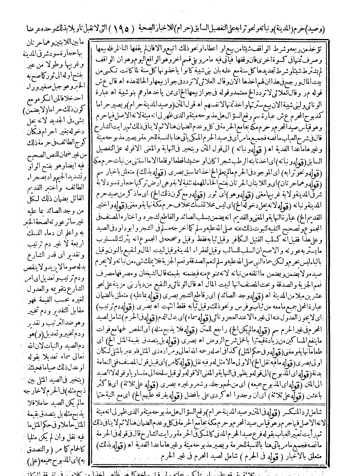 (قَوْلُهُ فِي الْمَتْنِ: وَصَيْدُ الْمَدِينَةِ حَرَامٌ) وَقَعَ السُّؤَالُ هَلْ مَذْبُوحُهُ مَيْتَةٌ وَاَلَّذِي ظَهَرَ لِي أَنَّهُ مَيْتَةٌ؛ لِأَنَّهُ الْأَصْلُ فِيمَا حَرُمَ وَهُوَ قِيَاسُ صَيْدِ الْمُحْرِمِ وَحَرَمُ مَكَّةَ بِجَامِعِ الْحُرْمَةِ فِي كُلٍّ وَعَدَمُ الضَّمَانِ هُنَا لِإِثْمٍ لَا يُنَافِي ذَلِكَ ثُمَّ رَأَيْت تَعْبِيرَ الْعُبَابِ بِقَوْلِهِ: فَرْعٌ: صَيْدُ الْحَرَمِ الْمَدَنِيِّ كَالْمَكِّيِّ فِي الْحُرْمَةِ وَرَأَيْت الشَّارِحَ قَالَ فِي قَوْلِهِ فِي الْحُرْمَةِ مَا نَصُّهُ فَجَمِيعُ مَا مَرَّ يَأْتِي هُنَا بِالنِّسْبَةِ لِلْحُرْمَةِ وَيَصِيرُ مَذْبُوحُهُ مَيْتَةً وَغَيْرُهَا مَا عَدَا الْفِدْيَةَ. اهـ.