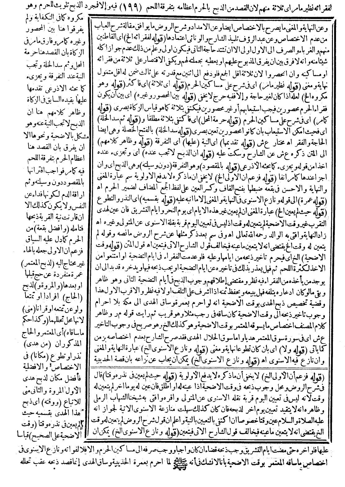 ـــــــــــــــــــــــــــــQوَعَنْ النِّهَايَةِ وَالْمُغْنِي مَا يُصَرِّحُ بِالِاخْتِصَاصِ أَيْضًا وَعَنْ الْإِمْدَادِ وَشَرْحِ الرَّوْضِ مَا يُوَافِقُ مَقَالَةَ شَرْحِ الْعُبَابِ مِنْ عَدَمِ الِاخْتِصَاصِ وَعَنْ عَبْدِ الرَّءُوفِ تِلْمِيذِ الشَّارِحِ وَالْوَنَّائِيِّ اعْتِمَادُهَا. (قَوْلُهُ: لِفُقَرَائِهِ إلَخْ) أَيْ الْقَاطِنِينَ مِنْهُمْ وَالْغُرَبَاءِ، وَالصَّرْفُ إلَى الْأَوَّلِ أَوْلَى إلَّا أَنْ تَشْتَدَّ حَاجَةُ الثَّانِي فَيَكُونُ أَوْلَى وَعُلِمَ مِنْ ذَلِكَ عَدَمُ جَوَازِ أَكْلِهِ شَيْئًا مِنْهُ، وَأَنَّهُ لَا فَرْقَ بَيْنَ أَنْ يُفَرِّقَ الْمَذْبُوحَ عَلَيْهِمْ أَوْ يُعْطِيَهُ بِجُمْلَتِهِ لَهُمْ وَيَكْفِي الِاقْتِصَارُ عَلَى ثَلَاثَةٍ مِنْ فُقَرَائِهِ أَوْ مَسَاكِينِهِ، وَإِنْ انْحَصَرُوا؛ لِأَنَّ الثَّلَاثَةَ أَقَلُّ الْجَمْعِ فَلَوْ دَفَعَ إلَى اثْنَيْنِ مَعَ قُدْرَتِهِ عَلَى ثَالِثٍ ضَمِنَ لَهُ أَقَلَّ مُتَمَوَّلٍ نِهَايَةٌ وَمُغْنِي (قَوْلُهُ: نَظِيرَ مَا مَرَّ) أَيْ فِي شَرْحٍ عَلَى مَسَاكِينِ الْحَرَمِ (قَوْلُهُ: أَيْ ثَلَاثَةٌ) أَيْ فَأَكْثَرُ (قَوْلُهُ: وَهُوَ مَكْرُوهٌ إلَخْ) لَعَلَّهُ إذَا كَانَ لِغَيْرِ حَاجَةٍ، وَإِلَّا فَفِيهِ حَرَجٌ لَا يَخْفَى (قَوْلُهُ: بَيْنَ الْمَحْصُورِ وَغَيْرِهِ) أَيْ بَيْنَ أَنْ يَكُونَ فُقَرَاءُ الْحَرَمِ مَحْصُورِينَ فَيَجِبُ اسْتِيعَابُهُمْ أَوْ غَيْرُ مَحْصُورِينَ فَيَكْتَفِي بِثَلَاثَةٍ كَمَا هُوَ قِيَاسُ الزَّكَاةِ بَصْرِيٌّ (قَوْلُهُ: كَمَا مَرَّ) أَيْ فِي شَرْحٍ عَلَى مَسَاكِينِ الْحَرَمِ (قَوْلُهُ: حُرْمَةُ الْمَحَلِّ) أَيْ فَاكْتَفَى بِثَلَاثَةٍ مُطْلَقًا (وَقَوْلُهُ: وَثَمَّ سَدُّ الْخَلَّةِ) أَيْ فَحَيْثُ أَمْكَنَ الِاسْتِيعَابُ بِأَنْ كَانُوا مَحْصُورِينَ تَعَيَّنَ بَصْرِيٌّ (قَوْلُهُ: سَدُّ الْخَلَّةِ) بِالْفَتْحِ الْخَصْلَةُ وَهِيَ أَيْضًا الْحَاجَةُ وَالْفَقْرُ. انْتَهَى مُخْتَارٌ اهـ ع ش.