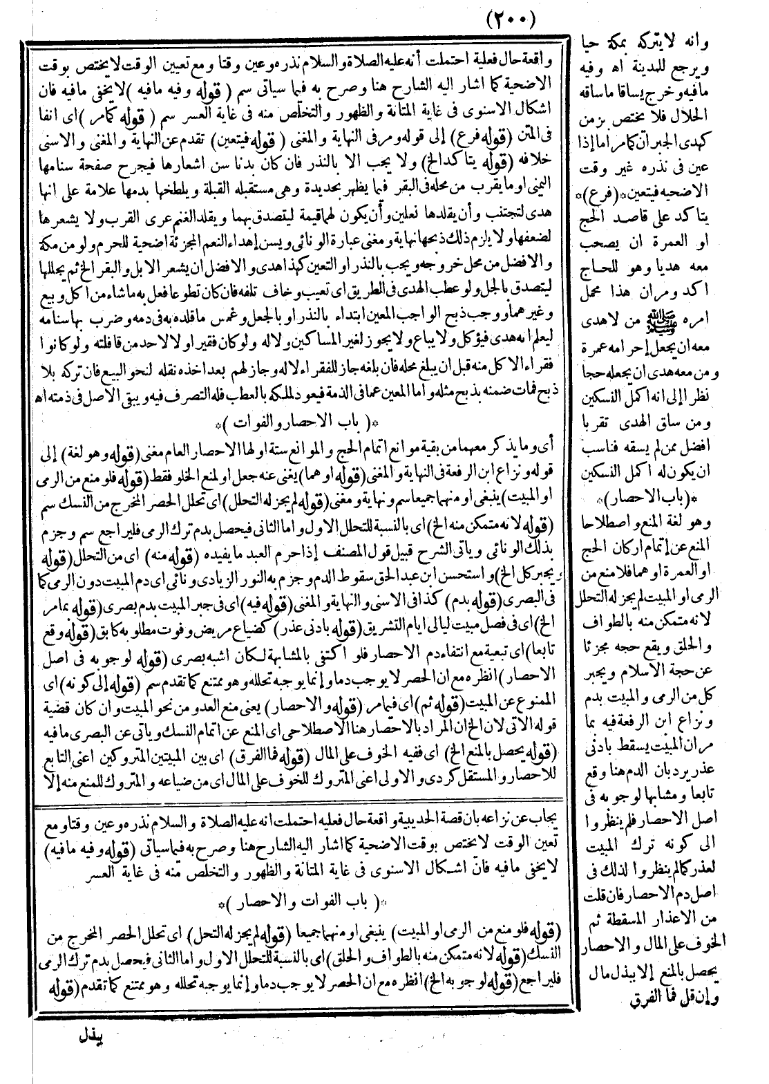(بَابُ الْإِحْصَارِ وَالْفَوَاتِ) أَيْ وَمَا يُذْكَرُ مَعَهُمَا مِنْ بَقِيَّةِ مَوَانِعِ إتْمَامِ الْحَجِّ وَالْمَوَانِعُ سِتَّةٌ أَوَّلُهَا الْإِحْصَارُ الْعَامُّ مُغْنِي (قَوْلُهُ: وَهُوَ لُغَةً) إلَى قَوْلِهِ وَنِزَاعُ ابْنِ الرِّفْعَةِ فِي النِّهَايَةِ وَالْمُغْنِي (قَوْلُهُ: أَوْ هُمَا) يُغْنِي عَنْهُ جُعْلٌ أَوْ لِمَنْعِ الْخُلُوِّ فَقَطْ (قَوْلُهُ: فَلَوْ مُنِعَ مِنْ الرَّمْيِ أَوْ الْمَبِيتِ) يَنْبَغِي أَوْ مِنْهُمَا جَمِيعًا سم وَنِهَايَةٌ وَمُغْنِي (قَوْلُهُ: لَمْ يَجُزْ لَهُ التَّحَلُّلُ) أَيْ تَحَلُّلِ الْحَصْرِ الْمُخْرِجِ مِنْ النُّسُكِ سم (قَوْلُهُ: لِأَنَّهُ مُتَمَكِّنٌ مِنْهُ إلَخْ) أَيْ بِالنِّسْبَةِ لِلتَّحَلُّلِ الْأَوَّلِ، وَأَمَّا الثَّانِي فَيَحْصُلُ بِدَمِ تَرْكِ الرَّمْيِ فَلْيُرَاجَعْ سم وَجَزَمَ بِذَلِكَ الْوَنَائِيُّ وَيَأْتِي فِي الشَّرْحِ قُبَيْلَ قَوْلِ الْمُصَنِّفِ إذْ أَحْرَمَ الْعَبْدُ مَا يُفِيدُهُ (قَوْلُهُ: مِنْهُ) أَيْ مِنْ التَّحَلُّلِ (قَوْلُهُ: وَيُجْبَرُ كُلٌّ إلَخْ) وَاسْتَحْسَنَ ابْنُ عَبْدِ الْحَقِّ سُقُوطَ الدَّمِ وَجَزَمَ بِهِ النُّورُ الزِّيَادِيِّ وَنَّائِيٌّ أَيْ دَمَ الْمَبِيتِ دُونَ الرَّمْيِ كَمَا فِي الْبَصْرِيِّ (قَوْلُهُ: بِدَمٍ) كَذَا فِي الْأَسْنَى وَالنِّهَايَةِ وَالْمُغْنِي (قَوْلُهُ: فِيهِ) أَيْ فِي جَبْرِ الْمَبِيتِ بِدَمٍ بَصْرِيٌّ (قَوْلُهُ: بِمَا مَرَّ إلَخْ) أَيْ فِي فَصْلِ مَبِيتِ لَيَالِي أَيَّامِ التَّشْرِيقِ (قَوْلُهُ: بِأَدْنَى عُذْرٍ) كَضَيَاعِ مَرِيضٍ وَفَوْتِ مَطْلُوبِهِ كَآبِقٍ (قَوْلُهُ: وَقَعَ تَابِعًا) أَيْ تَبَعِيَّةٌ مَعَ انْتِفَاءِ دَمِ الْإِحْصَارِ فَلَوْ اكْتَفَى بِالْمُشَابَهَةِ لَكَانَ أَشْبَهَ بَصْرِيٌّ (قَوْلُهُ: لِوُجُوبِهِ فِي أَصْلِ الْإِحْصَارِ) اُنْظُرْهُ مَعَ أَنَّ الْحَصْرَ لَا يُوجِبُ دَمًا، وَإِنَّمَا يُوجِبُهُ تَحَلُّلُهُ وَهُوَ مُمْتَنِعٌ كَمَا تَقَدَّمَ سم.
