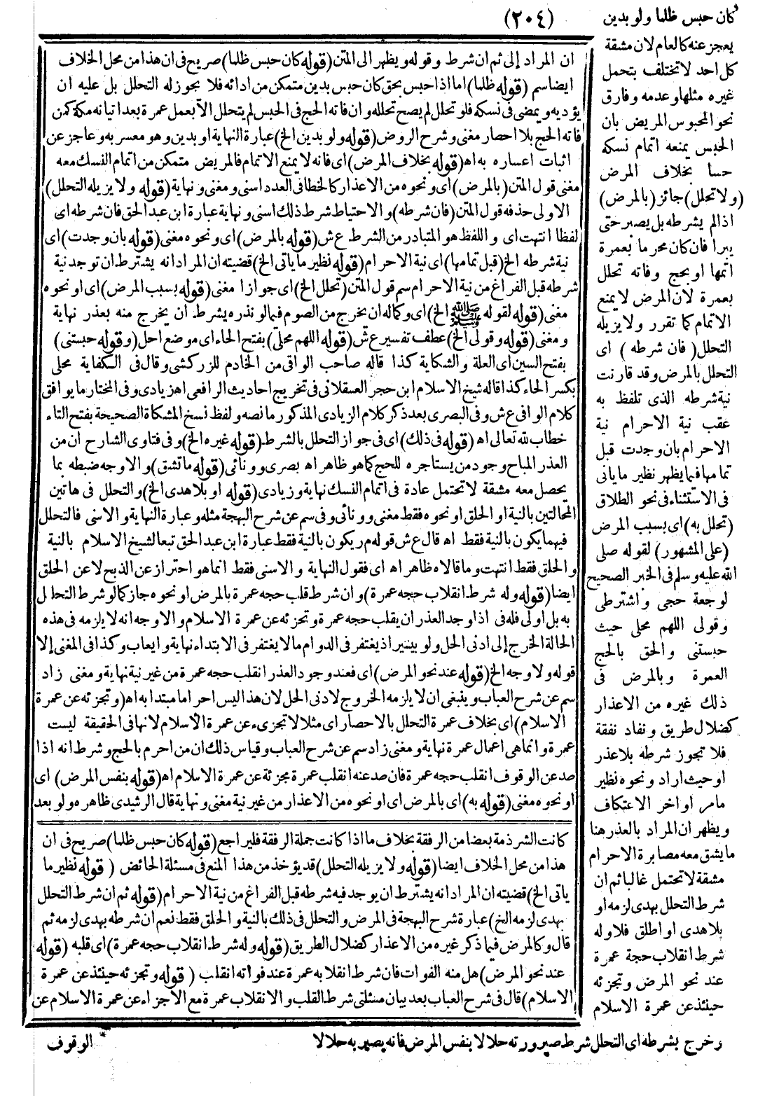 قَوْلُ الْمَتْنِ (بِالْمَرَضِ) أَيْ وَنَحْوِهِ مِنْ الْأَعْذَارِ كَالْخَطَإِ فِي الْعَدَدِ أَسْنَى وَمُغْنِي وَنِهَايَةٌ (قَوْلُهُ: وَلَا يُزِيلُهُ التَّحَلُّلُ) الْأَوْلَى حَذْفُهُ قَوْلَ الْمَتْنِ (فَإِنْ شَرَطَهُ إلَخْ) وَالِاحْتِيَاطُ شَرْطُ ذَلِكَ أَسْنَى وَنِهَايَةٌ عِبَارَةُ ابْنِ عَبْدِ الْحَقِّ فَإِنْ شَرَطَهُ أَيْ لَفْظًا انْتَهَتْ أَيْ وَاللَّفْظُ هُوَ الْمُتَبَادَرُ مِنْ الشَّرْطِ ع ش (قَوْلُهُ: بِالْمَرَضِ) أَيْ وَنَحْوِهِ مُغْنِي (قَوْلُهُ: بِأَنْ وُجِدَتْ) أَيْ نِيَّةُ شَرْطِهِ إلَخْ (قَبْلَ تَمَامِهَا) أَيْ نِيَّةِ الْإِحْرَامِ (قَوْلُهُ: نَظِيرَ مَا يَأْتِي إلَخْ) قَضِيَّتُهُ أَنَّ الْمُرَادَ أَنَّهُ يُشْتَرَطُ أَنْ تُوجَدَ نِيَّةُ شَرْطِهِ قَبْلَ الْفَرَاغِ مِنْ نِيَّةِ الْإِحْرَامِ سم قَوْلُ الْمَتْنِ (تَحَلَّلَ إلَخْ) أَيْ جَوَازًا مُغْنِي (قَوْلُهُ: بِسَبَبِ الْمَرَضِ) أَيْ أَوْ نَحْوِهِ مُغْنِي (قَوْلُهُ: لِقَوْلِهِ - صَلَّى اللَّهُ عَلَيْهِ وَسَلَّمَ - إلَخْ) أَيْ وَكَمَالُهُ أَنْ يَخْرُجَ مِنْ الصَّوْمِ فِيمَا لَوْ نَذَرَهُ بِشَرْطِ أَنْ يَخْرُجَ مِنْهُ بِعُذْرٍ نِهَايَةٌ وَمُغْنِي (قَوْلُهُ: وَقَوْلِيٌّ إلَخْ) عَطْفُ تَفْسِيرٍ ع ش (قَوْلُهُ: «اللَّهُمَّ مَحَلِّي» ) بِفَتْحِ الْحَاءِ أَيْ مَوْضِعُ أَحَلَّ (وَقَوْلُهُ: «حَبَسَتْنِي» ) بِفَتْحِ السِّينِ أَيْ الْعِلَّةُ وَالشِّكَايَةُ كَذَا قَالَهُ صَاحِبُ الْوَافِي مِنْ الْخَادِمِ لِلزَّرْكَشِيِّ وَقَالَ فِي الْكِفَايَةِ مَحِلِّي بِكَسْرِ الْحَاءِ كَذَا قَالَهُ شَيْخُ الْإِسْلَامِ ابْنِ حَجَرٍ الْعَسْقَلَانِيِّ فِي تَخْرِيجِ أَحَادِيثِ الرَّافِعِيِّ اهـ زِيَادِيٌّ وَفِي الْمُخْتَارِ مَا يُوَافِقُ كَلَامَ الْوَافِي ع ش وَفِي الْبَصْرِيِّ بَعْدَ ذِكْرِ كَلَامِ الزِّيَادِيِّ الْمَذْكُورِ مَا نَصَّهُ وَلَفْظُ نُسَخِ الْمِشْكَاةِ الصَّحِيحَةِ بِفَتْحِ التَّاءِ خِطَابٌ لِلَّهِ تَعَالَى. اهـ.