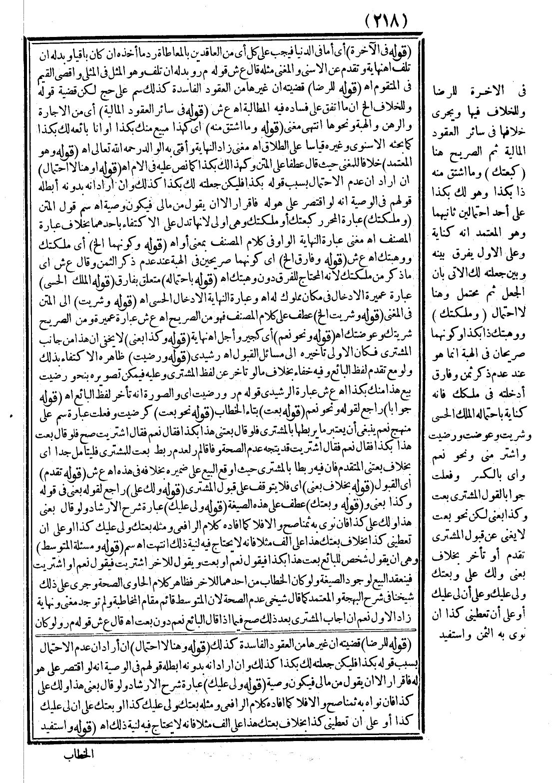فِي الْآخِرَةِ لِلرِّضَا وَلِلْخِلَافِ فِيهَا وَيَجْرِي خِلَافُهَا فِي سَائِرِ الْعُقُودِ الْمَالِيَّةِ ثُمَّ الصَّرِيحُ هُنَا (كَبِعْتُكَ) وَمَا اُشْتُقَّ مِنْهُ ذَا بِكَذَا، وَهُوَ لَك بِكَذَا عَلَى أَحَدِ احْتِمَالَيْنِ ثَانِيهِمَا، وَهُوَ الْمُعْتَمَدُ أَنَّهُ كِنَايَةٌ، وَعَلَى الْأَوَّلِ يُفَرَّقُ بَيْنَهُ وَبَيْنَ جَعَلْته لَك الْآتِي بِأَنَّ الْجُعْلَ ثَمَّ مُحْتَمَلٌ، وَهُنَا لَا احْتِمَالَ (وَمَلَّكْتُك) وَوَهَبْتُك ذَا بِكَذَا وَكَوْنُهُمَا صَرِيحَيْنِ فِي الْهِبَةِ إنَّمَا هُوَ عِنْدَ عَدَمِ ذِكْرِ ثَمَنٍ وَفَارَقَ أَدْخَلْته فِي مِلْكِك فَإِنَّهُ كِنَايَةٌ بِاحْتِمَالِهِ الْمِلْكَ الْحِسِّيَّ وَشَرَيْت وَعَوَّضْت وَرَضِيت وَاشْتَرِ مِنِّي وَنَحْوَ نَعَمْ، وَإِي بِالْكَسْرِ وَفَعَلْت جَوَابًا لِقَوْلِ الْمُشْتَرِي بِعْت وَكَذَا بِعْنِي لَكِنْ نَحْوُ بِعْت لَا يُغْنِي عَنْ قَبُولِ الْمُشْتَرِي تَقَدَّمَ أَوْ تَأَخَّرَ بِخِلَافِ بِعْنِي وَلَك عَلَيَّ وَبِعْتُك وَلِي عَلَيْك وَعَلَى أَنَّ لِي عَلَيْك أَوْ عَلَى أَنْ تُعْطِيَنِي كَذَا إنْ نَوَى بِهِ الثَّمَنَ وَاسْتُفِيدَ