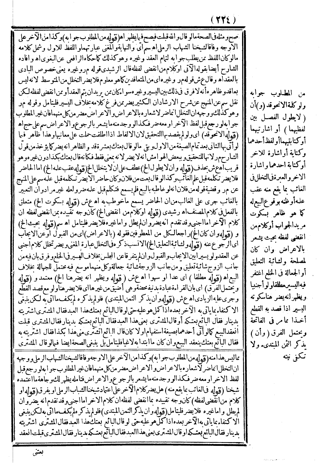مِنْ الْمَطْلُوبِ جَوَابُهُ وَلَوْ كَلِمَةً إلَّا نَحْوَ قَدْ (وَ) أَنْ (لَا يَطُولَ الْفَصْلُ بَيْنَ لَفْظَيْهِمَا) أَوْ إشَارَتَيْهِمَا أَوْ كِتَابَتَيْهِمَا أَوْ لَفْظِ أَحَدِهِمَا وَكِتَابَةِ أَوْ إشَارَةِ الْآخَرِ أَوْ كِتَابَةِ أَحَدِهِمَا، وَإِشَارَةِ الْآخَرِ وَالْعِبْرَةُ فِي التَّخَلُّلِ فِي الْغَائِبِ بِمَا يَقَعُ مِنْهُ عَقِبَ عِلْمِهِ أَوْ ظَنِّهِ بِوُقُوعِ الْبَيْعِ لَهُ كَمَا هُوَ ظَاهِرٌ بِسُكُوتِ مُرِيدِ الْجَوَابِ أَوْ كَلَامِ مَنْ انْقَضَى لَفْظُهُ بِحَيْثُ يُشْعِرُ بِالْإِعْرَاضِ، وَإِنْ كَانَ لِمَصْلَحَةٍ وَلِشَائِبَةِ التَّعْلِيقِ أَوْ الْجَعَالَةِ فِي الْخُلْعِ اُغْتُفِرَ فِيهِ الْيَسِيرُ مُطْلَقًا وَلَوْ أَجْنَبِيًّا وَيَظْهَرُ أَنَّهُ يَضُرُّ هُنَا سُكُوتُهُ الْيَسِيرُ إذَا قَصَدَ بِهِ الْقَطْعَ أَخْذًا مِمَّا مَرَّ فِي الْفَاتِحَةِ، وَيُحْتَمَلُ الْفَرْقُ (وَأَنْ) يَذْكُرَ الثَّمَنَ الْمُبْتَدِئُ وَلَا تَكْفِي نِيَّتُهُ