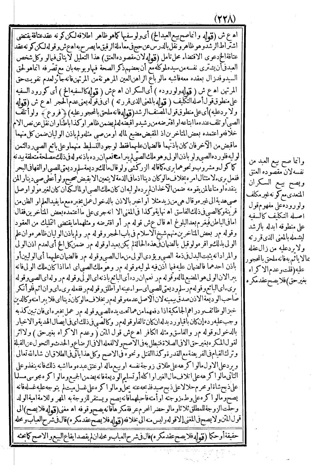 ـــــــــــــــــــــــــــــQاهـ. ع ش (قَوْلُهُ: وَإِنَّمَا صَحَّ بَيْعُ الْعَبْدِ إلَخْ) أَيْ وَلَوْ سَفِيهًا كَمَا هُوَ ظَاهِرُ إطْلَاقِهِ لَكِنَّ كَوْنَهُ عَقْدَ عَتَاقَةٍ يَقْتَضِي اشْتِرَاطَ الرُّشْدِ، وَهُوَ ظَاهِرٌ وَنُقِلَ بِالدَّرْسِ عَنْ حَجّ فِي مُعَامَلَةِ الرَّقِيقِ مَا يُصَرِّحُ بِهِ. اهـ. ع ش، وَقَوْلُهُ: لَكِنَّ كَوْنَهُ عَقْدَ عَتَاقَةٍ إلَخْ دَعْوَى الِاقْتِضَاءِ مَحَلُّ تَأَمُّلٍ (قَوْلُهُ: لِأَنَّ مَقْصُودَهُ الْعِتْقُ) هَذَا التَّعْلِيلُ لَا يَتَأَتَّى فِيمَا لَوْ وَكَّلَ شَخْصٌ الْعَبْدَ فِي أَنْ يَشْتَرِيَ نَفْسَهُ مِنْ سَيِّدِهِ لِمُوَكِّلِهِ مَعَ أَنَّ بَعْضَهُمْ ذَكَرَ الصِّحَّةَ فِيهَا وَيُوَجَّهُ بِأَنَّ مَنْعَ تَصَرُّفِهِ إنَّمَا هُوَ لِحَقِّ السَّيِّدِ، وَقَدْ زَالَ بِعَقْدِهِ مَعَهُ فَأَشْبَهَ مَا لَوْ بَاعَ الرَّاهِنُ الْعَيْنَ الْمَرْهُونَةَ مِنْ الْمُرْتَهِنِ فَإِنَّهُ جَائِزٌ لِعَدَمِ تَفْوِيتِ حَقِّ الْمُرْتَهِنِ. اهـ. ع ش (قَوْلُهُ: وَلِوُرُودِهِ) أَيْ السَّكْرَانِ. اهـ. ع ش (قَوْلُهُ: كَالسَّفِيهِ إلَخْ) أَيْ كَوُرُودِ السَّفِيهِ عَلَى مَنْطُوقِ قَوْلِ أَصْلِهِ التَّكْلِيفَ (قَوْلُهُ: بِالْمَعْنَى الَّذِي قَرَّرْته) أَيْ فِي قَوْلِهِ يَعْنِي عَدَمَ الْحَجْرِ. اهـ. ع ش (قَوْلُهُ: وَلَا يَرِدُ عَلَيْهِ) أَيْ عَلَى مَنْطُوقِ قَوْلِ الْمُصَنِّفِ الرُّشْدُ (قَوْلُهُ: فَإِنَّهُ مُلْحَقٌ بِالْمَحْجُورِ عَلَيْهِ) .