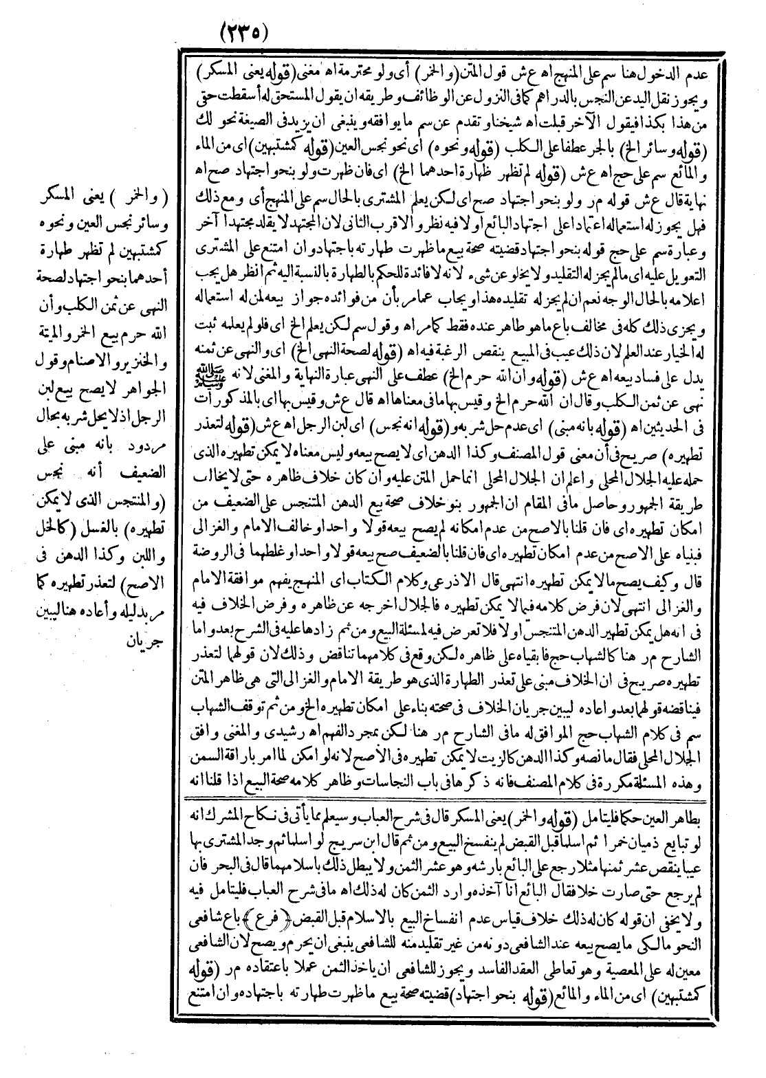 (وَالْخَمْرِ) يَعْنِي الْمُسْكِرَ وَسَائِرَ نَجِسِ الْعَيْنِ وَنَحْوَهُ كَمُشْتَبَهَيْنِ لَمْ تَظْهَرْ طَهَارَةُ أَحَدِهِمَا بِنَحْوِ اجْتِهَادٍ لِصِحَّةِ النَّهْيِ عَنْ ثَمَنِ الْكَلْبِ، وَأَنَّ اللَّهَ حَرَّمَ بَيْعَ الْخَمْرِ وَالْمَيْتَةِ وَالْخِنْزِيرِ وَالْأَصْنَامِ، وَقَوْلُ الْجَوَاهِرِ لَا يَصِحُّ بَيْعُ لَبَنِ الرَّجُلِ إذْ لَا يَحِلُّ شُرْبُهُ بِحَالٍ مَرْدُودٌ بِأَنَّهُ مَبْنِيٌّ عَلَى الضَّعِيفِ أَنَّهُ نَجِسٌ (وَالْمُتَنَجِّسُ الَّذِي لَا يُمْكِنُ تَطْهِيرُهُ) بِالْغُسْلِ (كَالْخَلِّ وَاللَّبَنِ وَكَذَا الدُّهْنُ فِي الْأَصَحِّ) لِتَعَذُّرِ تَطْهِيرِهِ كَمَا مَرَّ بِدَلِيلِهِ، وَأَعَادَهُ هُنَا لِيُبَيِّنَ جَرَيَانَ