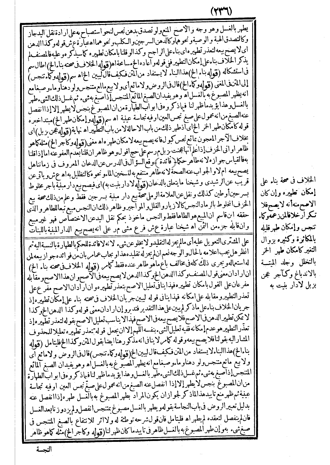 ـــــــــــــــــــــــــــــSعَلَى الْمُشْتَرِي التَّعْوِيلُ عَلَيْهِ أَيْ مَا لَمْ يَجُزْ لَهُ التَّقْلِيدُ وَلَا يَخْلُو عَنْ شَيْءٍ؛ لِأَنَّهُ لَا فَائِدَةَ لِلْحُكْمِ بِالطَّهَارَةِ بِالنِّسْبَةِ إلَيْهِ ثُمَّ اُنْظُرْ هَلْ يَجِبُ إعْلَامُهُ بِالْحَالِ وَالْوَجْهُ نَعَمْ إنْ لَمْ يَجُزْ لَهُ تَقْلِيدُهُ هَذَا وَيُجَابُ عَمَّا مَرَّ بِأَنَّ مِنْ فَوَائِدِهِ جَوَازَ بَيْعِهِ لِمَنْ لَهُ اسْتِعْمَالُهُ وَيَجْرِي ذَلِكَ كُلُّهُ فِي مُخَالِفٍ بَاعَ مَا هُوَ طَاهِرٌ عِنْدَهُ فَقَطْ كَمَا مَرَّ (قَوْلُهُ: الْخِلَافُ فِي صِحَّتِهِ بِنَاءً إلَخْ) إنْ أَرَادَ أَنَّ مَعْنَى قَوْلِ الْمُصَنِّفِ وَكَذَا الدُّهْنُ إلَخْ وَكَذَا الدُّهْنُ لَا يَصِحُّ بَيْعُهُ فِي الْأَصَحِّ، وَأَنَّ هَذَا الْأَصَحَّ وَمُقَابِلَهُ مُفَرَّعَانِ عَلَى الْقَوْلِ بِإِمْكَانِ تَطْهِيرِهِ فَهَذَا يُنَافِي تَعْلِيلَ الْأَصَحِّ بِتَعَذُّرِ تَطْهِيرِهِ، وَإِنْ أَرَادَ أَنَّ الْأَصَحَّ مُفَرَّعٌ عَلَى تَعَذُّرِ التَّطْهِيرِ وَمُقَابِلُهُ عَلَى إمْكَانِهِ فَهَذَا يُنَافِي تَعْلِيلَ قَوْلِهِ لِيُبَيِّنَ جَرَيَانَ الْخِلَافِ فِي صِحَّتِهِ بِنَاءً عَلَى إمْكَانِ تَطْهِيرِهِ إذْ جَرَيَانُ الْخِلَافِ بِنَاءً عَلَى مَا ذُكِرَ لَمْ يُبَيِّنْ عَلَى هَذَا التَّقْدِيرِ فَتَدَبَّرْ إنْ أَرَادَ أَنَّ مَعْنَى قَوْلِهِ وَكَذَا الدُّهْنُ إلَخْ وَكَذَا لَا يُمْكِنُ تَطْهِيرُ الدُّهْنِ فِي الْأَصَحِّ فَلَا يَصِحُّ بَيْعُهُ فِي الْأَصَحِّ فَهَذَا لَا يُنَاسِبُ تَعْلِيلَ الْأَصَحِّ بِقَوْلِهِ لِتَعَذُّرِ تَطْهِيرِهِ إذْ تَعَذُّرُ التَّطْهِيرِ هُوَ عَدَمُ إمْكَانِهِ فَفِيهِ تَعْلِيلُ الشَّيْءِ بِنَفْسِهِ اللَّهُمَّ إلَّا أَنْ يُجْعَلَ قَوْلُهُ: لِتَعَذُّرِ تَطْهِيرِهِ تَعْلِيلًا لِلْمَحْذُوفِ الْمُشَارِ إلَيْهِ بِقَوْلِنَا فَلَا يَصِحُّ بَيْعُهُ، وَقَوْلُهُ: كَمَا مَرَّ لَا يُنَافِي أَنَّهُ مَذْكُورٌ هُنَا أَيْضًا بِقَوْلِ الْمَتْنِ وَكَذَا إلَخْ فَلْيُتَأَمَّلْ.