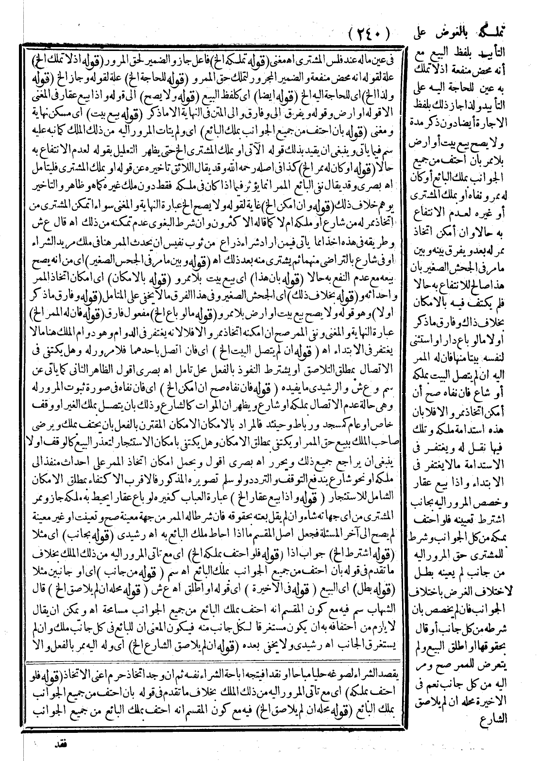 تَمَلُّكُهُ بِالْعِوَضِ عَلَى التَّأْبِيدِ بِلَفْظِ الْبَيْعِ مَعَ أَنَّهُ مَحْضُ مَنْفَعَةٍ إذْ لَا تُمْلَكُ بِهِ عَيْنٌ لِلْحَاجَةِ إلَيْهِ عَلَى التَّأْبِيدِ وَلِذَا جَازَ ذَلِكَ بِلَفْظِ الْإِجَارَةِ أَيْضًا دُونَ ذِكْرِ مُدَّةٍ وَلَا يَصِحُّ بَيْعُ بَيْتٍ أَوْ أَرْضٍ بِلَا مَمَرٍّ بِأَنْ احْتَفَّ مِنْ جَمِيعِ الْجَوَانِبِ بِمِلْكِ الْبَائِعِ أَوْ كَانَ لَهُ مَمَرٌّ وَنَفَاهُ أَوْ بِمِلْكِ الْمُشْتَرِي أَوْ غَيْرِهِ لِعَدَمِ الِانْتِفَاعِ بِهِ حَالًا، وَإِنْ أَمْكَنَ اتِّخَاذُ مَمَرٍّ لَهُ بَعْدُ وَيُفَرَّقُ بَيْنَهُ وَبَيْنَ مَا مَرَّ فِي الْجَحْشِ الصَّغِيرِ بِأَنَّ هَذَا صَالِحٌ لِلِانْتِفَاعِ بِهِ حَالًا فَلَمْ يُكْتَفَ فِيهِ بِالْإِمْكَانِ بِخِلَافِ ذَاكَ وَفَارَقَ مَا ذُكِرَ أَوَّلًا مَا لَوْ بَاعَ دَارًا وَاسْتَثْنَى لِنَفْسِهِ بَيْتًا مِنْهَا فَإِنَّ لَهُ الْمَمَرَّ إلَيْهِ إنْ لَمْ يَتَّصِلْ الْبَيْتُ بِمِلْكِهِ أَوْ شَارِعٍ فَإِنْ نَفَاهُ صَحَّ إنْ أَمْكَنَ اتِّخَاذُ مَمَرٍّ، وَإِلَّا فَلَا بِأَنَّ هَذِهِ اسْتِدَامَةُ مِلْكِهِ وَتِلْكَ فِيهَا نَقْلٌ لَهُ وَيُغْتَفَرُ فِي الِاسْتِدَامَةِ مَا لَا يُغْتَفَرُ فِي الِابْتِدَاءِ، وَإِذَا بِيعَ عَقَارٌ وَخُصِّصَ الْمُرُورُ إلَيْهِ بِجَانِبٍ اُشْتُرِطَ تَعْيِينُهُ فَلَوْ احْتَفَّ بِمِلْكِهِ مِنْ كُلِّ الْجَوَانِبِ وَشَرَطَ لِلْمُشْتَرِي حَقَّ الْمُرُورِ إلَيْهِ مِنْ جَانِبٍ لَمْ يُعَيِّنْهُ بَطَلَ لِاخْتِلَافِ الْغَرَضِ بِاخْتِلَافِ الْجَوَانِبِ فَإِنْ لَمْ يُخَصِّصْ بِأَنْ شَرَطَهُ مِنْ كُلِّ جَانِبٍ أَوْ قَالَ بِحُقُوقِهَا أَوْ أَطْلَقَ الْبَيْعَ وَلَمْ يَتَعَرَّضْ لِلْمَمَرِّ صَحَّ وَمَرَّ إلَيْهِ مِنْ كُلِّ جَانِبٍ نَعَمْ فِي الْأَخِيرَةِ مَحَلُّهُ إنْ لَمْ يُلَاصِقْ الشَّارِعَ