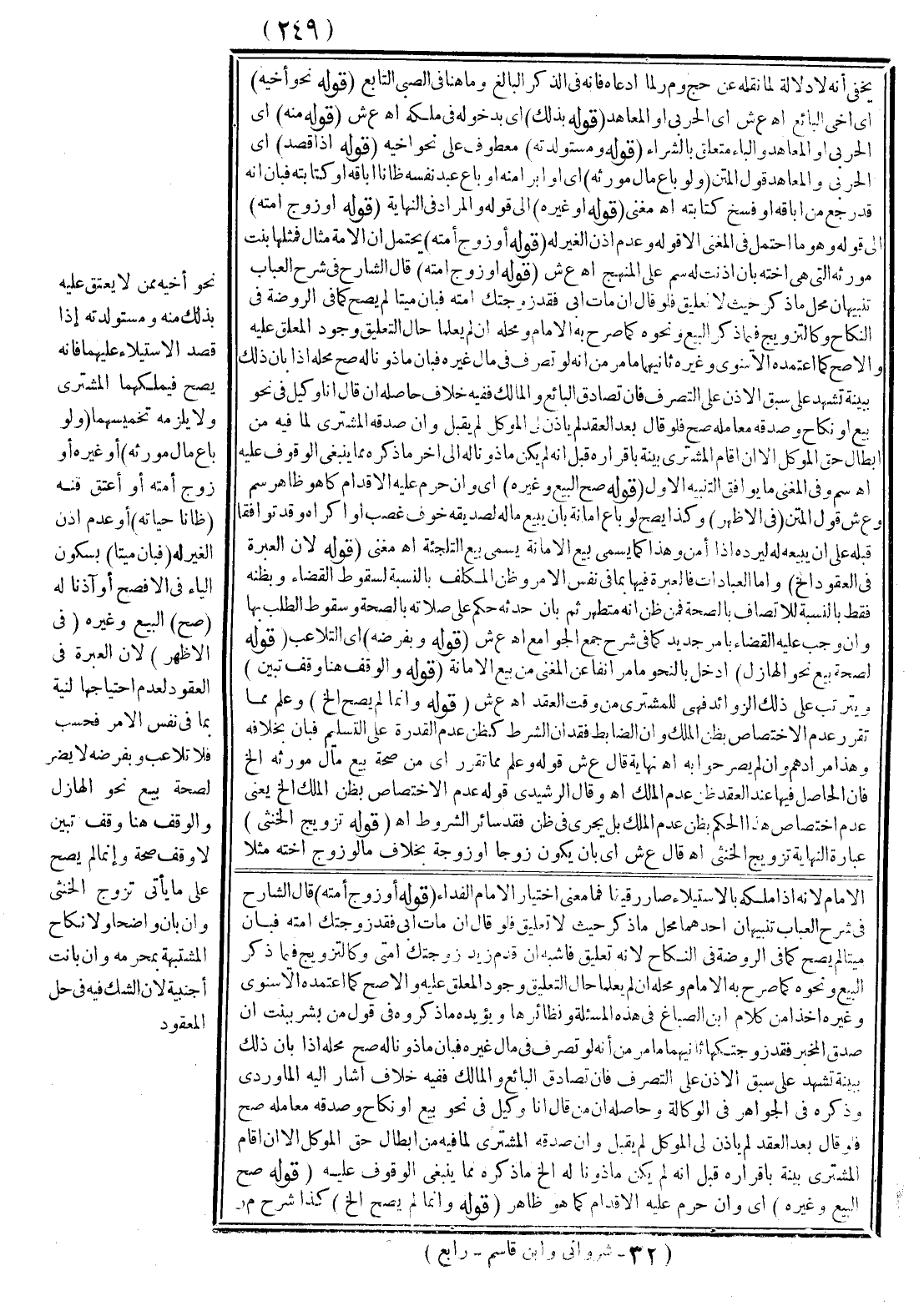 ثَانِيهِمَا مَا مَرَّ مِنْ أَنَّهُ لَوْ تَصَرَّفَ فِي مَالِ غَيْرِهِ فَبَانَ مَأْذُونًا لَهُ صَحَّ مَحَلُّهُ إذَا بَانَ ذَلِكَ بِبَيِّنَةٍ تَشْهَدُ عَلَى سَبْقِ الْإِذْنِ عَلَى التَّصَرُّفِ فَإِنْ تَصَادَقَ الْبَائِعُ وَالْمَالِكُ فَفِيهِ خِلَافٌ حَاصِلُهُ إنْ قَالَ أَنَا وَكِيلٌ فِي نَحْوِ بَيْعٍ أَوْ نِكَاحٍ وَصَدَّقَهُ مُعَامِلُهُ صَحَّ فَلَوْ قَالَ بَعْدَ الْعَقْدِ لَمْ يَأْذَنْ لِي الْمُوَكِّلُ لَمْ يُقْبَلْ، وَإِنْ صَدَّقَهُ الْمُشْتَرِي لِمَا فِيهِ مِنْ إبْطَالِ حَقِّ الْمُوَكِّلِ إلَّا إنْ أَقَامَ الْمُشْتَرِي بَيِّنَةً بِإِقْرَارِهِ قَبْلُ أَنَّهُ لَمْ يَكُنْ مَأْذُونًا لَهُ إلَى آخِرِ مَا ذَكَرَهُ مِمَّا يَنْبَغِي الْوُقُوفُ عَلَيْهِ. اهـ. سم وَفِي الْمُغْنِي مَا يُوَافِقُ التَّنْبِيهَ الْأَوَّلَ.