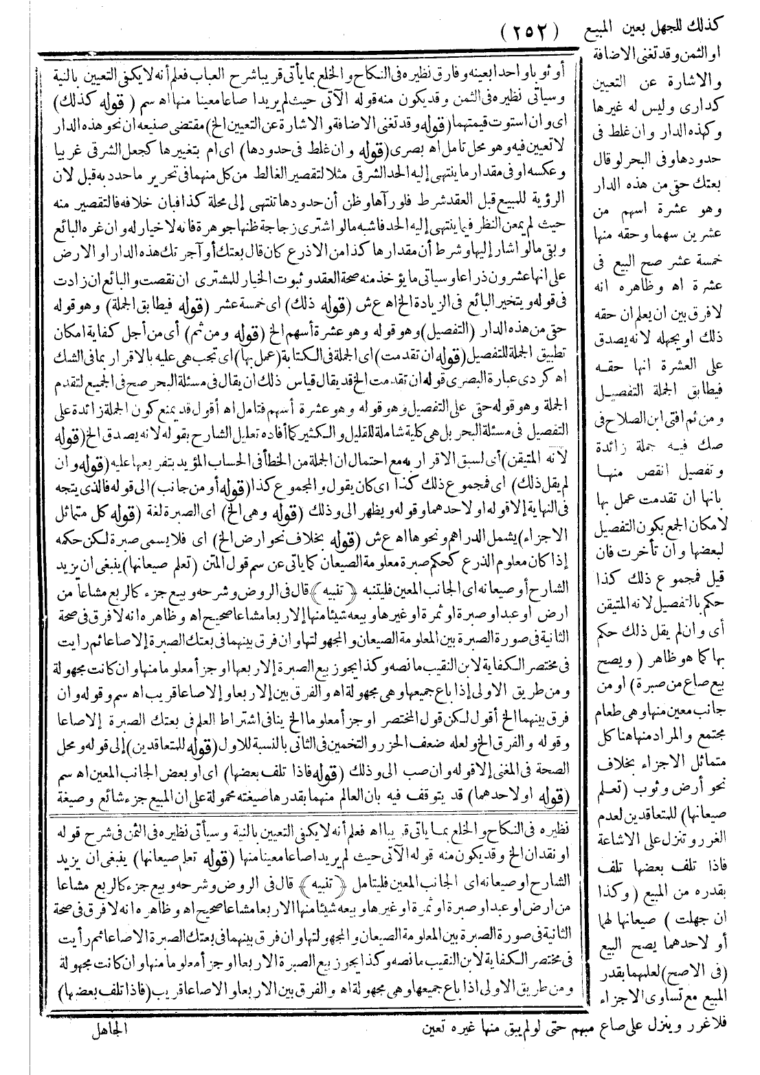 (تَنْبِيهٌ) قَالَ فِي الرَّوْضِ وَشَرْحِهِ وَبَيْعُ جُزْءٍ كَالرُّبُعِ مُشَاعًا مِنْ أَرْضٍ أَوْ عَبْدٍ أَوْ صُبْرَةٍ أَوْ ثَمَرَةٍ أَوْ غَيْرِهَا وَبَيْعُهُ شَيْئًا مِنْهَا إلَّا رُبُعًا مُشَاعًا صَحِيحٌ. انْتَهَى. وَظَاهِرُهُ أَنَّهُ لَا فَرْقَ فِي صِحَّةِ الثَّانِيَةِ فِي صُورَةِ الصُّبْرَةِ بَيْنَ الْمَعْلُومَةِ الصِّيعَانِ والمجهولتها، وَإِنْ فَرَّقَ بَيْنَهُمَا فِي بِعْتُك الصُّبْرَةَ إلَّا صَاعًا ثُمَّ رَأَيْت فِي مُخْتَصَرِ الْكِفَايَةِ لِابْنِ النَّقِيبِ مَا نَصُّهُ وَكَذَا يَجُوزُ بَيْعُ الصُّبْرَةِ إلَّا رُبُعَهَا أَوْ جُزْءًا مَعْلُومًا مِنْهَا، وَإِنْ كَانَتْ مَجْهُولَةً وَمِنْ طَرِيقِ الْأَوْلَى إذَا بَاعَ جَمِيعَهَا، وَهِيَ مَجْهُولَةٌ. اهـ.