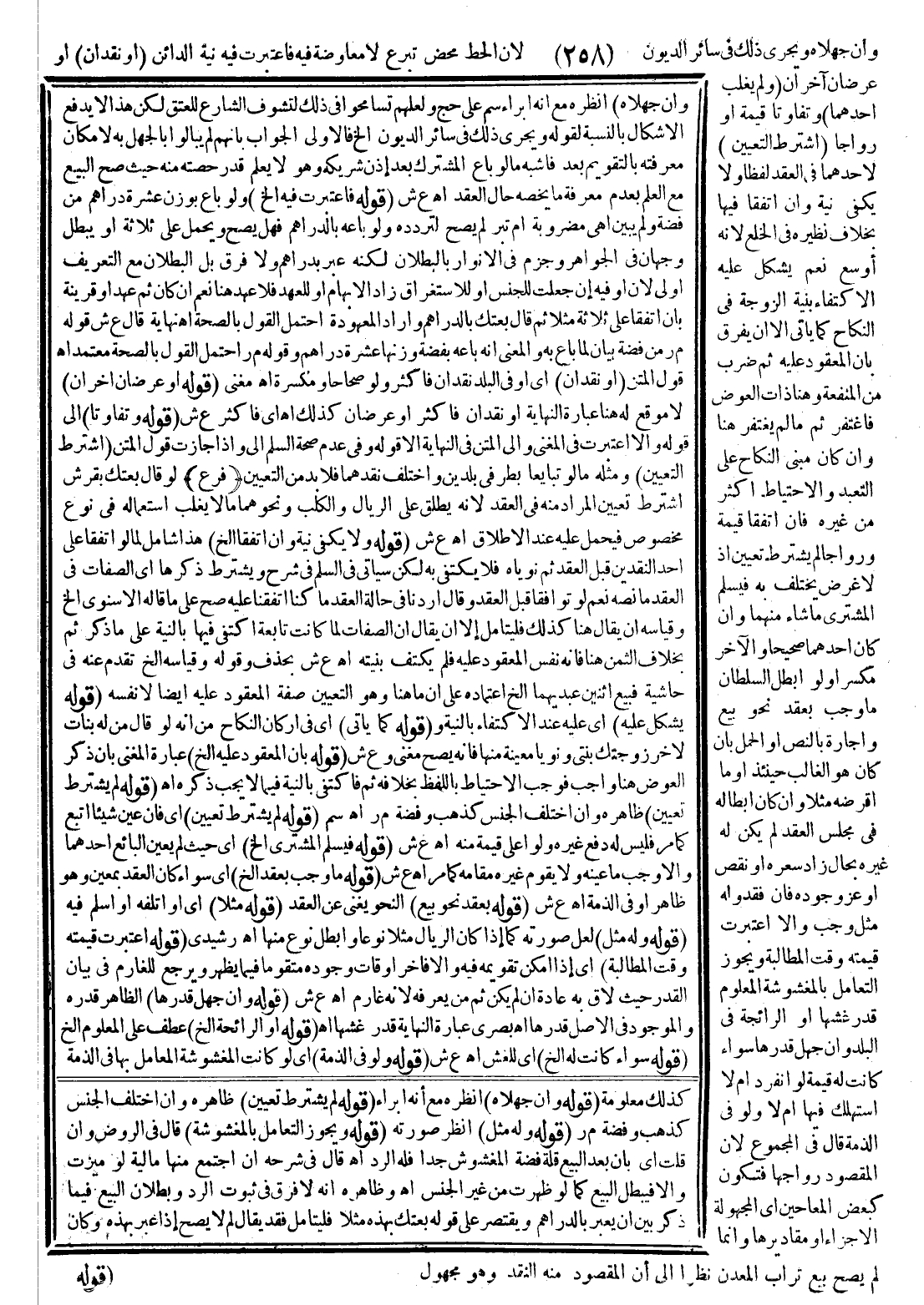 وَيَجْرِي ذَلِكَ فِي سَائِرِ الدُّيُونِ؛ لِأَنَّ الْحَطَّ مَحْضُ تَبَرُّعٍ لَا مُعَاوَضَةَ فِيهِ فَاعْتُبِرَتْ فِيهِ نِيَّةُ الدَّائِنِ (أَوْ نَقْدَانِ) أَوْ عَرْضَانِ آخَرَانِ (وَلَمْ يَغْلِبْ أَحَدُهُمَا) وَتَفَاوَتَا قِيمَةً أَوْ رَوَاجًا (اُشْتُرِطَ التَّعْيِينُ) لِأَحَدِهِمَا فِي الْعَقْدِ لَفْظًا وَلَا يَكْفِي نِيَّةٌ، وَإِنْ اتَّفَقَا فِيهَا بِخِلَافِ نَظِيرِهِ فِي الْخُلْعِ؛ لِأَنَّهُ أَوْسَعُ نَعَمْ يُشْكِلُ عَلَيْهِ الِاكْتِفَاءُ بِنِيَّةِ الزَّوْجَةِ فِي النِّكَاحِ كَمَا يَأْتِي إلَّا أَنْ يُفَرَّقَ بِأَنَّ الْمَعْقُودَ عَلَيْهِ ثَمَّ ضَرْبٌ مِنْ الْمَنْفَعَةِ، وَهُنَا ذَاتُ الْعِوَضِ فَاغْتُفِرَ ثَمَّ مَا لَمْ يُغْتَفَرْ هُنَا.