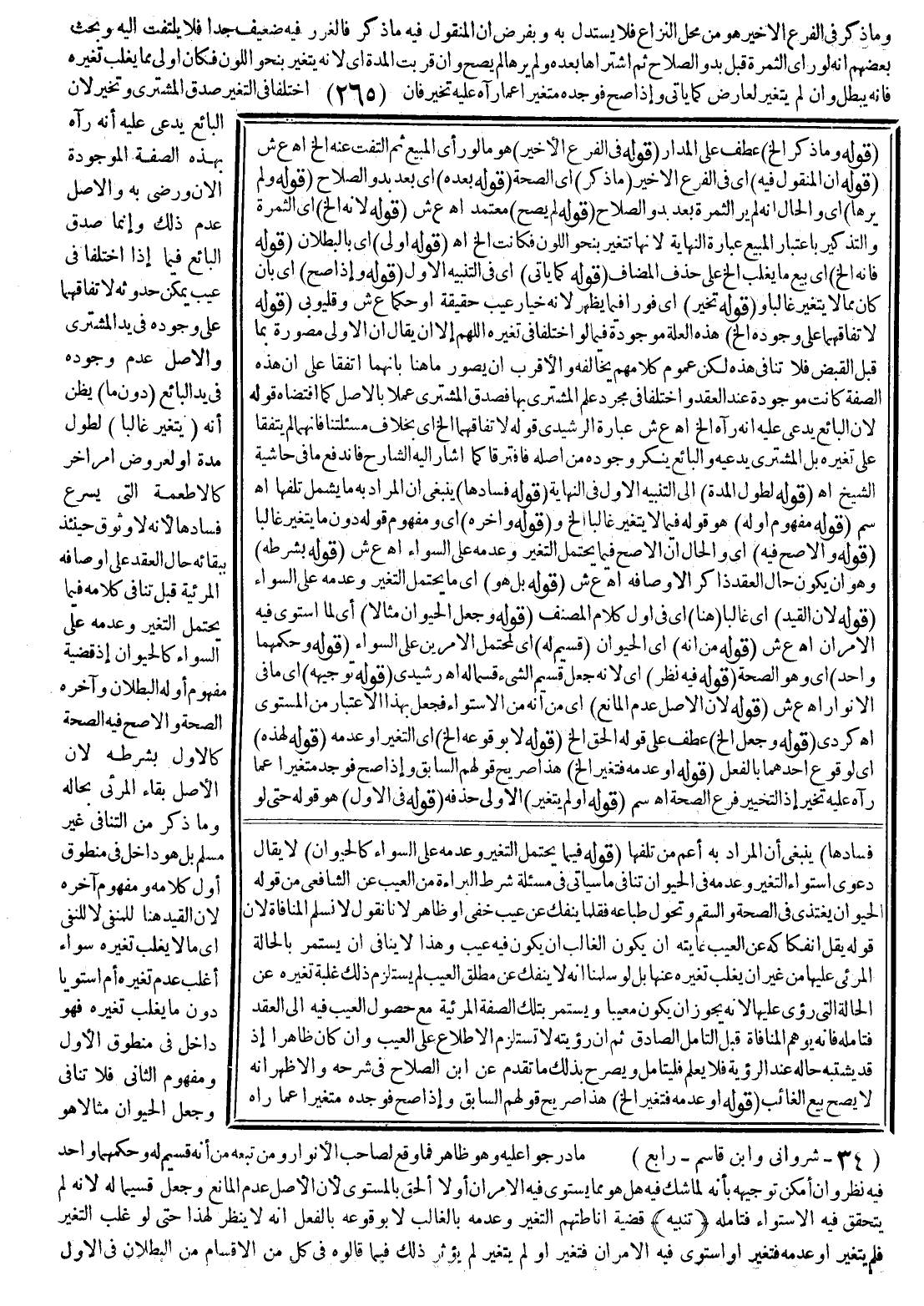 ـــــــــــــــــــــــــــــSفَسَادُهَا) يَنْبَغِي أَنَّ الْمُرَادَ بِهِ أَعَمُّ مِنْ تَلَفِهَا (قَوْلُهُ: فِيمَا يَحْتَمِلُ التَّغَيُّرَ وَعَدَمَهُ عَلَى السَّوَاءِ كَالْحَيَوَانِ) لَا يُقَالُ دَعْوَى اسْتِوَاءِ التَّغَيُّرِ وَعَدَمِهِ فِي الْحَيَوَانِ تُنَافِي مَا سَيَأْتِي فِي مَسْأَلَةِ شَرْطِ الْبَرَاءَةِ مِنْ الْعَيْبِ عَنْ الشَّافِعِيِّ مِنْ قَوْلِهِ الْحَيَوَانُ يَغْتَذِي فِي الصِّحَّةِ وَالسَّقَمِ وَتُحَوَّلُ طِبَاعُهُ فَقَلَّمَا يَنْفَكُّ عَنْ عَيْبٍ خَفِيٍّ أَوْ ظَاهِرٍ؛ لِأَنَّا نَقُولُ لَا نُسَلِّمُ الْمُنَافَاةَ؛ لِأَنَّ قَوْلَهُ يَقِلُّ انْفِكَاكُهُ عَنْ الْعَيْبِ غَايَتُهُ أَنْ يَكُونَ الْغَالِبُ أَنْ يَكُونَ فِيهِ عَيْبٌ، وَهَذَا لَا يُنَافِي أَنْ يَسْتَمِرَّ بِالْحَالَةِ الْمَرْئِيِّ عَلَيْهَا مِنْ غَيْرِ أَنْ يَغْلِبَ تَغَيُّرُهُ عَنْهَا بَلْ لَوْ سَلَّمْنَا أَنَّهُ لَا يَنْفَكُّ عَنْ مُطْلَقِ الْعَيْبِ لَمْ يَسْتَلْزِمْ ذَلِكَ غَلَبَةَ تَغَيُّرِهِ عَنْ الْحَالَةِ الَّتِي رُئِيَ عَلَيْهَا؛ لِأَنَّهُ يَجُوزُ أَنْ يَكُونَ مَعِيبًا وَيَسْتَمِرُّ بِتِلْكَ الصِّفَةِ الْمَرْئِيَّةِ مَعَ حُصُولِ الْعَيْبِ فِيهِ إلَى الْعَقْدِ فَتَأَمَّلْهُ فَإِنَّهُ يُوهِمُ الْمُنَافَاةَ قَبْلَ التَّأَمُّلِ الصَّادِقِ ثُمَّ إنَّ رُؤْيَتَهُ لَا تَسْتَلْزِمُ الِاطِّلَاعَ عَلَى الْعَيْبِ، وَإِنْ كَانَ ظَاهِرًا إذْ قَدْ يُشْتَبَهُ حَالُهُ عِنْدَ الرُّؤْيَةِ فَلَا يُعْلَمُ فَلْيُتَأَمَّلْ.