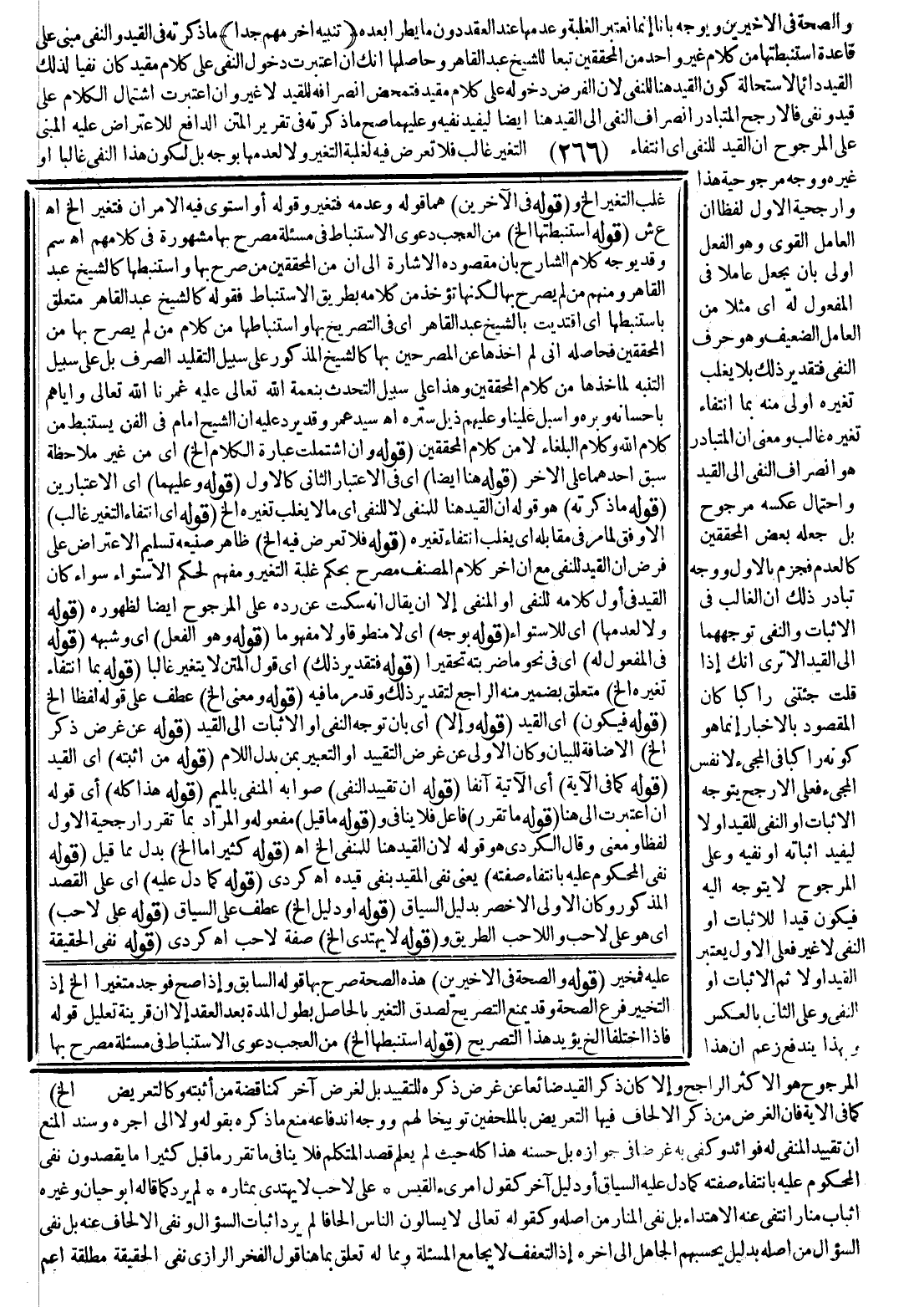 (تَنْبِيهٌ آخَرُ مُهِمٌّ جِدًّا) مَا ذَكَرْته فِي الْقَيْدِ وَالنَّفْيِ مَبْنِيٌّ عَلَى قَاعِدَةٍ اسْتَنْبَطْتهَا مِنْ كَلَامِ غَيْرِ وَاحِدٍ مِنْ الْمُحَقِّقِينَ تَبَعًا لِلشَّيْخِ عَبْدِ الْقَاهِرِ وَحَاصِلُهَا أَنَّك إنْ اعْتَبَرْت دُخُولَ النَّفْيِ عَلَى كَلَامٍ مُقَيَّدٍ كَانَ نَفْيًا لِذَلِكَ الْقَيْدِ دَائِمًا لِاسْتِحَالَةِ كَوْنِ الْقَيْدِ هُنَا لِلنَّفْيِ؛ لِأَنَّ الْفَرْضَ دُخُولُهُ عَلَى كَلَامٍ مُقَيَّدٍ فَتَمَحَّضَ انْصِرَافُهُ لِلْقَيْدِ لَا غَيْرُ، وَإِنْ اعْتَبَرْت اشْتِمَالَ الْكَلَامِ عَلَى قَيْدٍ وَنَفْيٍ فَالْأَرْجَحُ الْمُتَبَادَرُ انْصِرَافُ النَّفْيِ إلَى الْقَيْدِ هُنَا أَيْضًا لِيُفِيدَ نَفْيَهُ وَعَلَيْهِمَا صَحَّ مَا ذَكَرْته فِي تَقْرِيرِ الْمَتْنِ الدَّافِعِ لِلِاعْتِرَاضِ عَلَيْهِ الْمَبْنِيِّ عَلَى الْمَرْجُوحِ أَنَّ الْقَيْدَ لِلنَّفْيِ أَيْ انْتِفَاءَ التَّغَيُّرِ غَالِبٌ فَلَا تَعَرُّضَ فِيهِ لِغَلَبَةِ التَّغَيُّرِ وَلَا لِعَدَمِهَا بِوَجْهٍ بَلْ لِكَوْنِ هَذَا النَّفْيِ غَالِبًا أَوْ غَيْرَهُ.