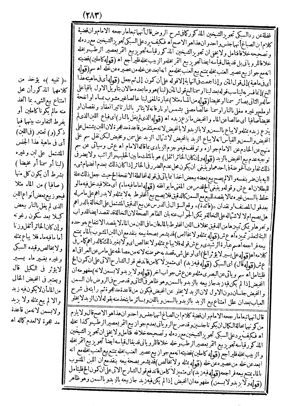 (قَوْلُهُ: فَالنَّقْصُ أَوْضَحُ إلَخْ) أَيْ فَلِكَوْنِ النَّقْصِ مَعْلُومًا لِكُلِّ أَحَدٍ مُسْتَغْنٍ مِنْ أَنْ يُسْأَلَ عَنْهُ (قَوْلُهُ: بِكَسْرِ أَوَّلِهِ) أَيْ وَبِضَمِّهِ اهـ ع ش قَوْلُ الْمَتْنِ (وَالْعِنَبِ الَّذِي لَا يَتَزَبَّبُ) أَيْ وَالرُّطَبِ الَّذِي لَا يَتَتَمَّرُ اهـ مُغْنِي (قَوْلُهُ: وَإِنْ نُوزِعَ فِيهِمَا) أَيْ بِأَنَّ الْأَوَّلَ يَجِفُّ فِي الرُّومِ وَالثَّانِي فِي مِصْرَ (قَوْلُهُ: نَعَمْ الزَّيْتُونُ يُبَاعُ إلَخْ) اعْتَمَدَهُ النِّهَايَةُ وَالْمُغْنِي أَيْضًا (قَوْلُهُ: لَا يُسْتَثْنَى إلَخْ) جَزَمَ بِهِ النِّهَايَةُ بِإِسْقَاطِ صِيغَةِ التَّبَرِّي وَالتَّمْرِيضِ ثُمَّ قَالَ وَلَوْ كَانَ فِيهِ مَائِيَّةٌ لَجَفَّ اهـ قَالَ ع ش قَوْلُهُ: لَجَفَّ قَالَ الزِّيَادِيُّ وَفِيهِ نَظَرٌ اهـ أَقُولُ وَجْهُهُ أَنَّهُ إذَا وُضِعَ عَلَيْهِ مِلْحٌ خَرَجَ مِنْهُ مَاءٌ صِرْفٌ يُشَاهَدُ اهـ.