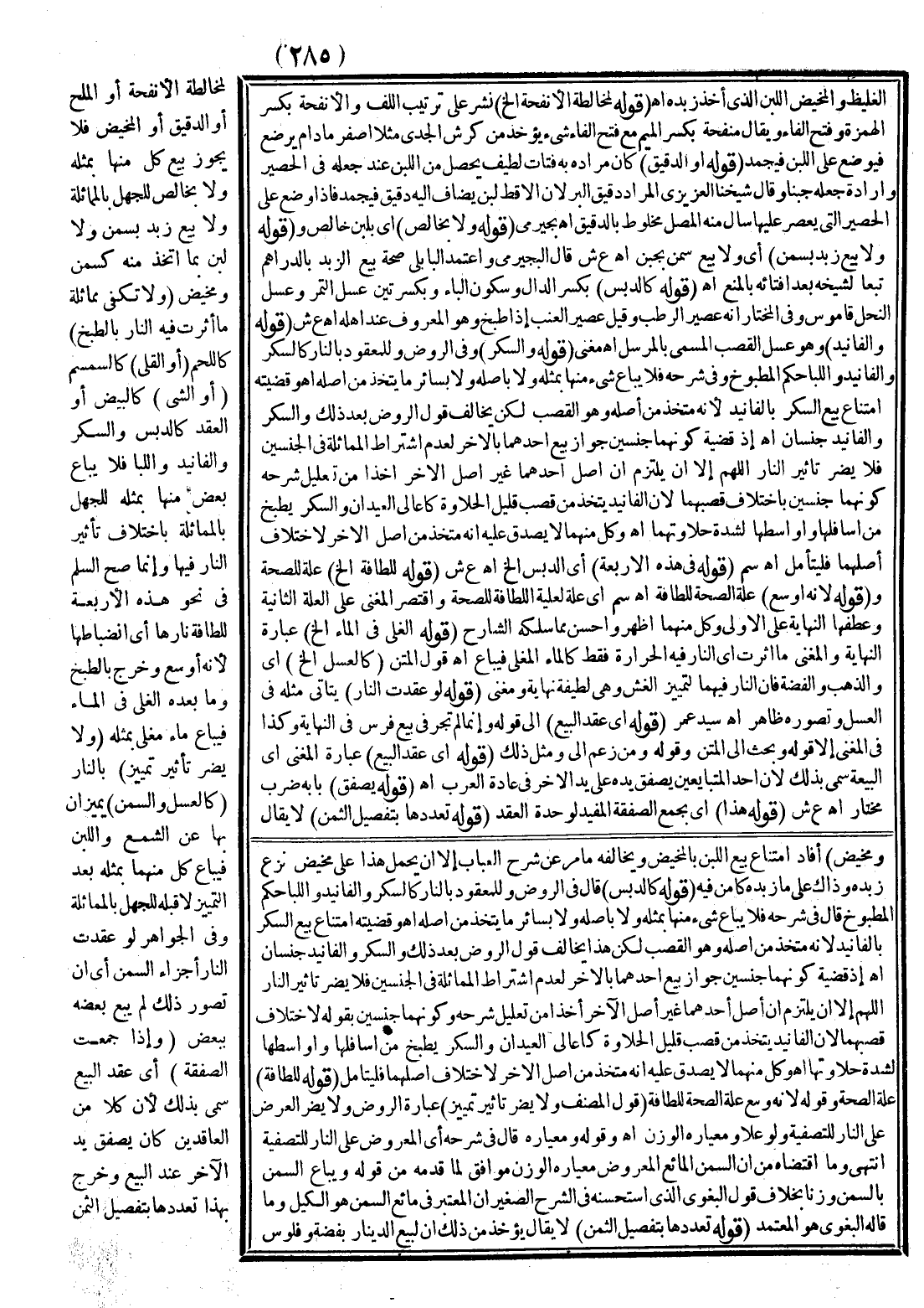 (تَنْبِيهٌ) يُؤْخَذُ مِنْ كَلَامِهِمَا الْمَذْكُورِ أَنَّ مَحَلَّ امْتِنَاعِ بَيْعِ الشَّيْءِ بِمَا اُتُّخِذَ مِنْهُ مَا لَمْ يَكُونَا كَامِلَيْنِ أَوْ يَفْرُطْ التَّفَاوُتُ بَيْنَهُمَا فِيمَا ذُكِرَ (وَ) تُعْتَبَرُ (فِي اللَّبَنِ) أَيْ فِي مَاهِيَّةِ هَذَا الْجِنْسِ الْمُشْتَمِلِ عَلَى لَبَنٍ وَغَيْرِهِ (لَبَنًا أَوْ سَمْنًا أَوْ مَخِيضًا) بِشَرْطِ أَنْ يَكُونَ كُلٌّ مِنْهَا (صَافِيًا) مِنْ الْمَاءِ مَثَلًا فَيَجُوزُ بَيْعُ بَعْضِ أَنْوَاعِ اللَّبَنِ الَّذِي لَمْ يُغْلَ بِالنَّارِ بِبَعْضٍ كَيْلًا بَعْدَ سُكُونِ رَغْوَتِهِ وَإِنْ كَانَ الْخَاثِرُ أَثْقَلَ وَزْنًا أَمَّا مَا فِيهِ مَاءٌ فَلَا يُبَاعُ بِمِثْلِهِ وَلَا بِخَالِصٍ وَقَيَّدَهُ السُّبْكِيُّ وَغَيْرُهُ بِغَيْرِ مَاءٍ يَسِيرٍ وَيَظْهَرُ حَمْلُهُ عَلَى يَسِيرٍ لَا يُؤَثِّرُ فِي الْكَيْلِ.