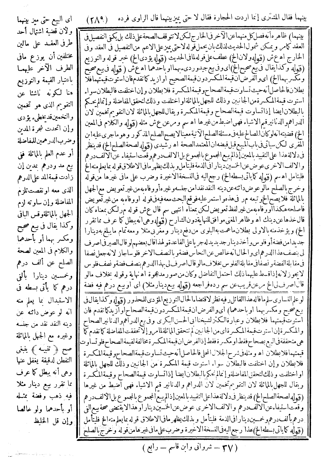 (قَوْلُهُ: كَبَيْعِ ذَاتِ لَبَنٍ إلَخْ) لَعَلَّ مَحَلَّهُ بَعْدَ تَمَيُّزِ اللَّبَنِ عَنْ مَحَلِّهِ وَاسْتِقْرَارِهِ فِي الضَّرْعِ وَلَوْ بِالنِّسْبَةِ لِأَحَدِهِمَا بِخِلَافِ مَا لَوْ خَلَا ضَرْعُ كُلٍّ مِنْهُمَا عَنْ اللَّبَنِ حَالَةَ الْعَقْدِ لِأَنَّ كُمُونَ اللَّبَنِ حِينَئِذٍ فِي مَعْدِنِهِ الْأَصْلِيِّ كَكُمُونِ الشَّيْرَجِ فِي السِّمْسِمِ فِي بَيْعِ سِمْسِمٍ بِمِثْلِهِ ثُمَّ رَأَيْت قَوْلَ الْمُغْنِي وَالنِّهَايَةِ الْآتِي آخِرَ الْبَابِ فِي بَيْعِ لَبَنِ شَاةٍ بِشَاةٍ فِيهَا لَبَنٌ اهـ سَيِّدٌ عُمَرُ أَقُولُ وَكَذَا تَعْلِيلُهُمَا الْآتِي ذِكْرُهُ آنِفًا يُفِيدُ مَا تَرَجَّاهُ (قَوْلُهُ: لِأَنَّهُ يُقْصَدُ مِنْهَا إلَخْ) عِبَارَةُ النِّهَايَةِ وَالْمُغْنِي لِأَنَّ الشَّرْعَ جَعَلَ اللَّبَنَ فِي الضَّرْعِ كَهُوَ فِي الْإِنَاءِ بِخِلَافِ الْمَعْدِنِ لِأَنَّ ذَاتَ اللَّبَنِ الْمَقْصُودُ مِنْهَا اللَّبَنُ وَالْأَرْضُ لَيْسَ الْمَقْصُودُ مِنْهَا الْمَعْدِنَ اهـ قَالَ ع ش قَوْلُهُ: م ر الْمَقْصُودُ مِنْهَا إلَخْ أَيْ فَأَثَّرَ سَوَاءٌ عَلِمَاهُ أَوْ جَهِلَاهُ اهـ (قَوْلُهُ: وَإِنَّمَا لَمْ تَجْرِ فِي بَيْعِ فَرَسٍ إلَخْ) عُمُومُ كَلَامِ الشَّارِحِ م ر أَيْ وَالْمُغْنِي يُخَالِفُهُ اهـ ع ش (قَوْلُهُ: أَيْ جِنْسُ الْمَبِيعِ) إلَى قَوْلِ الْمَتْنِ كَصِحَاحٍ فِي النِّهَايَةِ إلَّا قَوْلَهُ وَقَدَّرَ إلَى الْمَتْنِ وَقَوْلُهُ: بِشَرْطٍ إلَى أَمْ صِفَةٌ وَكَذَا فِي الْمُغْنِي إلَّا قَوْلَهُ فَإِنْ كَانَ الثَّمَنُ إلَى الْمَتْنِ (قَوْلُهُ: أَيْ جِنْسُ الْمَبِيعِ) أَيْ الْمَعْقُودِ عَلَيْهِ (قَوْلُهُ: وَقَدَّرَ) لَعَلَّهُ مُحَرَّفٌ عَنْ قَيَّدَ بِالْيَاءِ وَالدَّالِ، قَوْلُ الْمَتْنِ (كَمُدِّ عَجْوَةٍ) قَالَ الْجَوْهَرِيُّ هُوَ تَمْرٌ مِنْ أَجْوَدِ تَمْرِ الْمَدِينَةِ قَالَ الْأَزْهَرِيُّ وَالصَّيْحَانِيُّ مِنْهُ سم عَلَى الْمَنْهَجِ اهـ ع ش (قَوْلُهُ: عَجْوَةً) بَعْدَ قَوْلِ الْمَتْنِ بِمُدٍّ يُقْرَأُ بِالنَّصْبِ إبْقَاءً لِتَنْوِينِ الْمَتْنِ اهـ رَشِيدِيٌّ (قَوْلُهُ: وَمَا يُقَابِلُهُ إلَخْ) يَعْنِي مَاءَ عَيْنٍ بِالتَّرَاضِي مِنْهُمَا بِاعْتِبَارِ الْقِيمَةِ بَعْدَ الْعَقْدِ اهـ ع ش (قَوْلُهُ: وَبِقَوْلِنَا إلَخْ) مُتَعَلِّقٌ بِانْدَفَعَ (وَقَوْلُهُ: بِالتَّنْكِيرِ) أَيْ لِرِبَوِيٍّ اهـ كُرْدِيٌّ (قَوْلُهُ: مِنْ بَيْعِ ذَهَبٍ إلَخْ) أَيْ مِنْ صِحَّةِ هَذَا الْبَيْعِ (قَوْلُهُ: فَإِنَّهُ إلَخْ) تَوْجِيهٌ لِلِانْدِفَاعِ الْمَذْكُورِ.