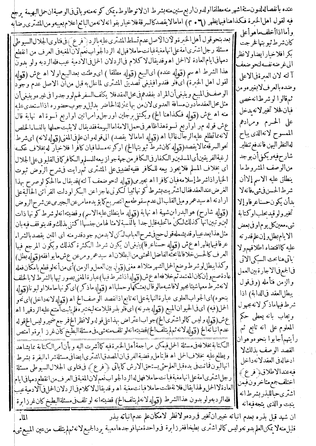 قَالَ جَمْعٌ: وَمَحَلُّهُ إنْ كَانَ تَأْكُلُ بِالْفَوْقِيَّةِ لِأَنَّ هَذَا هُوَ الَّذِي لَا غَرَضَ فِيهِ أَلْبَتَّةَ بِخِلَافِهِ بِالتَّحْتِيَّةِ لِاخْتِلَافِ الْأَغْرَاضِ حِينَئِذٍ فَيَفْسُدُ بِهِ الْعَقْدُ اهـ وَالصَّحِيحُ أَنَّهُ لَا فَرْقَ إذْ لَا غَرَضَ لِلْبَائِعِ بَعْدَ خُرُوجِهِ مِنْ مِلْكِهِ فِي تَعْيِينِ غِذَاءٍ مَعَ أَنَّهُ يَحْصُلُ الْوَاجِبُ عَلَيْهِ مِنْ إطْعَامِهِ وَمِنْ ثَمَّ لَوْ شَرَطَ مَا لَا يَلْزَمُ أَصْلًا كَجَمْعِهِ بَيْنَ أُدْمَيْنِ أَوْ صَلَاتِهِ لِلنَّوَافِلِ وَكَذَا لِلْفَرْضِ أَوَّلَ وَقْتِهِ فَسَدَ الْعَقْدُ كَبَيْعِ سَيْفٍ بِشَرْطِ أَنْ يَقْطَعَ بِهِ الطَّرِيقَ بِخِلَافِ بَيْعِ ثَوْبِ حَرِيرٍ بِشَرْطِ لُبْسِهِ مِنْ غَيْرِ زِيَادَةٍ عَلَى ذَلِكَ لِأَنَّهُ لَمْ تَتَحَقَّقْ الْمَعْصِيَةُ فِيهِ لِجَوَازِهِ لِأَعْذَارٍ وَبِهِ يَنْدَفِعُ مَا لِلزَّرْكَشِيِّ هُنَا.
