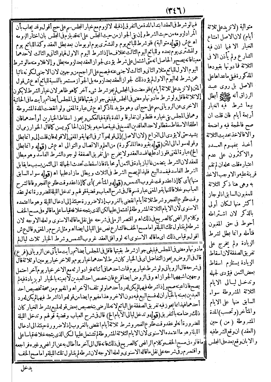 وَذَلِكَ لِأَنَّ الْمَحْذُورَ إضْرَارُ الْمُوَكِّلِ وَهُوَ حَاصِلٌ بِشَرْطِهِ وَسُكُوتِهِ كَمَا هُوَ وَاضِحٌ وَاعْلَمْ أَنَّ خِيَارَ الْمَجْلِسِ وَالشَّرْطِ مُتَلَازِمَانِ غَالِبًا قَدْ يَثْبُتُ ذَاكَ لَا هَذَا وَلَا عَكْسَ كَمَا أَفَادَهُ قَوْلُهُ (إلَّا أَنْ يَشْتَرِطَ الْقَبْضَ فِي الْمَجْلِسِ) مِنْ الْجَانِبَيْنِ (كَرِبَوِيٍّ) أَوْ مِنْ أَحَدِهِمَا كَإِجَارَةِ ذِمَّةٍ بِنَاءً عَلَى الضَّعِيفِ أَنَّ خِيَارَ الْمَجْلِسِ يَثْبُتُ فِيهَا (وَسَلَمٍ) لِامْتِنَاعِ التَّأْجِيلِ فِيهِمَا، وَالْخِيَارُ لِمَنْعِهِ الْمِلْكَ أَوْ لُزُومِهِ أَعْظَمُ غَرَرًا مِنْهُ وَلَا يَجُوزُ شَرْطُهُ أَيْضًا فِي شِرَاءِ مَنْ يَعْتِقُ عَلَيْهِ لِلْمُشْتَرِي وَحْدَهُ لِاسْتِلْزَامِهِ الْمِلْكَ لَهُ الْمُسْتَلْزِمَ لِعِتْقِهِ الْمَانِعَ مِنْ الْخِيَارِ وَمَا أَدَّى ثُبُوتُهُ لِعَدَمِهِ كَانَ بَاطِلًا مِنْ أَصْلِهِ بِخِلَافِ شَرْطِهِ لَهُمَا لِوَقْفِهِ أَوْ لِلْبَائِعِ لِأَنَّ الْمِلْكَ لَهُ كَمَا يَأْتِي وَلَا فِي الْبَيْعِ الضِّمْنِيِّ وَلَا فِيمَا يَتَسَارَعُ إلَيْهِ الْفَسَادُ فِي الْمُدَّةِ الْمَشْرُوطَةِ لِأَنَّ قَضِيَّةَ الْخِيَارِ التَّوَقُّفُ عَنْ التَّصَرُّفِ فِيهِ فَيُؤَدِّي لِضَيَاعِ مَالِيَّتِهِ وَلَا ثَلَاثًا لِلْبَائِعِ فِي الْمُصَرَّاةِ لِأَدَائِهِ لِمَنْعِ الْحَلْبِ الْمُضِرِّ بِهَا، وَطَرْدُ الْأَذْرَعِيِّ لَهُ فِي كُلِّ حَلُوبٍ يُرَدُّ بِأَنَّهُ لَا دَاعِيَ هُنَا لِعَدَمِ الْحَلْبِ بِخِلَافِهِ ثَمَّ فَإِنَّ تَرْوِيجَهُ لِلتَّصْرِيَةِ الَّتِي قَصَدَهَا بِمَنْعِهِ مِنْ الْحَلْبِ وَإِنْ كَانَ اللَّبَنُ مِلْكَهُ وَيَظْهَرُ أَنَّ شَرْطَهُ فِيهَا لَهُمَا كَذَلِكَ وَأَنَّ مِثْلَ الثَّلَاثِ مَا قَارَبَهَا مِمَّا مِنْ شَأْنِهِ أَنْ يَضُرَّ بِهَا فَإِنْ قُلْتَ كَيْفَ يَعْلَمُ الْمُشْتَرِي تَصْرِيَتَهَا حَتَّى يَمْتَنِعَ عَلَيْهِ شَرْطُ ذَلِكَ لِلْبَائِعِ أَوْ يُوَافِقُهُ عَلَيْهِ قُلْت يُحْمَلُ ذَلِكَ عَلَى مَا إذَا ظَنَّ التَّصْرِيَةَ وَلَمْ يَتَحَقَّقْهَا أَوْ الْمُرَادُ أَنَّ إثْمَ ذَلِكَ يَخْتَصُّ بِالْبَائِعِ أَوْ أَنَّ بِظُهُورِ التَّصْرِيَةِ يَتَبَيَّنُ فَسَادُ الْخِيَارِ وَمَا يَتَرَتَّبُ عَلَيْهِ مِنْ فَسْخٍ أَوْ إجَازَةٍ وَلَوْ تَكَرَّرَ بَيْعُ كَافِرٍ لِقِنِّهِ الْمُسْلِمِ بِشَرْطِ الْخِيَارِ