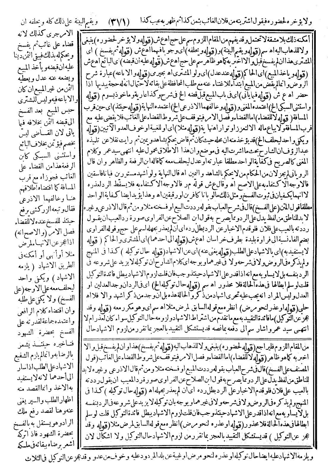 وَلَا يُؤْمَرُ بِعَدْوٍ وَلَا رَكْضٍ (فَلَوْ عَلِمَهُ وَهُوَ يُصَلِّي) وَلَوْ نَفْلًا (أَوْ) وَهُوَ (يَأْكُلُ) وَلَوْ تَفَكُّهًا فِيمَا يَظْهَرُ أَوْ وَهُوَ فِي نَحْوِ حَمَّامٍ أَوْ خَلَاءٍ أَوْ قَبْلَ ذَلِكَ وَقَدْ دَخَلَ وَقْتُهُ (فَلَهُ) الشُّرُوعُ فِيهِ عَقِبَ ذَلِكَ وَإِلَّا بَطَلَ رَدُّهُ كَمَا أَفْهَمَهُ قَوْلُهُمْ لَوْ عَلِمَهُ وَقَدْ دَخَلَ وَقْتُ هَذِهِ الْأُمُورِ وَاشْتَغَلَ بِهَا وَبَعْدَ شُرُوعِهِ فِيهِ لَهُ (تَأْخِيرُهُ) أَيْ الرَّدِّ (حَتَّى يَفْرُغَ) مِنْ ذَلِكَ عَلَى وَجْهِهِ الْكَامِلِ لِعُذْرٍ كَالشُّفْعَةِ وَلِأَجْلِ ذَلِكَ أُجْرِيَ هُنَا مَا قَالُوهُ ثَمَّ وَعَكْسُهُ وَلَا يَضُرُّ سَلَامُهُ عَلَى الْبَائِعِ بِخِلَافِ مُحَادَثَتِهِ وَلَا لُبْسُ مَا يَتَجَمَّلُ بِهِ وَلَا التَّأْخِيرُ لِنَحْوِ مَطَرٍ شَدِيدٍ عَلَى الْأَوْجَهِ وَيَظْهَرُ أَنَّهُ يَكْفِي مَا يَبُلُّ الثَّوْبَ (أَوْ) عَلِمَهُ (لَيْلًا فَ) لَهُ التَّأْخِيرُ (حَتَّى يُصْبِحَ) لِعُذْرِهِ بِكُلْفَةِ السَّيْرِ فِيهِ وَمِنْ ثَمَّ لَوْ أَمْكَنَهُ السَّيْرُ فِيهِ مِنْ غَيْرِ كُلْفَةٍ لَزِمَهُ (فَإِنْ كَانَ الْبَائِعُ بِالْبَلَدِ رَدَّهُ) الْمُشْتَرِي (عَلَيْهِ بِنَفْسِهِ أَوْ وَكِيلِهِ) مَا لَمْ يَحْصُلْ بِالتَّوْكِيلِ تَأْخِيرٌ مُضِرٌّ وَلِوَلِيِّ الْمُشْتَرِي وَوَارِثِهِ الرَّدُّ أَيْضًا كَمَا هُوَ ظَاهِرٌ (أَوْ) رَدَّهُ (عَلَى) مُوَكِّلِهِ أَوْ وَارِثِهِ أَوْ وَلِيِّهِ أَوْ (وَكِيلِهِ) بِنَفْسِهِ أَوْ وَكِيلِهِ كَمَا أَفَادَهُ سِيَاقُهُ فَسَاوَتْ عِبَارَتُهُ عِبَارَةَ أَصْلِهِ خِلَافًا لِمَنْ فَرَّقَ وَذَلِكَ لِأَنَّهُ قَائِمٌ مَقَامَهُ (وَلَوْ تَرَكَهُ) أَيْ الْمُشْتَرِي أَوْ وَكِيلُهُ مَنْ ذُكِرَ مِنْ الْبَائِعِ وَوَكِيلِهِ الْحَاضِرَيْنِ (وَرَفَعَ الْأَمْرَ إلَى الْحَاكِمِ فَهُوَ آكَدُ) فِي الرَّدِّ لِأَنَّهُ رُبَّمَا أَحْوَجَهُ إلَى الرَّفْعِ إلَيْهِ