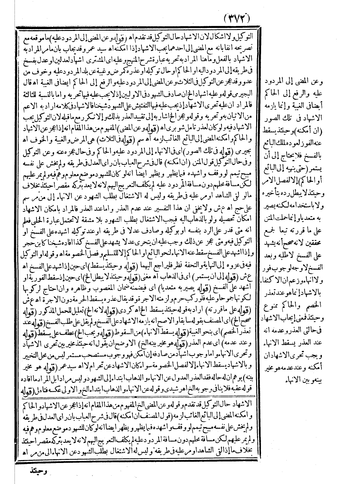 (قَوْلُهُ: عَلَى أَنَّ مَحَلَّهُ لَا يَخْلُو غَالِبًا عَنْ شُهُودٍ) فَقَدْ قَالَ فِي الْأَنْوَارِ وَلَوْ اطَّلَعَ عَلَيْهِ فِي مَجْلِسِ الْحُكْمِ فَخَرَجَ إلَى الْبَائِعِ وَلَمْ يَفْسَخْ بَطَلَ حَقُّهُ وَلَوْ اطَّلَعَ بِحَضْرَةِ الْبَائِعِ فَتَرَكَهُ وَرَفَعَ إلَى الْقَاضِي لَمْ يَبْطُلْ كَمَا فِي الشُّفْعَةِ قَالَ فِي الْإِسْعَادِ وَإِنَّمَا يُخَيَّرُ بَيْنَ الْخَصْمِ وَالْحَاكِمِ إنْ كَانَا حَاضِرَيْنِ بِالْبَلَدِ فَإِنْ كَانَ أَحَدُهُمَا غَائِبًا تَعَيَّنَ الْحَاضِرُ كَمَا فِي شَرْحِ م ر وَقَوْلُهُ: بَطَلَ حَقُّهُ ظَاهِرُهُ وَإِنْ خَلَا مَجْلِسُ الْحُكْمِ عَنْ الشُّهُودِ وَأَمْكَنَهُ الْخُرُوجُ مِنْهُ وَالْإِشْهَادُ خَارِجَهُ عَلَى الْفَسْخِ م ر اهـ سم أَيْ وَيُوَجَّهُ بِمَا مَرَّ مِنْ أَنَّهُ يَصِيرُ شَاهِدًا لَهُ إلَخْ وَيَظْهَرُ أَنَّ مَحَلَّ بُطْلَانِ حَقِّهِ بِذَلِكَ إذَا كَانَ الْقَاضِي لَا يَأْخُذُ شَيْئًا مِنْ الْمَالِ وَإِنْ قَلَّ وَإِلَّا فَلَا يَكُونُ عُدُولُهُ إلَى الْبَائِعِ مُسْقِطًا لِلرَّدِّ اهـ ع ش. قَوْلُ الْمَتْنِ (وَإِنْ كَانَ غَائِبًا) سَوَاءٌ كَانَتْ الْمَسَافَةُ قَرِيبَةً أَمْ بَعِيدَةً اهـ مُغْنِي وَفِي ع ش مَا نَصُّهُ أَلْحَقَ فِي الذَّخَائِرِ الْحَاضِرَ بِالْبَلَدِ إذَا خِيفَ هَرَبُهُ بِالْغَائِبِ عَنْهَا انْتَهَى شَرْحُ الرَّوْضِ اهـ. قَوْلُ الْمَتْنِ (رَفَعَ إلَى الْحَاكِمِ) بَقِيَ مَا لَوْ كَانَ غَائِبًا وَلَا وَكِيلَ لَهُ بِالْبَلَدِ وَلَا حَاكِمَ بِهَا وَلَا شُهُودَ فَهَلْ يَلْزَمُهُ السَّفَرُ إلَيْهِ أَوْ إلَى الْحَاكِمِ إذَا
