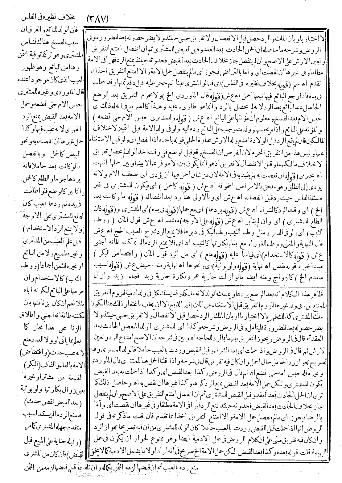 (وَالزِّيَادَةُ) فِي الْمَبِيعِ أَوْ الثَّمَنِ (الْمُتَّصِلَةُ كَالسِّمَنِ) وَكِبَرِ الشَّجَرَةِ وَتَعَلُّمِ الصَّنْعَةِ وَلَوْ بِمُعَلِّمٍ بِأُجْرَةٍ كَمَا اقْتَضَاهُ إطْلَاقُهُمْ هُنَا لَكِنَّهُمْ فِي الْفَلْسِ قَيَّدُوهُ بِصَنْعَةٍ بِلَا مُعَلِّمٍ فَيُحْتَمَلُ أَنْ يُقَالَ بِهِ هُنَا بِجَامِعِ أَنَّ الْمُشْتَرِيَ غَرِمَ مَالًا فِي كُلٍّ مِنْهُمَا فَلَا يَفُوتُ عَلَيْهِ وَلَا يُنَافِيهِ الْفَرْقُ الْآتِي بَيْنَهُمَا فِي الْحَمْلِ لِأَنَّ مِنْ شَأْنِهِ أَنَّهُ لَا يُغْرَمُ مَالٌ فِي مُقَابَلَتِهِ فَحُكِمَ بِهِ لِمَنْ لَمْ يَنْشَأْ الرَّدُّ عَنْهُ (تَتْبَعُ الْأَصْلَ) لِتَعَذُّرِ إفْرَادِهَا وَلَوْ بَاعَ أَرْضًا بِهَا أُصُولُ نَحْوِ كُرَّاثٍ فَنَبَتَتْ ثُمَّ رَدَّهَا بِعَيْبٍ فَالنَّابِتُ لِلْمُشْتَرِي بِخِلَافِ الصُّوفِ الْحَادِثِ بَعْدَ الْعَقْدِ فَإِنَّهُ يَرُدُّهُ تَبَعًا مَا لَمْ يُجَزَّ وَكَذَا اللَّبَنُ الْحَادِثُ فِي الضَّرْعِ لِأَنَّهُمَا كَالسِّمَنِ بِخِلَافِ تِلْكَ وَمِنْ ثَمَّ كَانَ الظَّاهِرُ مِنْهُمَا فِي ابْتِدَاءِ الْبَيْعِ لَا يَدْخُلُ فِيهِ وَجَرَى جَمْعٌ عَلَى أَنَّ نَحْوَ الصُّوفِ الْحَادِثِ لِلْمُشْتَرِي مُطْلَقًا وَلَوْ جُزَّ بَعْدَ أَنْ طَالَ ثُمَّ عَلِمَ عَيْبًا وَرَدَّ اشْتَرَكَا فِيهِ لِأَنَّ الْمَوْجُودَ عِنْدَ الْعَقْدِ جُزْءٌ مِنْ الْمَبِيعِ فَيُرَدُّ وَإِنْ جُزَّ وَقِيَاسُ نَظَائِرِهِ أَنَّهُ يُصَدَّقُ ذُو الْيَدِ حَيْثُ لَا بَيِّنَةَ وَأَنَّهُ لَا رَدَّ مَا دَامَا مُتَنَازِعَيْنِ وَأَنَّ ذَلِكَ عَيْبٌ حَادِثٌ وَعَلَى هَذَا يُحْمَلُ قَوْلُ السُّبْكِيّ وَقَدْ يَقَعُ نِزَاعٌ فِي مِقْدَارِ مَا لِكُلٍّ مِنْهُمَا وَهُوَ عَيْبٌ مَانِعٌ مِنْ الرَّدِّ