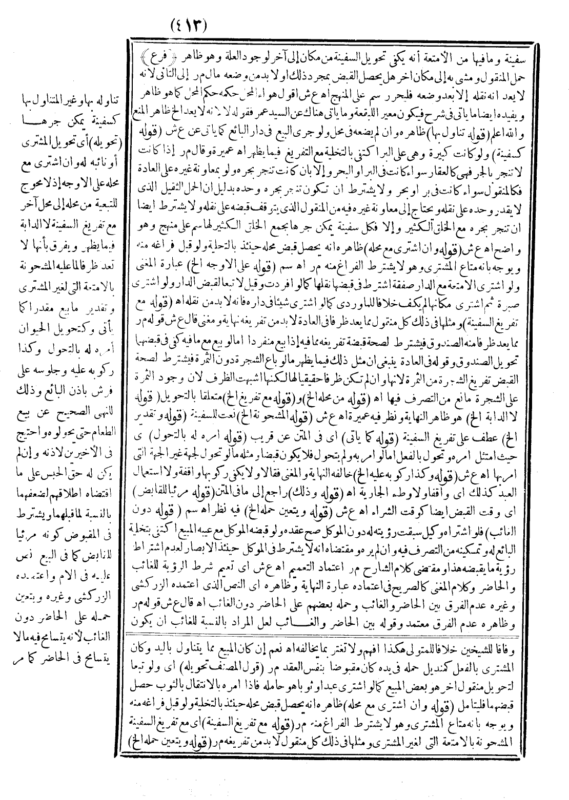 ـــــــــــــــــــــــــــــSذَلِكَ فَلْيُتَأَمَّلْ (قَوْلُهُ: وَدَخَلَ فِي الْبَيْعِ) يَنْبَغِي أَنَّهُ احْتِرَازٌ عَمَّا لَوْ صُرِّحَ بِإِخْرَاجِهِ فَقَطْ، وَإِلَّا فَالظَّاهِرُ دُخُولُهُ عِنْدَ الْإِطْلَاقِ، وَإِنْ كَانَ مَنْقُولًا (قَوْلُهُ: بِشَرْطِ فَرَاغِهِ مِنْ أَمْتِعَةِ غَيْرِ الْمُشْتَرِي) هَلْ يَجْرِي هَذَا الشَّرْطُ فِي الْمَنْقُولِ حَتَّى لَوْ كَانَ الْمَبِيعُ ظَرْفًا كَإِنَاءٍ وَزِنْبِيلٍ مَشْغُولٍ بِأَمْتِعَةٍ غَيْرِ الْمُشْتَرِي لَمْ يَكْفِ نَقْلُهُ قَبْلَ تَفْرِيغِهِ فِيهِ نَظَرٌ، وَلَا يَبْعُدُ الْجَرَيَانُ، وَإِنْ كَانَ نَقْلُ الْمَنْقُولِ اسْتِيلَاءً حَقِيقِيًّا بِخِلَافِ تَخْلِيَةِ الْعَقَارِ ثُمَّ رَأَيْت قَوْلَهُ الْآتِيَ مَعَ تَفْرِيغِ السَّفِينَةِ وَسَيَأْتِي فِيهِ بَيَانٌ (قَوْلُهُ: لِتَأَتِّي التَّفْرِيغِ إلَخْ) قَدْ يَنْعَكِسُ الْحَالُ فَيَتَأَتَّى التَّفْرِيغُ حَالًّا مِنْ الزَّرْعِ دُونَ الْأَمْتِعَةِ (قَوْلُهُ: كَحَقِيرِ مَتَاعٍ لِغَيْرِهِ) أَيْ: كَحَصِيرٍ وَمَنَارَةٍ، وَخَرَجَ غَيْرُ الْحَقِيرِ، وَمِنْهُ فَصٌّ صَغِيرُ الْجِرْمِ كَثِيرُ الْقِيمَةِ فِي حَقِّ صَغِيرٍ وَيُفَرَّقُ بَيْنَهُ وَبَيْنَ الْحَقِيرِ بِأَنَّهُ لِغُلُوِّهِ يُقْصَدُ حِفْظُهُ فِي الدَّارِ وَإِحْرَازُهُ بِهَا وَالْمَنْعُ عَنْهَا لِأَجْلِهِ فَتُعَدُّ مَشْغُولَةً فَلَا بُدَّ مِنْ التَّفْرِيغِ، وَلَا كَذَلِكَ الْحَقِيرُ فَلْيُتَأَمَّلْ