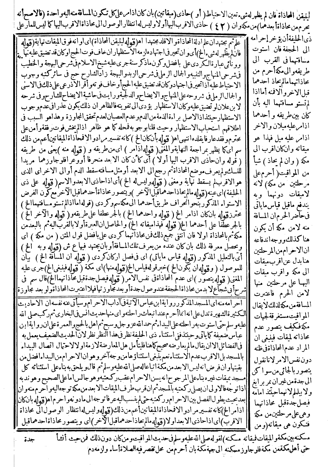 ـــــــــــــــــــــــــــــSإحْرَامِهِ مِنْهُ أَيْ الْمَسْجِدِ الْمَذْكُورِ رِوَايَةَ ابْنِ عَبَّاسٍ الْآتِيَةَ فِي آدَابِ الْإِحْرَامِ وَسَيَأْتِي عَنْهُ نَفْسِهِ أَنَّ الْأَحَادِيثَ الْكَثِيرَةَ الشَّهِيرَةَ تَدُلُّ عَلَى أَنَّهُ إنَّمَا أَحْرَمَ عِنْدَ انْبِعَاثِ رَاحِلَتِهِ أَيْ وَمِنْهَا حَدِيثُ أَنَسٍ فِي الْبُخَارِيِّ «ثُمَّ رَكِبَ - صَلَّى اللَّهُ عَلَيْهِ وَسَلَّمَ - حَتَّى اسْتَوَتْ بِهِ رَاحِلَتُهُ عَلَى الْبَيْدَاءِ ثُمَّ حَمِدَ اللَّهَ عَزَّ وَجَلَّ وَسَبَّحَ ثُمَّ أَهَلَّ بِالْحَجِّ وَالْعُمْرَةِ» عَلَى أَنَّ رِوَايَةَ ابْنِ عَبَّاسٍ ضَعِيفَةٌ كَمَا يَأْتِي وَحِينَئِذٍ فَفِي اسْتِثْنَاءِ ذِي الْحُلَيْفَةِ نَظَرٌ فِي هَذَا النَّظَرِ نَظَرٌ؛ لِأَنَّ الْحَدِيثَ الضَّعِيفَ يُعْمَلُ بِهِ فِي الْفَضَائِلِ إلَّا أَنْ يُقَالَ مَا لَمْ يُعَارِضْهُ صَحِيحٌ كَمَا هُنَا فَلْيُتَأَمَّلْ هَلْ الْمُعَارَضَةُ لَازِمَةٌ أَوْ لَا لِاحْتِمَالِ اتِّصَالِ الْبَيْدَاءِ بِالْمَسْجِدِ، بَلْ الْأَقْرَبُ عَدَمُ الِاسْتِثْنَاءِ نَعَمْ يَنْبَغِي اسْتِثْنَاؤُهَا مِنْ وَجْهٍ آخَرَ، وَهُوَ أَنَّ الْإِحْرَامَ مِنْ الْبَيْدَاءِ أَفْضَلُ مِنْ بَقِيَّتِهَا، وَإِنْ فُرِضَ أَنَّهُ لَيْسَ الْأَبْعَدَ مِنْ مَكَّةَ اتِّبَاعًا لَهُ - صَلَّى اللَّهُ عَلَيْهِ وَسَلَّمَ - ثُمَّ قَالَ وَيُلْحَقُ بِهِ بِنَاءً عَلَى اسْتِثْنَائِهِ كُلُّ مَسْجِدٍ بِمِيقَاتِ غَيْرِهِ بِنَاءً عَلَى الْمَرْجُوحِ أَنَّهُ يُسَنُّ الْإِحْرَامُ عَقِبَ رَكْعَتَيْهِ، وَهُوَ جَالِسٌ أَمَّا عَلَى الصَّحِيحِ، وَهُوَ نَدْبُهُ إذَا تَوَجَّهَ فَالْأَوْلَى أَنْ يُصَلِّيَ رَكْعَتَيْهِ بِالْمَسْجِدِ ثُمَّ إنْ قَرُبَ طَرَفُ الْمِيقَاتِ الْأَبْعَدِ مِنْ مَكَّةَ تَوَجَّهَ إلَيْهِ وَأَحْرَمَ مِنْهُ، وَإِنْ بَعُدَ بِحَيْثُ يَطُولُ الْفَصْلُ بَيْنَ الْإِحْرَامِ وَرَكْعَتَيْهِ حَتَّى لَمْ يُنْسَبْ إلَيْهِ عُرْفًا تَوَجَّهَ إلَى مَا دُونِهِ وَأَحْرَمَ اهـ.