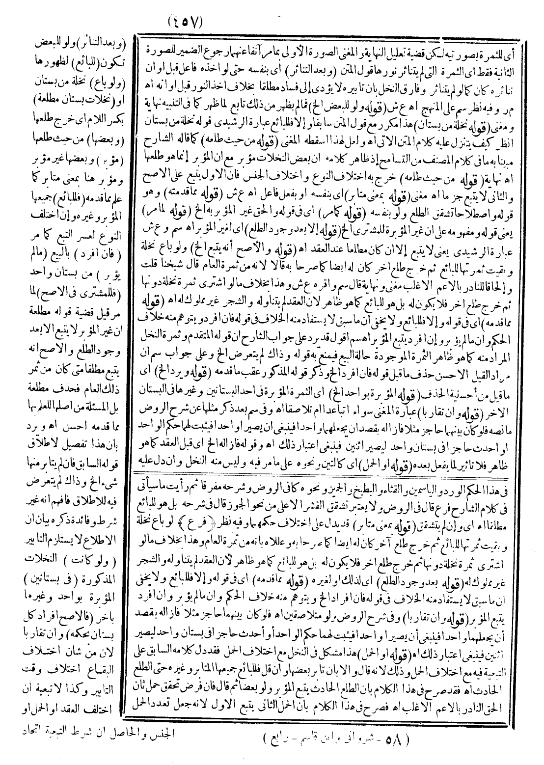 (وَثَمَرَةُ النَّخْلِ) مَثَلًا وَذُكِرَ؛ لِأَنَّهُ مَوْرِدُ النَّصِّ (الْمَبِيعِ) بَعْدَ وُجُودِهَا وَكَالْبَيْعِ غَيْرُهُ عَلَى مَا يَأْتِي فِي أَبْوَابِهِ مُفَصَّلًا (إنْ شُرِطَتْ) كُلُّهَا أَوْ بَعْضُهَا الْمُعَيَّنُ كَالرُّبْعِ (لِلْبَائِعِ أَوْ لِلْمُشْتَرِي عُمِلَ بِهِ) تَأَبَّرَ أَمْ لَا، وَكَذَا لَوْ شُرِطَ الظَّاهِرُ لِلْمُشْتَرِي وَغَيْرُهُ، وَقَدْ انْعَقَدَ لِلْبَائِعِ وَفَاءً بِالشَّرْطِ وَإِنَّمَا بَطَلَ الْبَيْعُ بِشَرْطِ اسْتِثْنَاءِ الْبَائِعِ الْحَمْلَ، أَوْ مَنْفَعَةَ شَهْرٍ لِنَفْسِهِ؛ لِأَنَّ الْحَمْلَ لَا يُفْرَدُ بِالْبَيْعِ، وَالطَّلْعُ يُفْرَدُ بِهِ وَلِأَنَّ عَدَمَ الْمَنْفَعَةِ يُؤَدِّي لِخُلُوِّ الْمَبِيعِ عَنْهَا، وَهُوَ مُبْطِلٌ (وَإِلَّا) يُشْرَطُ شَيْءٌ (فَإِنْ لَمْ يَتَأَبَّرْ مِنْهَا شَيْءٌ فَهِيَ لِلْمُشْتَرِي) ، وَإِنْ كَانَ طَلْعَ ذَكَرٍ (وَإِلَّا) بِأَنْ تَأَبَّرَ بَعْضُهَا، وَإِنْ قَلَّ، وَلَوْ فِي غَيْرِ وَقْتِهِ كَمَا اقْتَضَاهُ إطْلَاقُهُمْ خِلَافًا لِلْمَاوَرْدِيِّ، وَإِنْ تَبِعَهُ ابْنُ الرِّفْعَةِ (فَلِلْبَائِعِ) جَمِيعُهَا الْمُتَأَبِّرُ وَغَيْرُهُ حَتَّى الطَّلْعُ الْحَادِثُ بَعْدُ خِلَافًا لِابْنِ أَبِي هُرَيْرَةَ وَذَلِكَ لِحَدِيثِ الشَّيْخَيْنِ «مَنْ بَاعَ نَخْلًا قَدْ أُبِّرَتْ فَثَمَرَتُهَا لِلْبَائِعِ إلَّا أَنْ يَشْتَرِطَهَا الْمُبْتَاعُ» أَيْ: الْمُشْتَرِي دَلَّ مَنْطُوقُهُ عَلَى أَنَّ الْمُؤَبَّرَةَ لِلْبَائِعِ إلَّا أَنْ يَشْتَرِطَهَا الْمُشْتَرِي وَمَفْهُومُهُ عَلَى أَنَّ غَيْرَ الْمُؤَبَّرَةِ لِلْمُشْتَرِي إلَّا أَنْ يَشْتَرِطَهَا الْبَائِعُ وَكَوْنُهَا لِوَاحِدٍ مِمَّنْ ذُكِرَ صَادِقٌ بِأَنْ تُشْرَطَ لَهُ، أَوْ يَسْكُتَ عَنْ ذَلِكَ كَمَا عُلِمَ مِمَّا تَقَرَّرَ