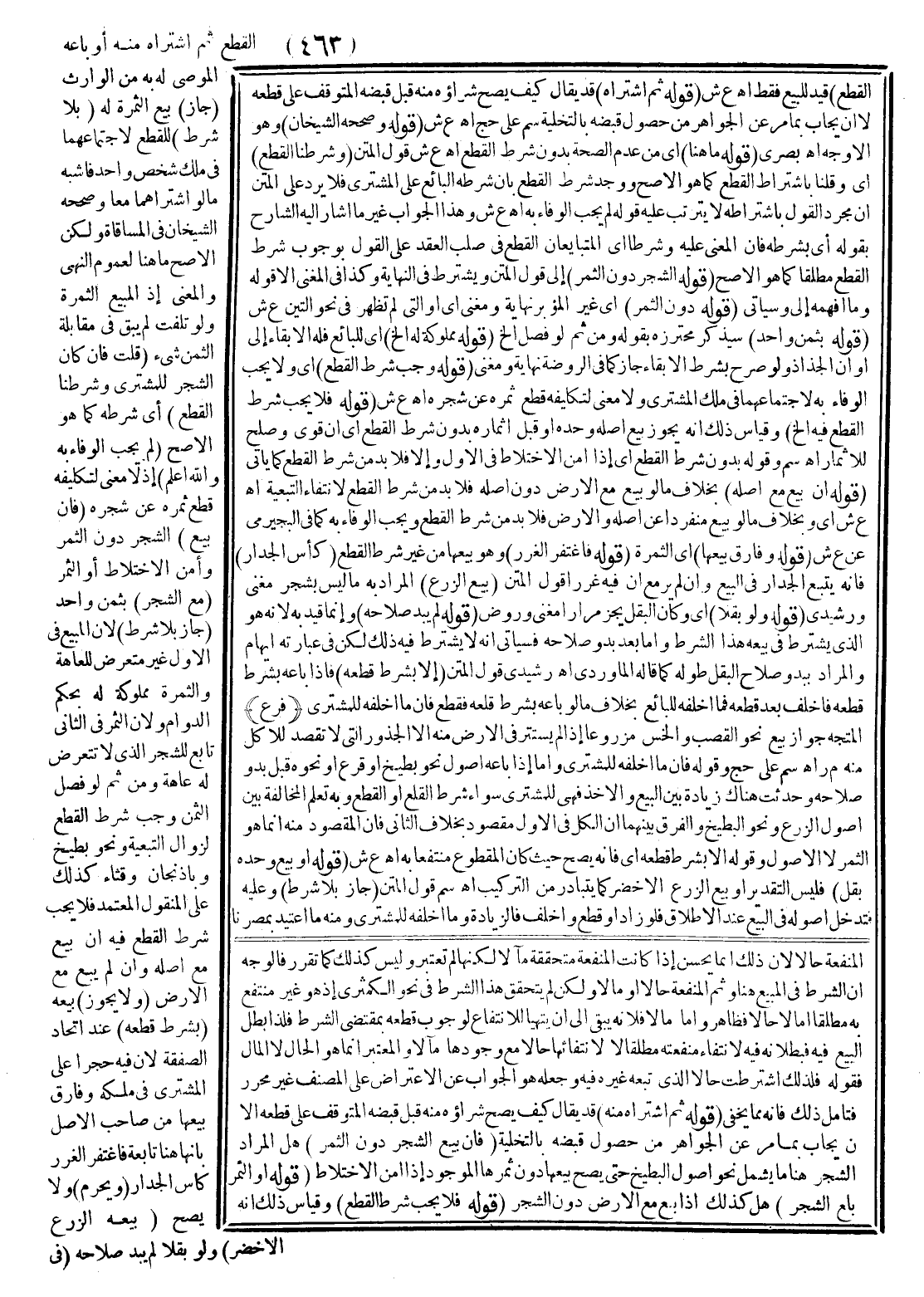 لِلْخَبَرِ الْمُتَّفَقِ عَلَيْهِ «أَنَّهُ - صَلَّى اللَّهُ عَلَيْهِ وَسَلَّمَ - نَهَى الْمُتَبَايِعَيْنِ عَنْ بَيْعِ الثَّمَرَةِ حَتَّى يَبْدُوَ صَلَاحُهَا» وَمَفْهُومُهُ الْجَوَازُ بَعْدَ بُدُوِّهِ فِي الْأَحْوَالِ الثَّلَاثَةِ لِأَمْنِ الْعَاهَةِ حِينَئِذٍ غَالِبًا (وَقَبْلَ) بُدُوِّ (الصَّلَاحِ) فِي الْكُلِّ (إنْ بِيعَ) الثَّمَرُ الَّذِي لَمْ يَبْدُ صَلَاحُهُ وَإِنْ بَدَا صَلَاحُ غَيْرِهِ الْمُتَّحِدِ مَعَهُ نَوْعًا وَمَحَلًّا (مُنْفَرِدًا عَنْ الشَّجَرِ) ، وَهُوَ عَلَى شَجَرَةٍ ثَابِتَةٍ (لَا يَجُوزُ) الْبَيْعُ؛ لِأَنَّ الْعَاهَةَ تُسْرِعُ إلَيْهِ حِينَئِذٍ لِضَعْفِهِ فَيَفُوتُ بِتَلَفِهِ الثَّمَنُ مِنْ غَيْرِ مُقَابِلٍ (إلَّا بِشَرْطِ الْقَطْعِ) لِلْكُلِّ حَالًا لِلْخَبَرِ الْمَذْكُورِ فَإِنَّهُ يَدُلُّ بِمَنْطُوقِهِ عَلَى الْمَنْعِ مُطْلَقًا، خَرَجَ الْمَبِيعُ الْمَشْرُوطُ فِيهِ الْقَطْعُ بِالْإِجْمَاعِ فَبَقِيَ مَا عَدَاهُ عَلَى الْأَصْلِ، وَلَا يَقُومُ اعْتِيَادُ الْقَطْعِ مَقَامَ شَرْطِهِ وَلِلْبَائِعِ إجْبَارُهُ عَلَيْهِ وَمَتَى لَمْ يُطَالِبْهُ بِهِ فَلَا أُجْرَةَ لَهُ وَيُوَجَّهُ بِغَلَبَةِ الْمُسَامَحَةِ فِي ذَلِكَ أَمَّا بَيْعُ ثَمَرَةٍ عَلَى شَجَرَةٍ مَقْطُوعَةٍ دُونَهَا فَيَجُوزُ مِنْ غَيْرِ شَرْطِ قَطْعٍ؛ لِأَنَّ الثَّمَرَةَ لَا تَبْقَى عَلَيْهَا فَنَزَلَ ذَلِكَ مَنْزِلَةَ شَرْطِ الْقَطْعِ وَمِثْلُهَا شَجَرَةٌ جَافَّةٌ عَلَيْهَا ثَمَرَةٌ بِيعَتْ دُونَهَا، وَوَرَقُ التُّوتِ قَبْلَ تَنَاهِيهِ كَالثَّمَرِ قَبْلَ بُدُوِّ الصَّلَاحِ وَبَعْدَهُ كَهُوَ بَعْدَهُ، وَخَرَجَ بِقَوْلِهِ: إنْ بِيعَ مَا لَوْ وُهِبَ مَثَلًا فَلَا يَجِبُ شَرْطُ الْقَطْعِ فِيهِ، وَكَذَا الرَّهْنُ كَمَا يَأْتِي قُبَيْلَ بَحْثِ مَنْ اسْتَعَارَ شَيْئًا لِيَرْهَنَهُ وَبِقَوْلِهِ الثَّمَرُ بَيْعُ بَعْضِهِ قَبْلَ بُدُوِّ صَلَاحِهِ، أَوْ بَعْدَهُ لِشَرِيكِهِ، أَوْ غَيْرِهِ شَائِعًا فَيَبْطُلُ