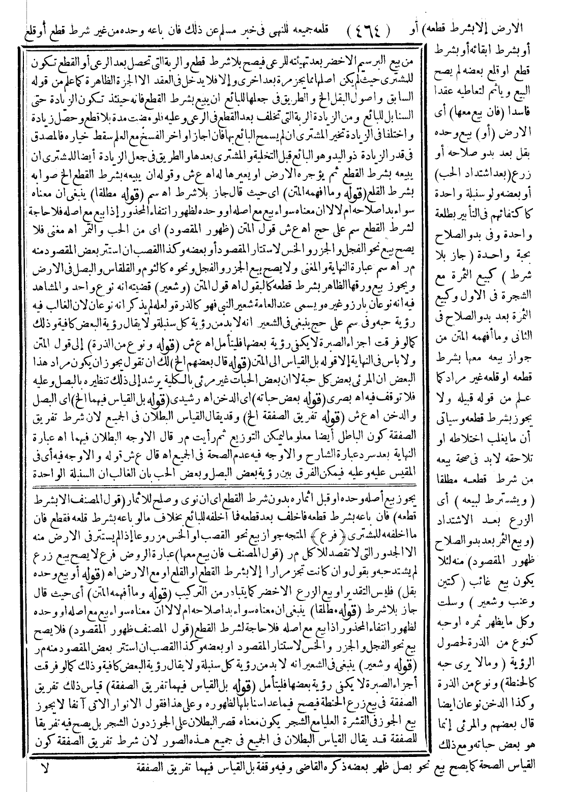 (وَ) يُشْتَرَطُ (أَنْ يَكُونَ الْمَقْطُوعُ مُنْتَفَعًا بِهِ) كَالْحِصْرِمِ وَاللَّوْزِ (لَا كَكُمَّثْرَى) وَجَوْزٍ، وَذَكَرَ هَذَا هُنَا؛ لِأَنَّهُ قَدْ يُغْفَلُ عَنْهُ، وَإِلَّا فَهُوَ مَعْلُومٌ مِمَّا مَرَّ فِي الْبَيْعِ فَإِنْ قُلْت لَا نُسَلِّمُ عِلْمَهُ مِنْهُ؛ لِأَنَّهُ يَكْفِي ثَمَّ الْمَنْفَعَةُ الْمُتَرَقَّبَةُ كَمَا فِي الْجَحْشِ الصَّغِيرِ لَا هُنَا قُلْت إنَّمَا لَمْ يَكْفِ هُنَا لِعَدَمِ تَرَقُّبِهَا مَعَ وُجُودِ شَرْطِ الْقَطْعِ فَلِذَلِكَ اُشْتُرِطَتْ حَالًا وَالْحَاصِلُ أَنَّ الشَّرْطَ هُنَا وَثَمَّ أَنْ يَكُونَ فِيهِ مَنْفَعَةٌ مَقْصُودَةٌ لِغَرَضٍ صَحِيحٍ وَأَمَّا افْتِرَاقُهُمَا فِي كَوْنِ الْمَنْفَعَةِ قَدْ تَتَرَقَّبُ ثَمَّ لَا هُنَا فَغَيْرُ مُؤَثِّرٍ لِلِاسْتِحَالَةِ الَّتِي ذَكَرْنَاهَا فَتَأَمَّلْهُ