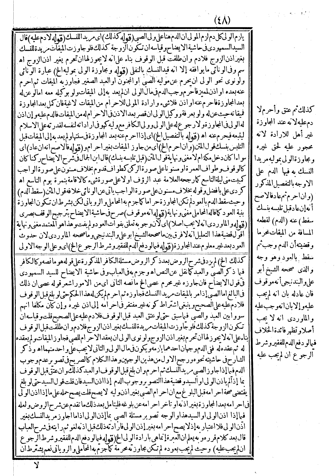 (قَوْلُهُ: لَا دَمَ عَلَيْهِ) قَالَ السَّيِّدُ السَّمْهُودِيُّ فِي حَاشِيَةِ الْإِيضَاحِ وَقِيَاسُهُ أَنْ تَكُونَ الزَّوْجَةُ كَذَلِكَ فَلَوْ جَاوَزَتْ الْمِيقَاتَ مُرِيدَةً لِلنُّسُكِ بِغَيْرِ إذْنِ الزَّوْجِ فَلَا دَمَ، وَإِنْ طَلُقَتْ قَبْلَ الْوُقُوفِ بِنَاءً عَلَى أَنَّهُ لَا يَجُوزُ لَهَا أَنْ تُحْرِمَ بِغَيْرِ إذْنِ الزَّوْجِ انْتَهَى اهـ سم وَفِي الْوَنَائِيِّ مَا يُوَافِقُهُ إلَّا أَنَّهُ قَيَّدَ النُّسُكَ بِالنَّفْلِ.